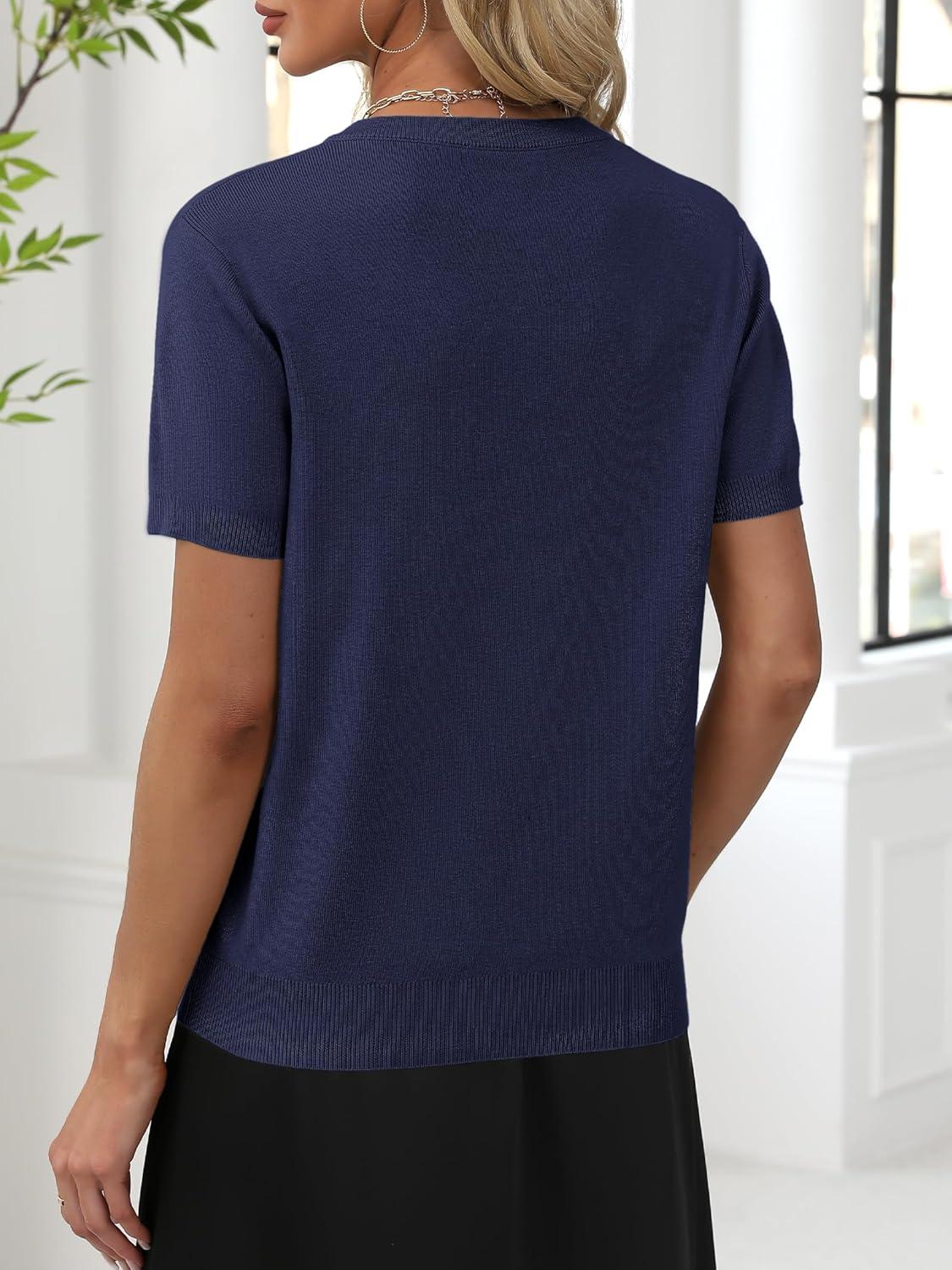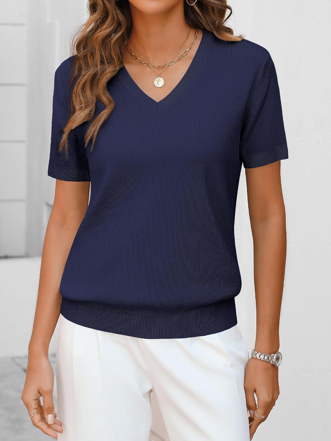 ANRABESS Women Wool Blend Sweater Summer 2025 Short Sleeve V Neck Pullover Top Business Casual Outfit Beach Vacation Clothes(Navy Blue)