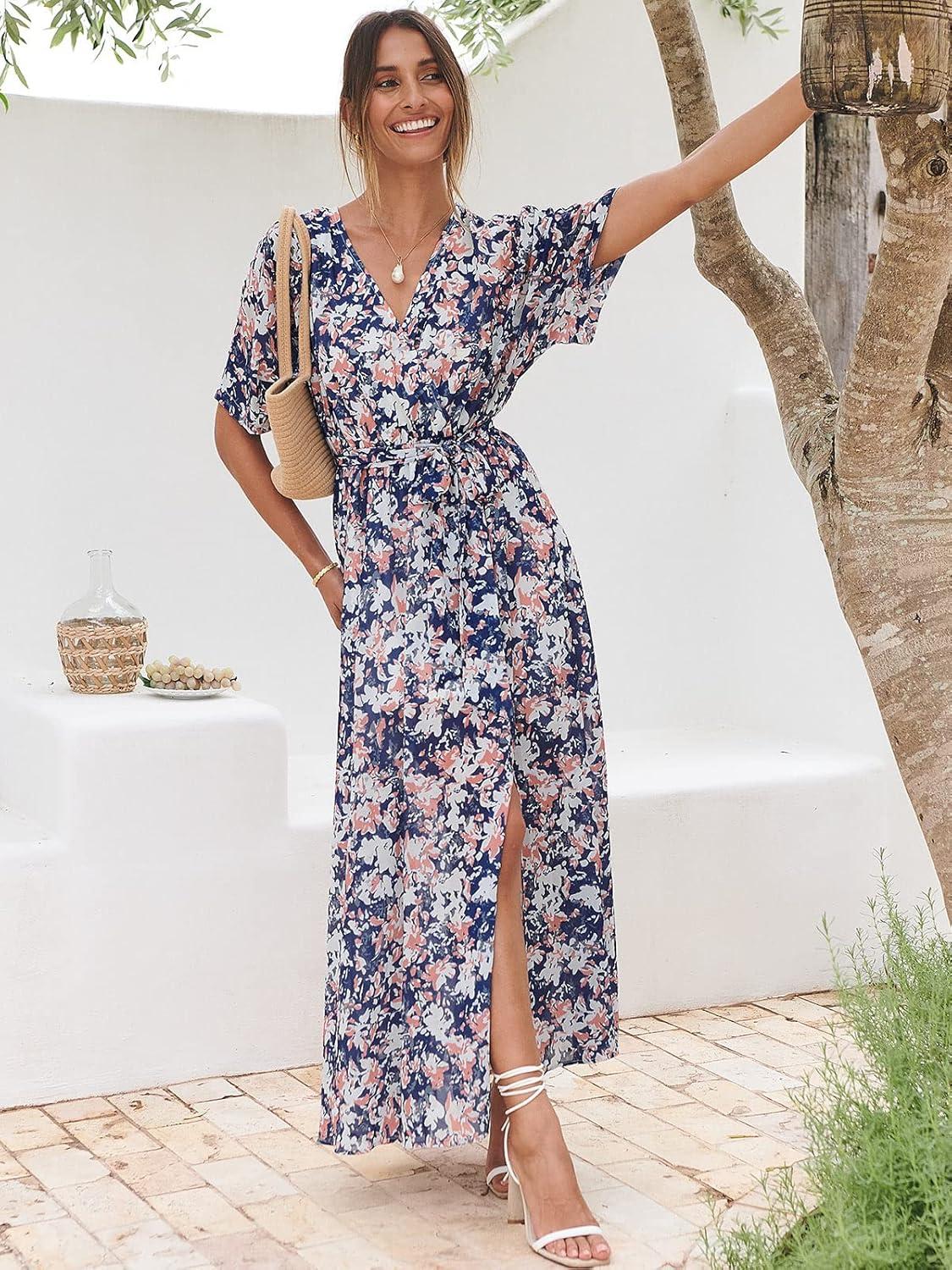 ANRABESS Womens 1/2 Sleeve Beach Wedding Guest Maxi Dresses 2025 Fall Wrap V Neck Boho Floral Flowy Slit Long Summer Dresses(Floral Blue White)