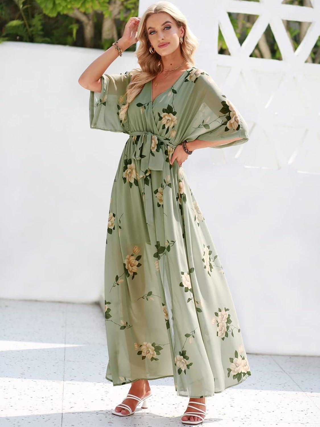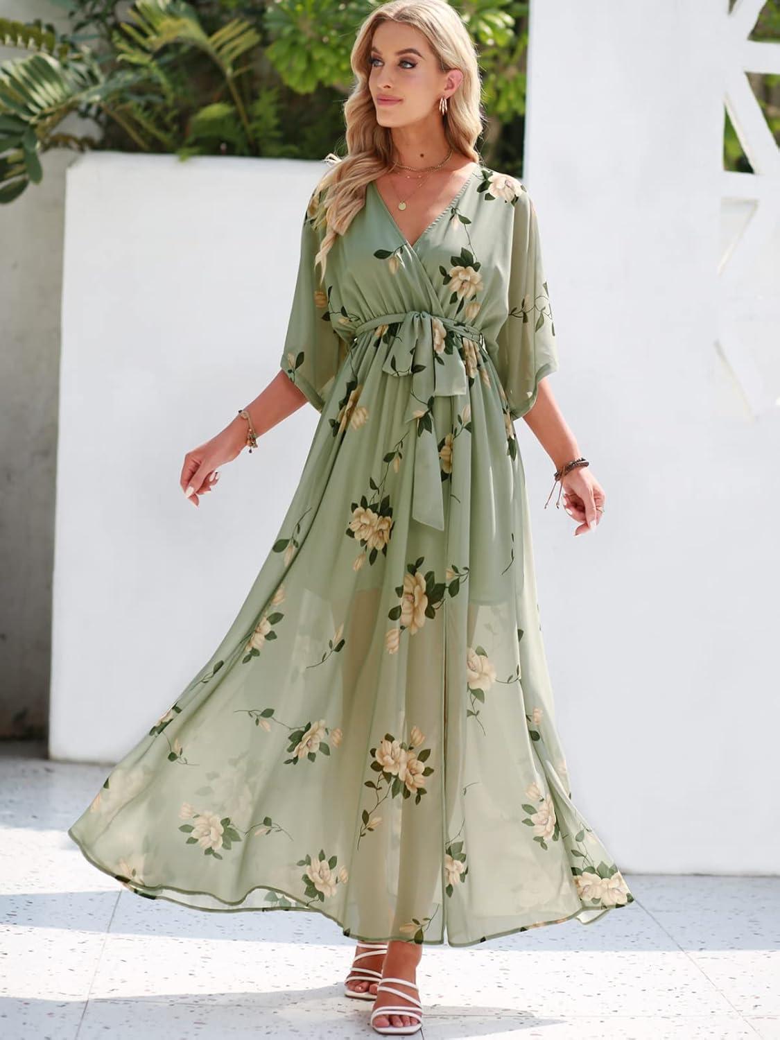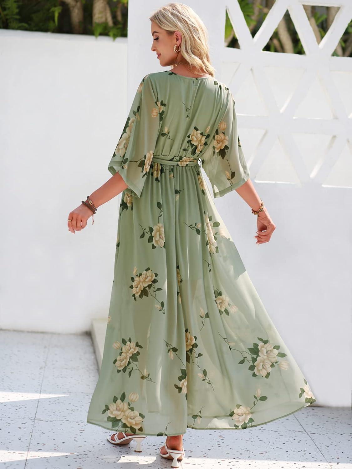 ANRABESS Womens 1/2 Sleeve Beach Wedding Guest Maxi Dresses 2025 Fall Wrap V Neck Boho Floral Flowy Slit Long Summer Dresses(Floral Green)