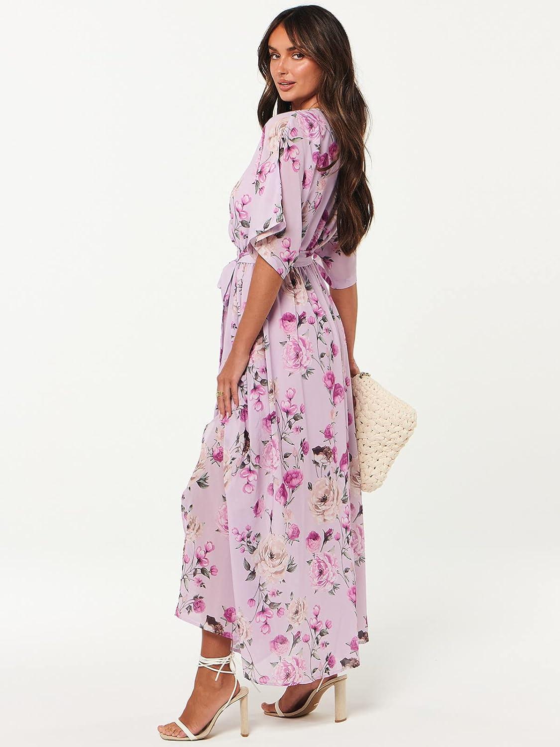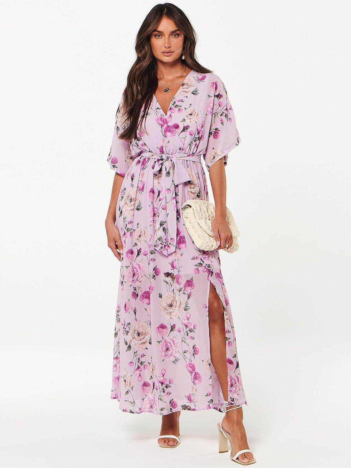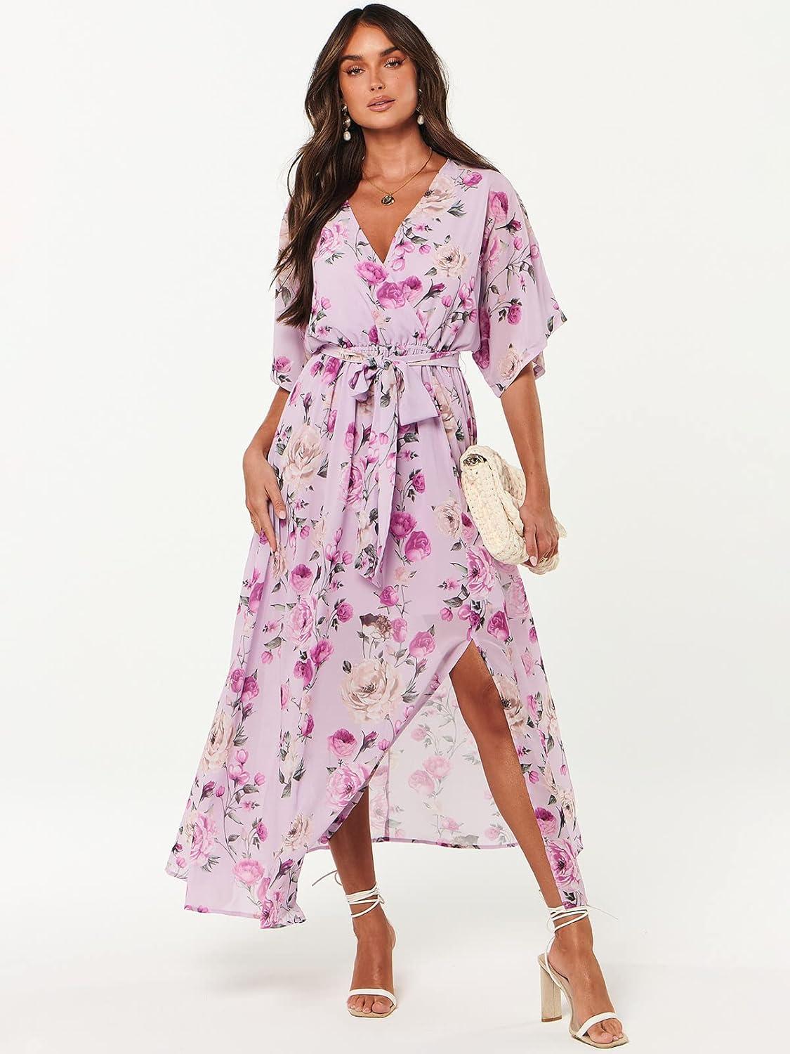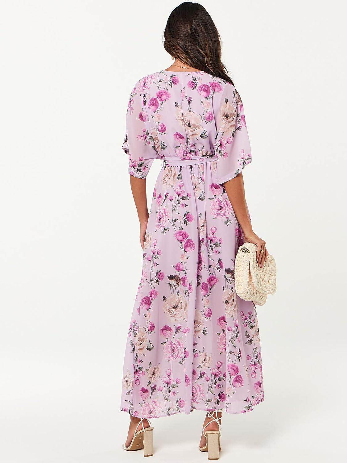 ANRABESS Womens 1/2 Sleeve Beach Wedding Guest Maxi Dresses 2025 Fall Wrap V Neck Boho Floral Flowy Slit Long Summer Dresses(Floral Purple)