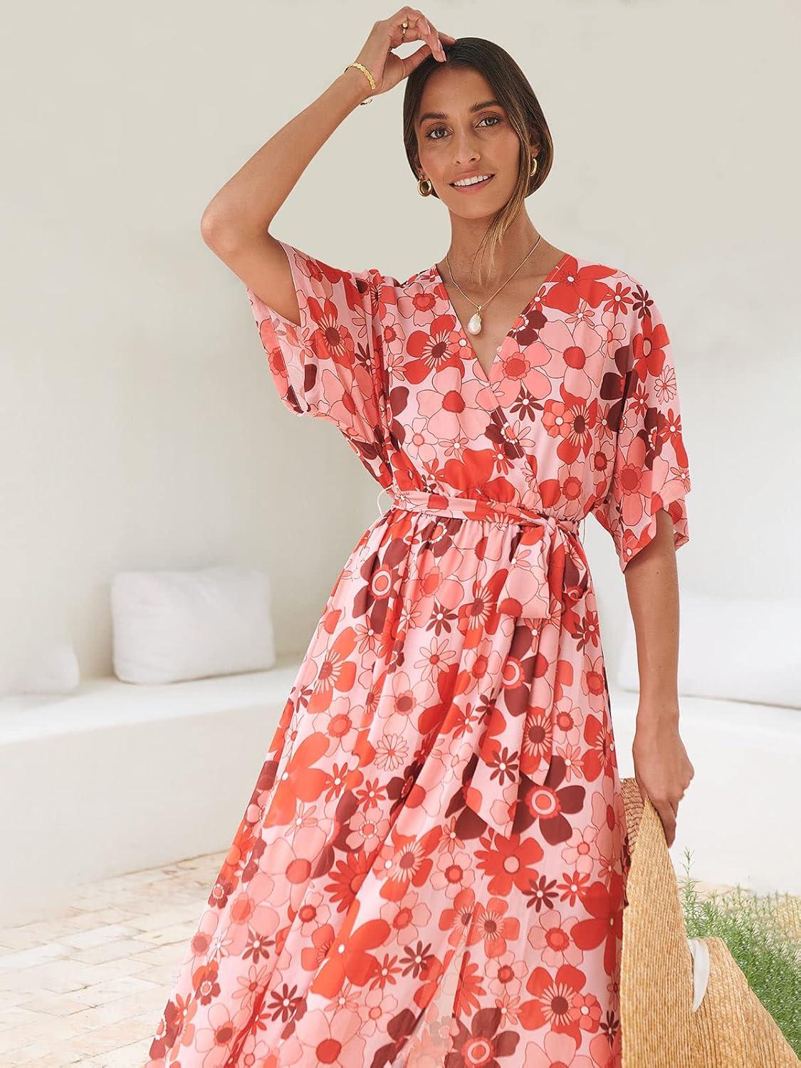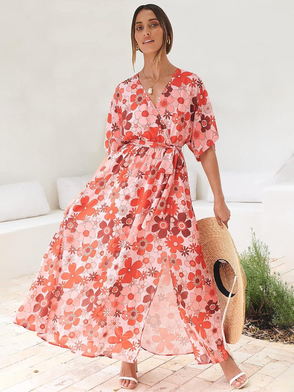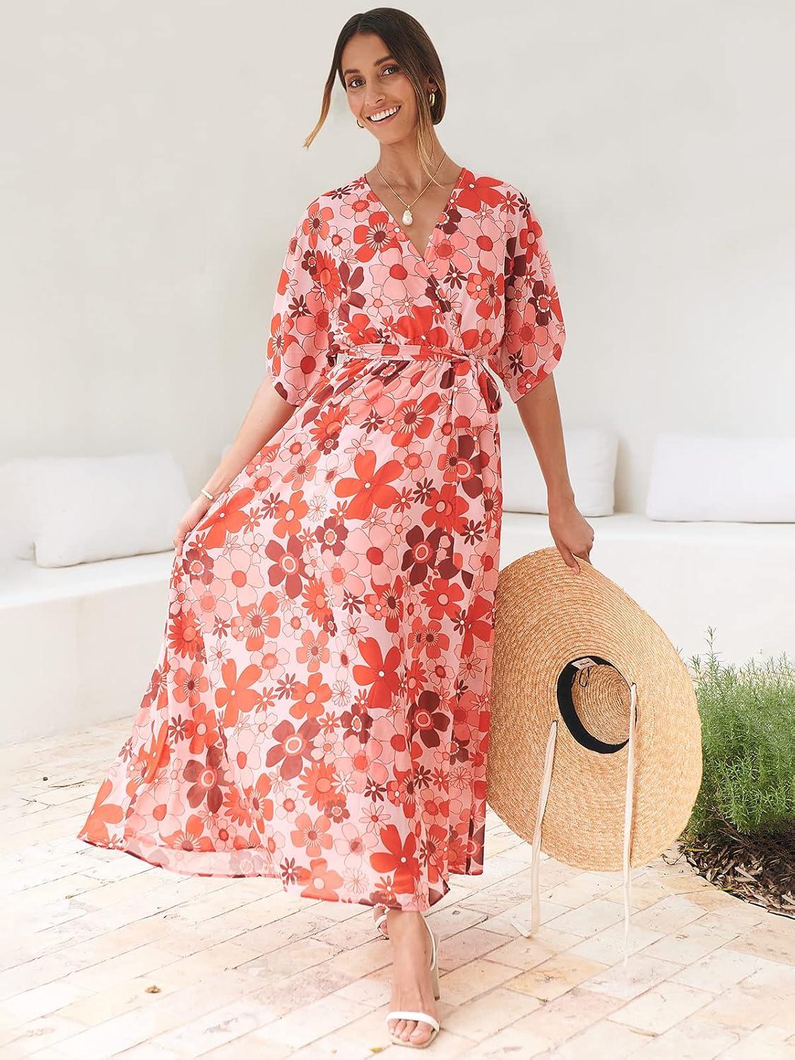 ANRABESS Womens 1/2 Sleeve Beach Wedding Guest Maxi Dresses 2025 Fall Wrap V Neck Boho Floral Flowy Slit Long Summer Dresses(Floral Red Pink)