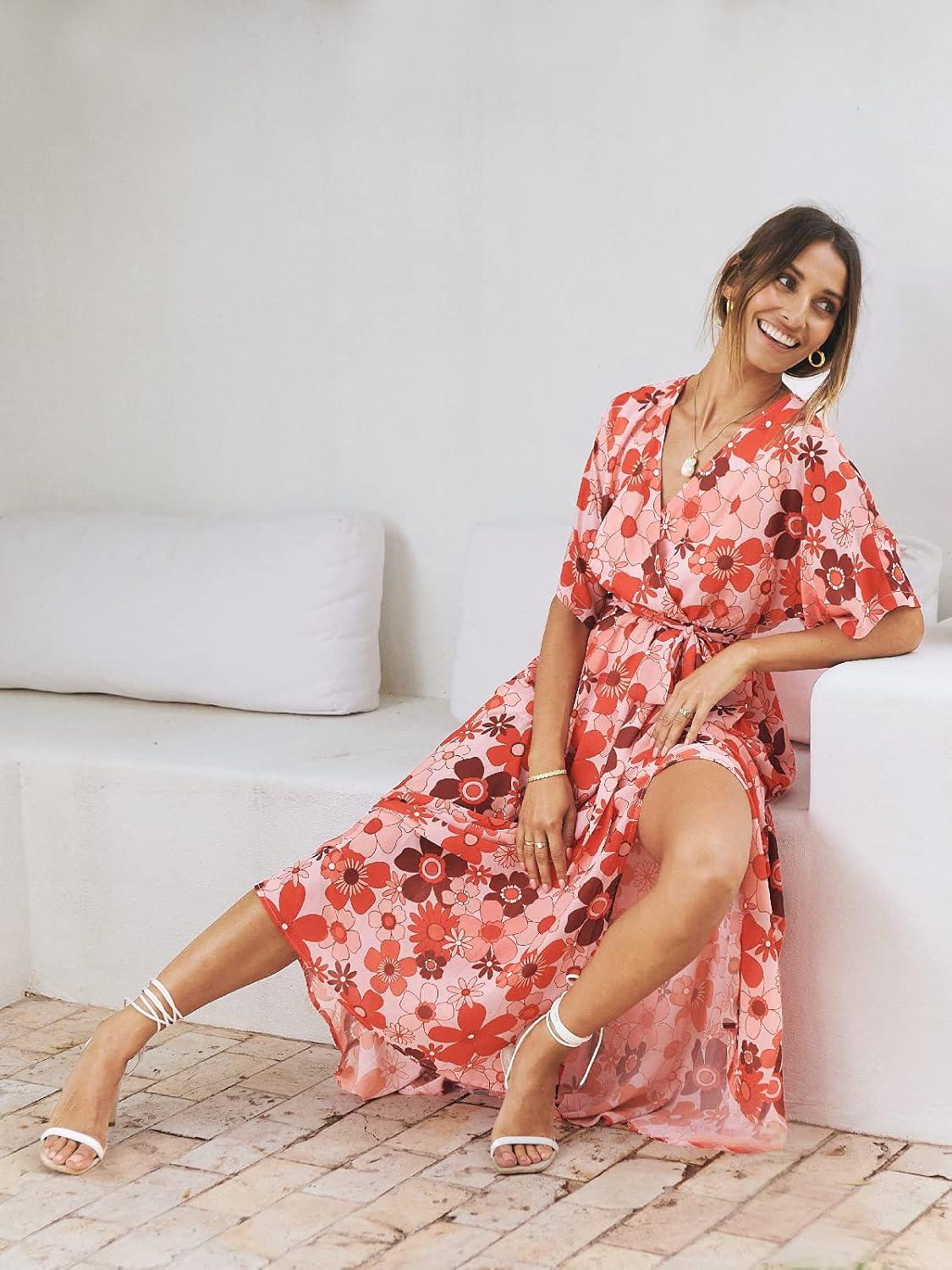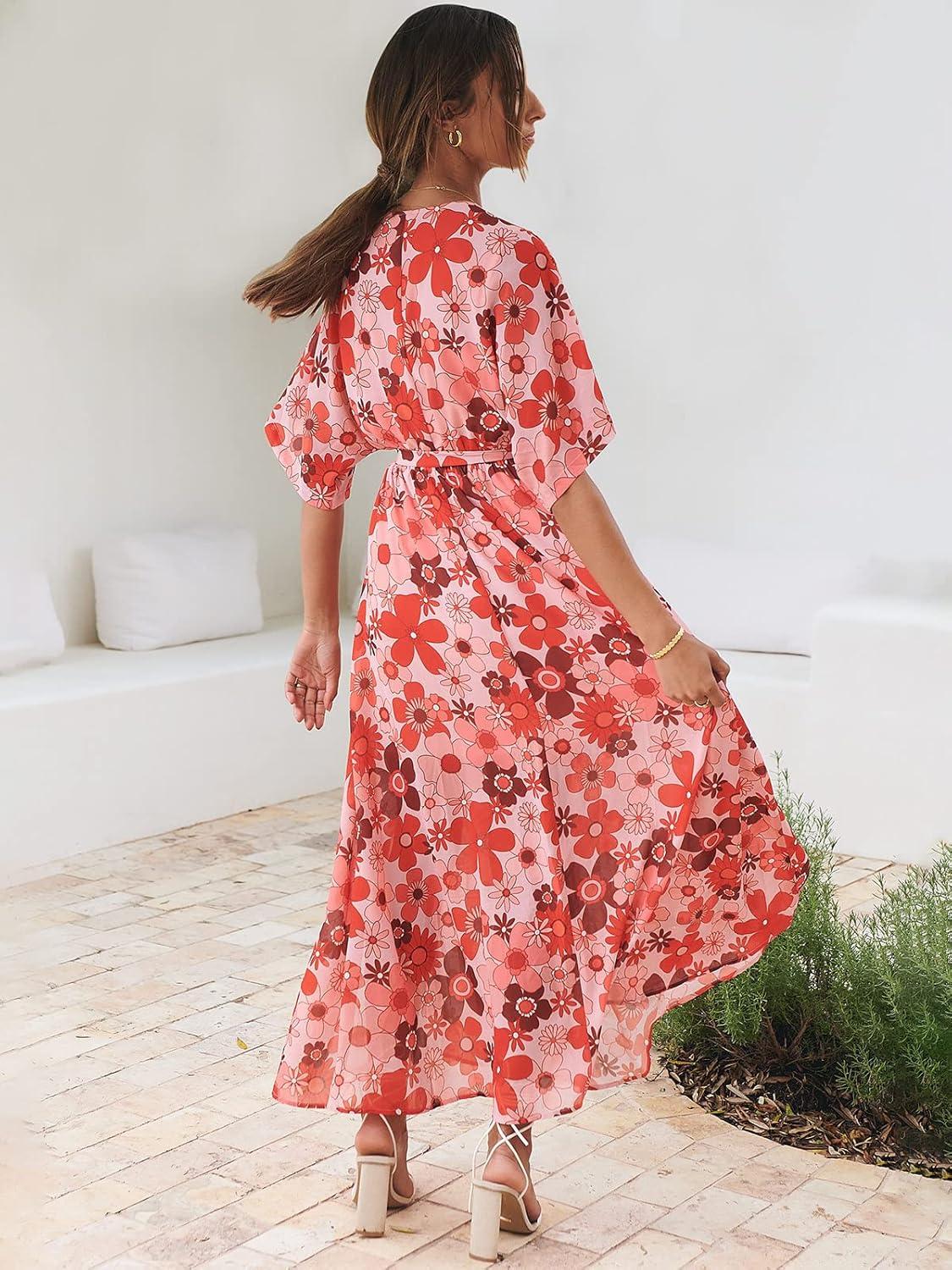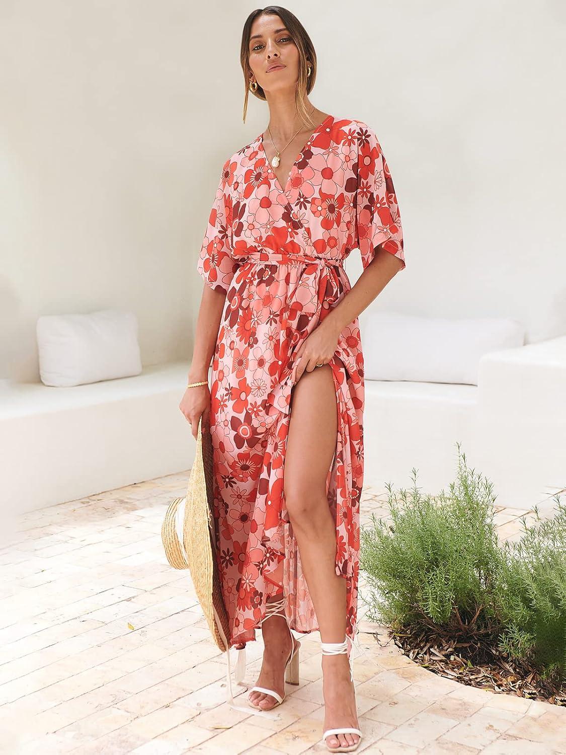 ANRABESS Womens 1/2 Sleeve Beach Wedding Guest Maxi Dresses 2025 Fall Wrap V Neck Boho Floral Flowy Slit Long Summer Dresses(Floral Red Pink)
