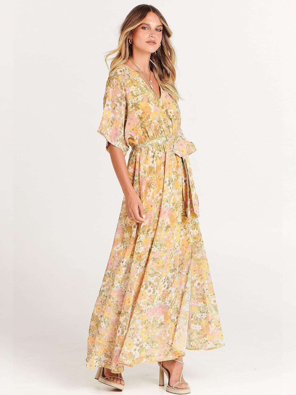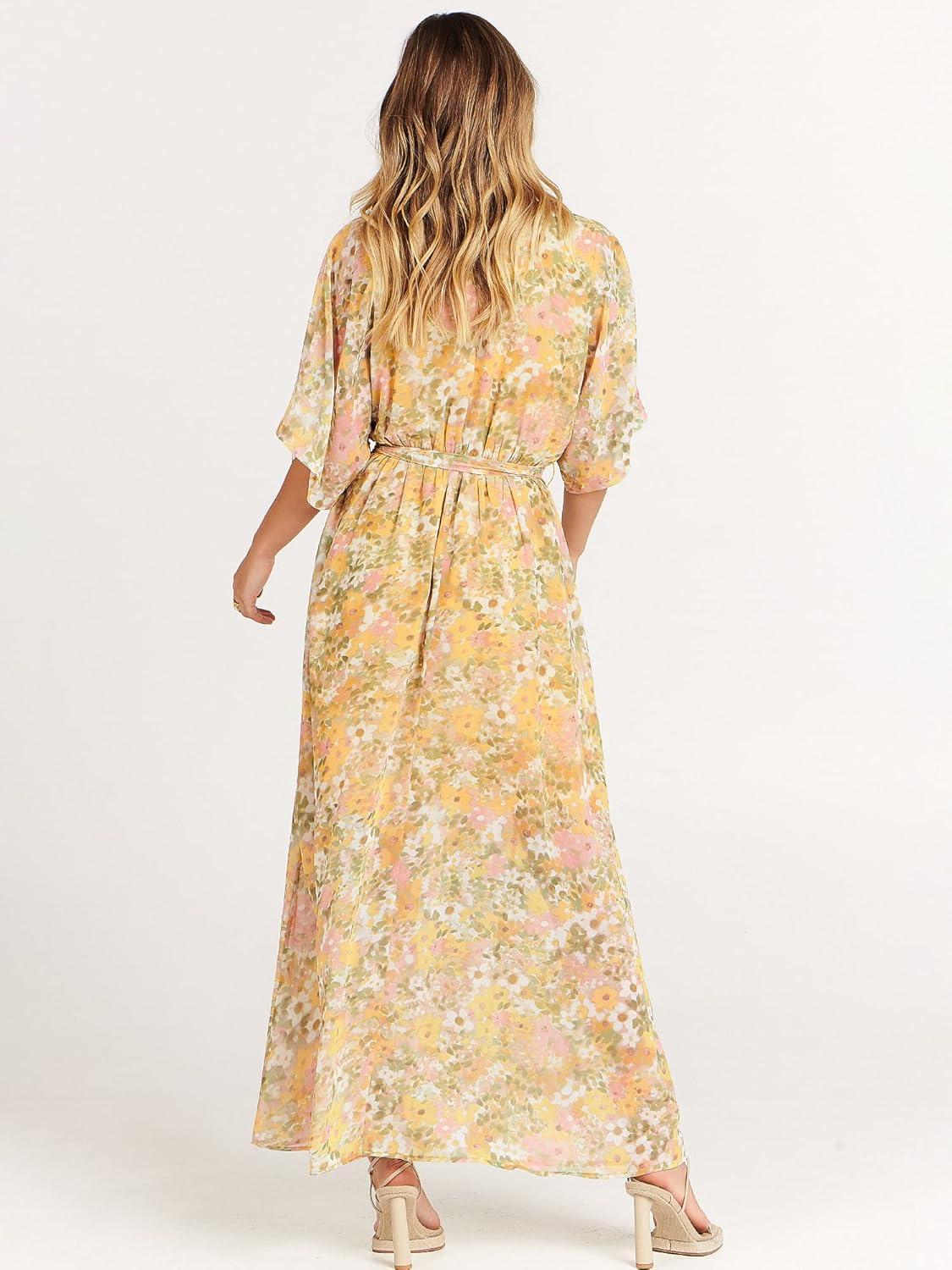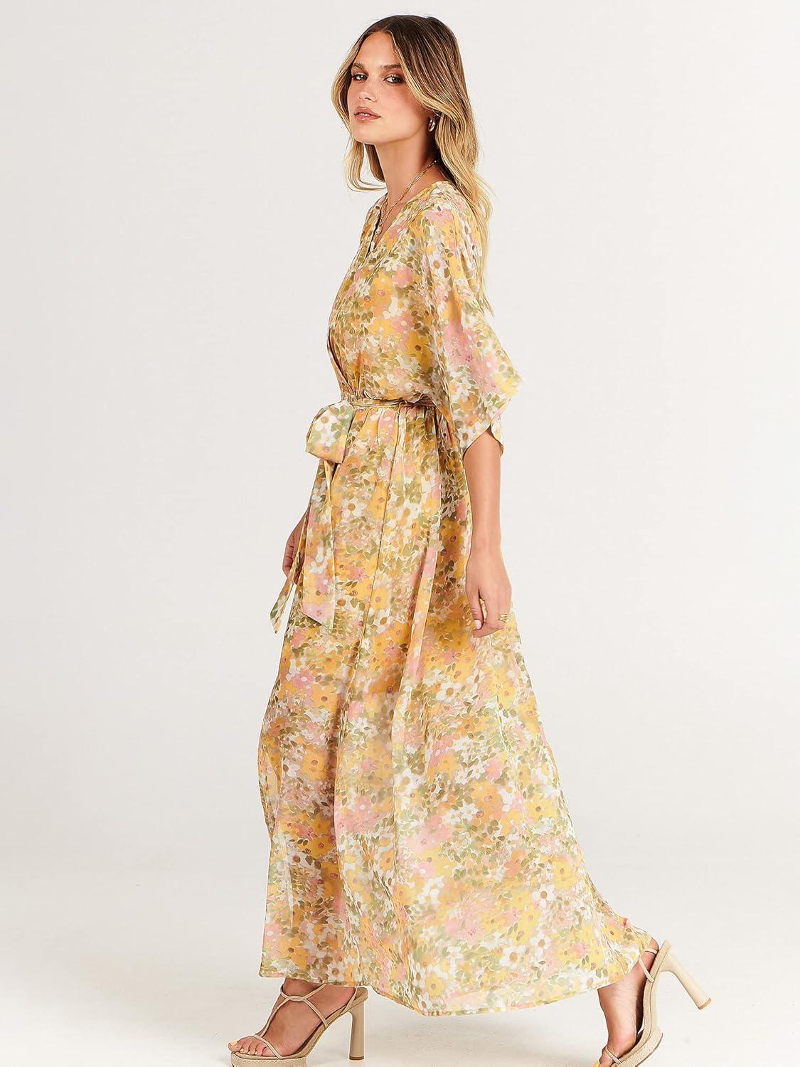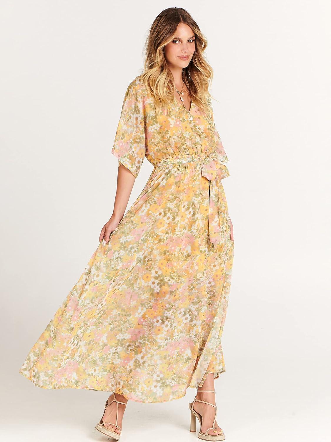 ANRABESS Womens 1/2 Sleeve Beach Wedding Guest Maxi Dresses 2025 Fall Wrap V Neck Boho Floral Flowy Slit Long Summer Dresses(Floral Yellow Pink)