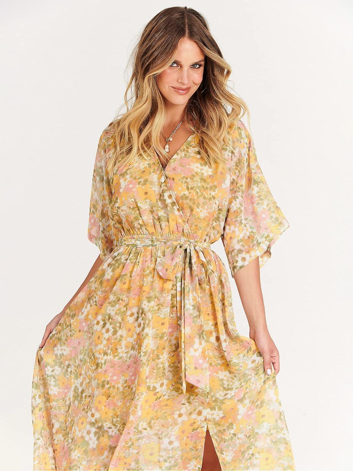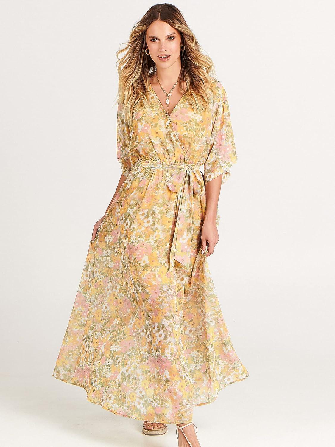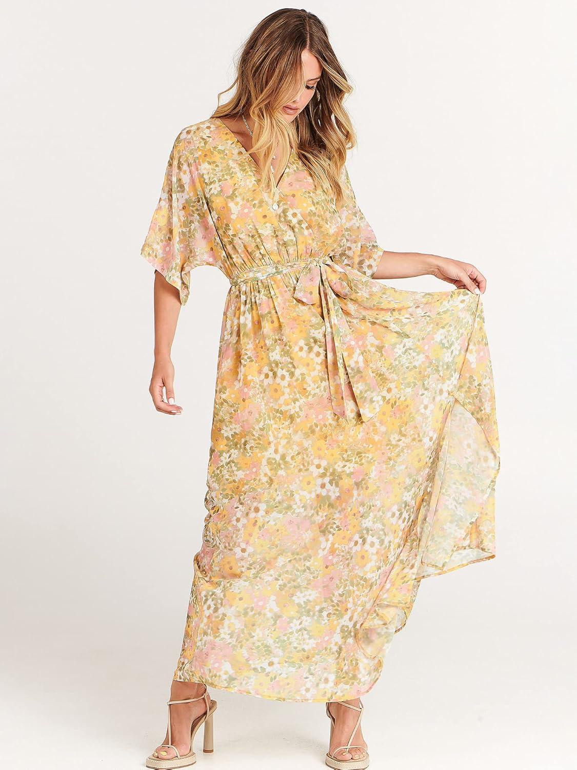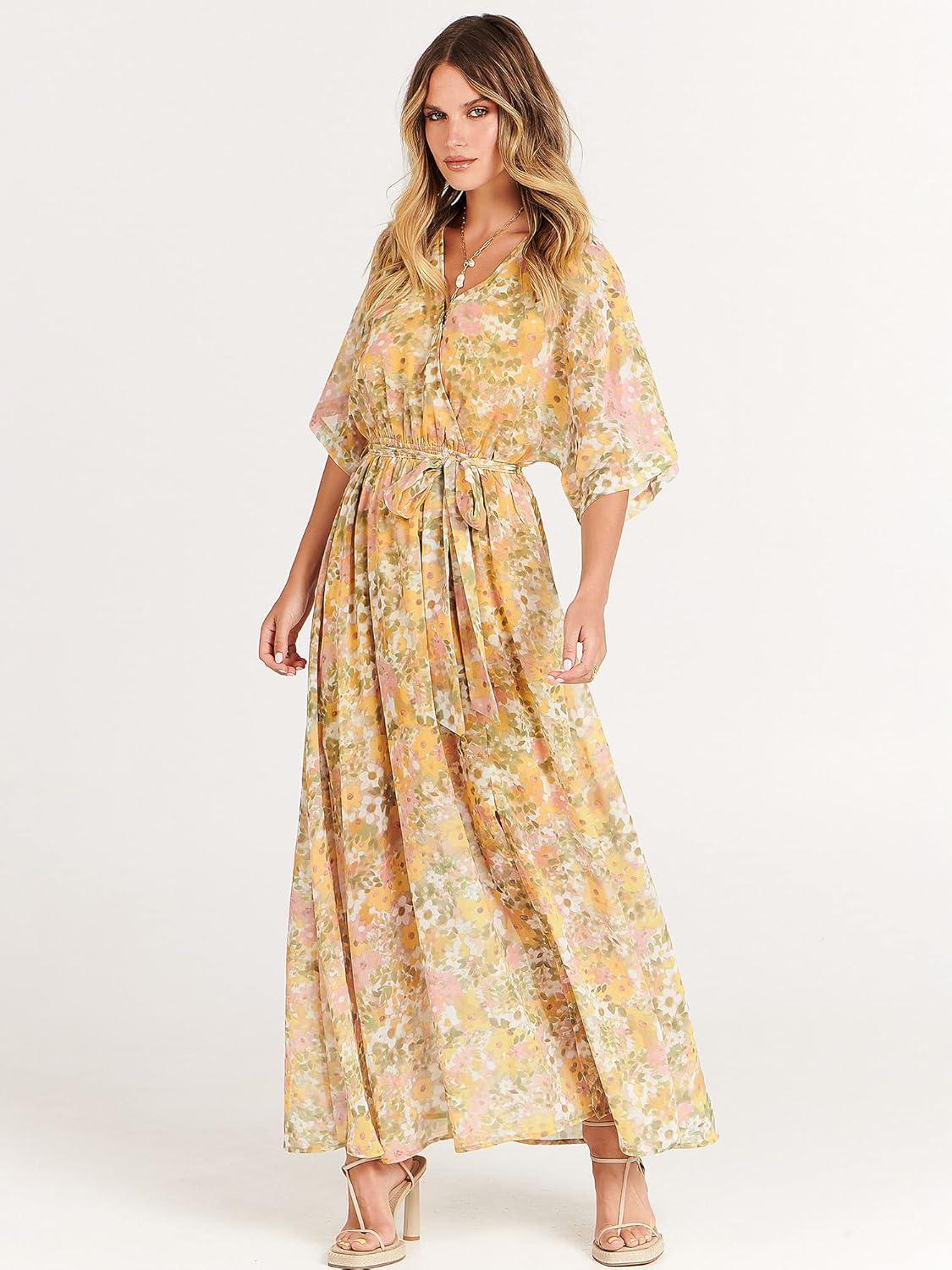 ANRABESS Womens 1/2 Sleeve Beach Wedding Guest Maxi Dresses 2025 Fall Wrap V Neck Boho Floral Flowy Slit Long Summer Dresses(Floral Yellow Pink)