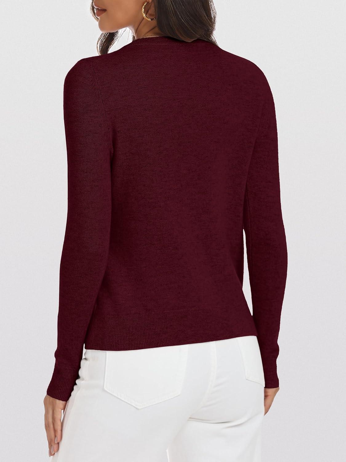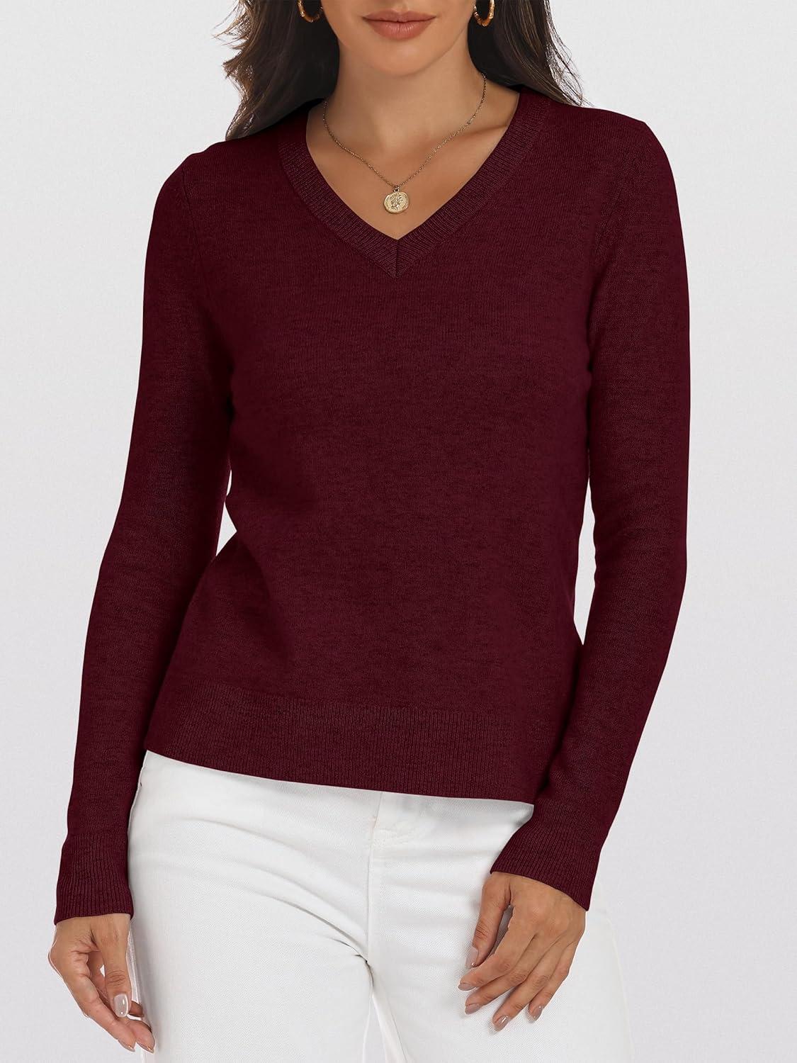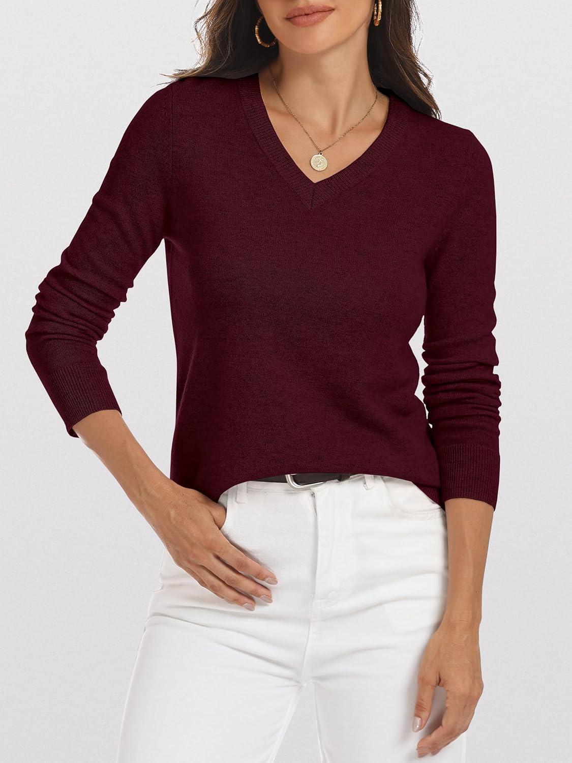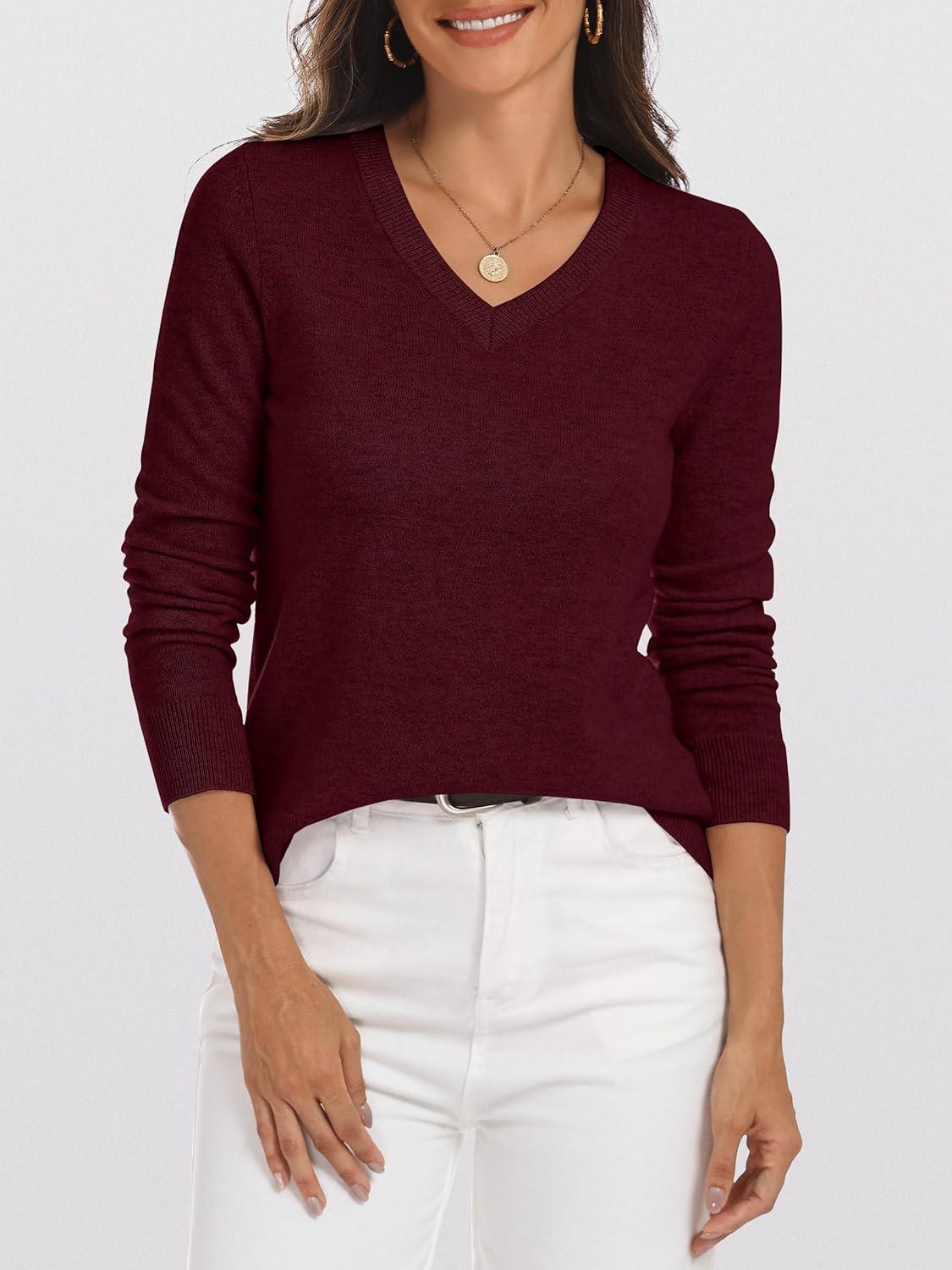 ANRABESS Womens 100% Wool Sweaters V Neck Long Sleeve Work Business Casual Basic Pullover Sweater Tops 2025 Fall Outfits(Dark Red)