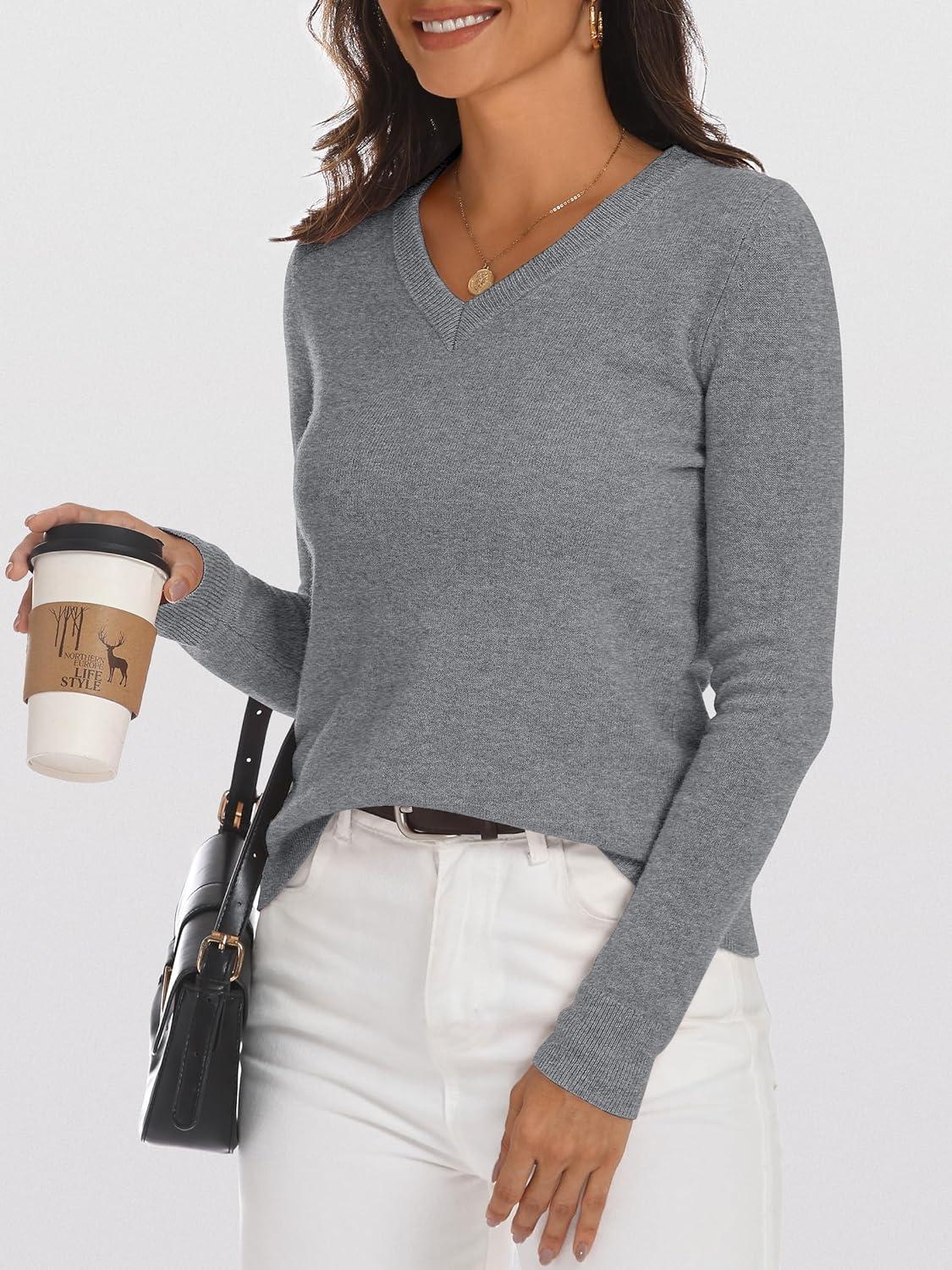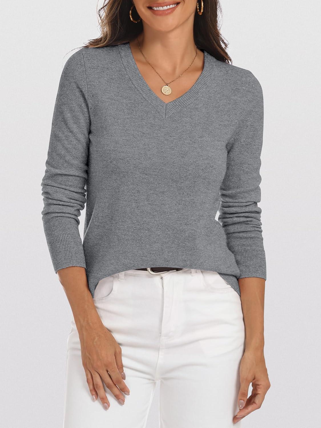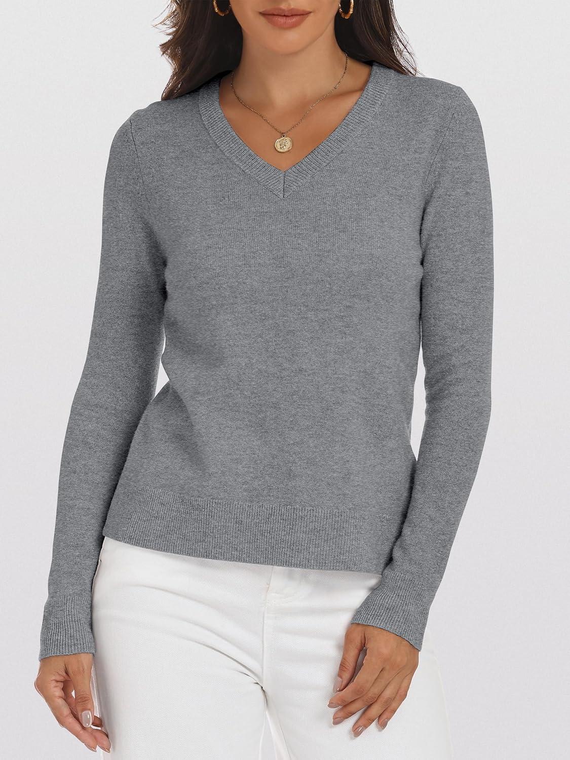 ANRABESS Womens 100% Wool Sweaters V Neck Long Sleeve Work Business Casual Basic Pullover Sweater Tops 2025 Fall Outfits(Gray)