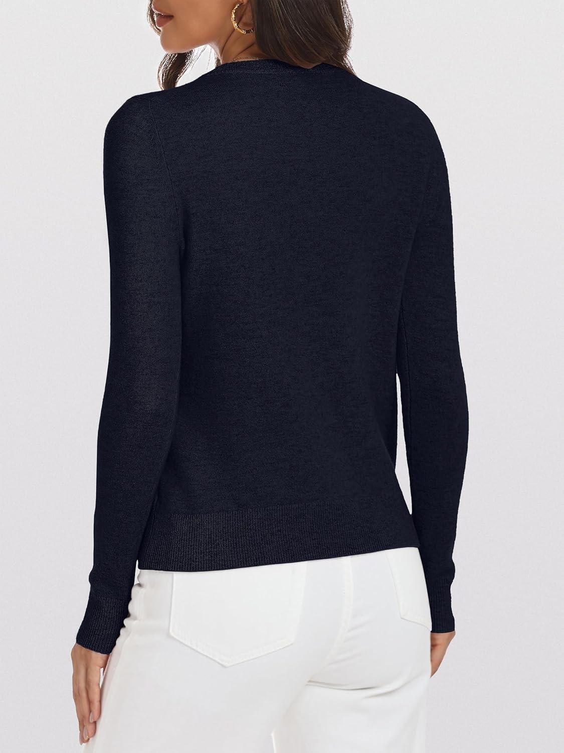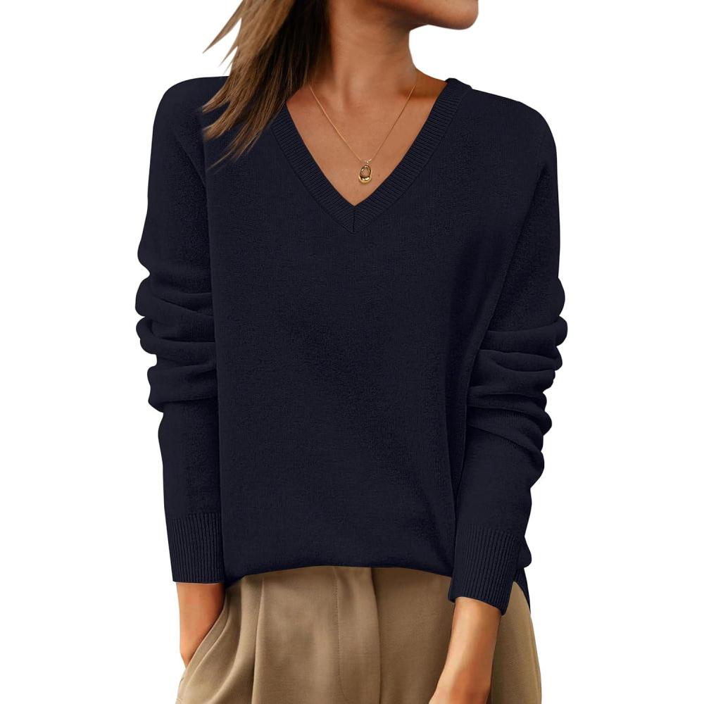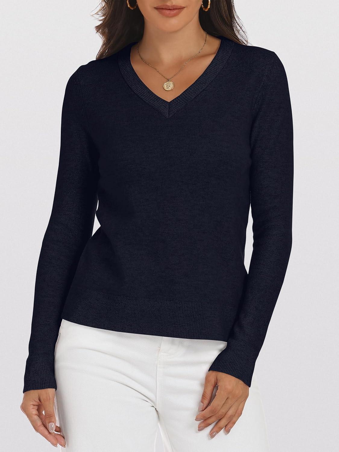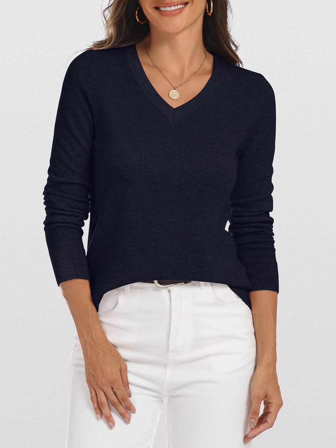 ANRABESS Womens 100% Wool Sweaters V Neck Long Sleeve Work Business Casual Basic Pullover Sweater Tops 2025 Fall Outfits(Navy Blue)