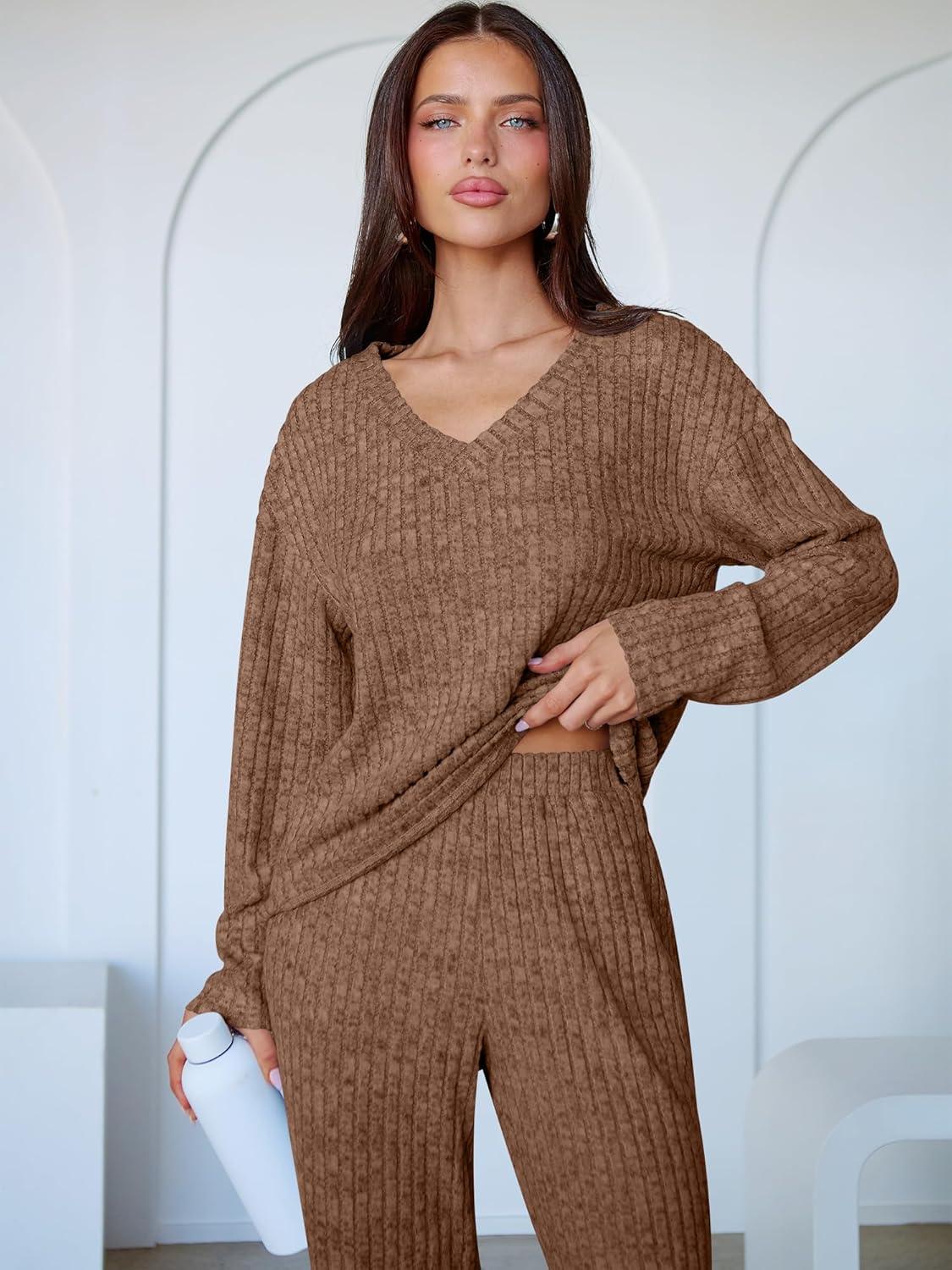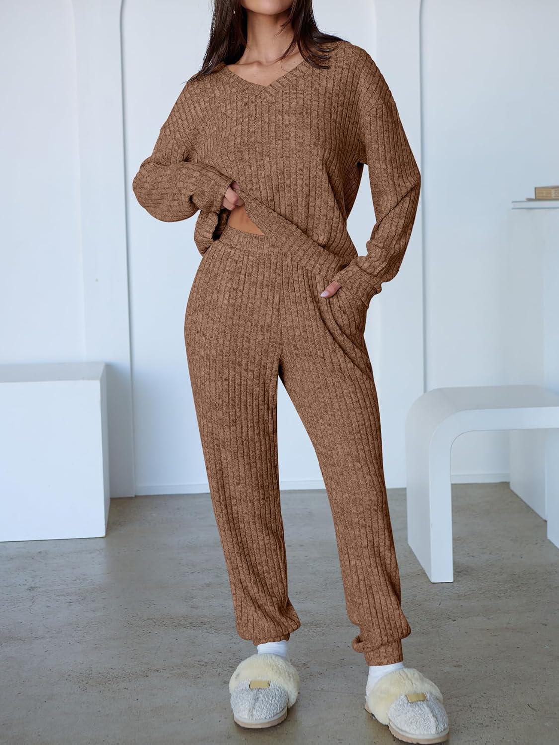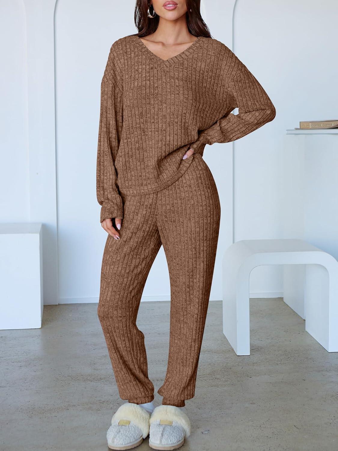 ANRABESS Women’s 2 Piece Lounge Pajama Sets Casual Ribbed Knit V Neck Long Sleeve Jogger Pants Matching Set 2025 Fall Outfits(Tan)
