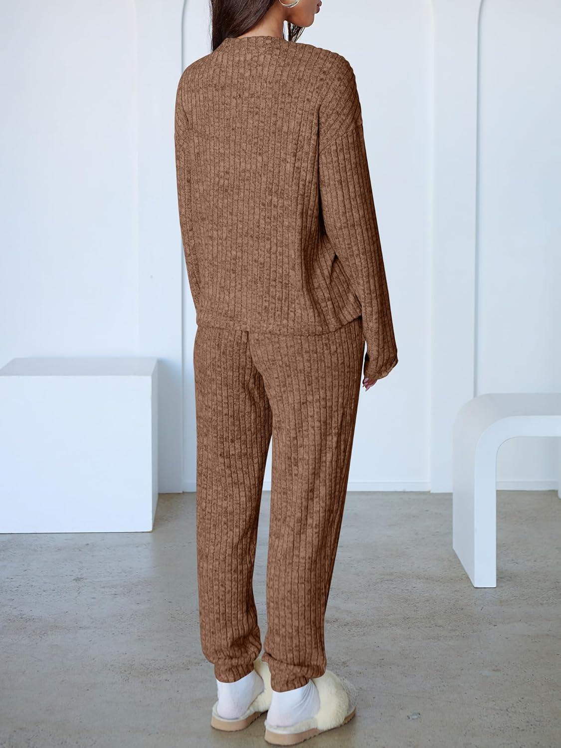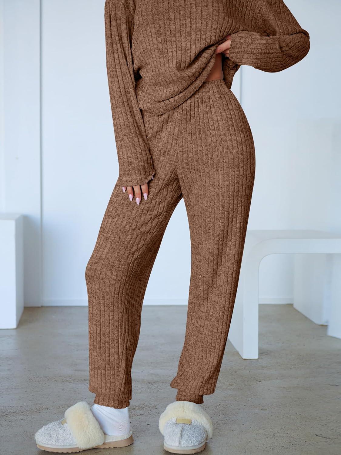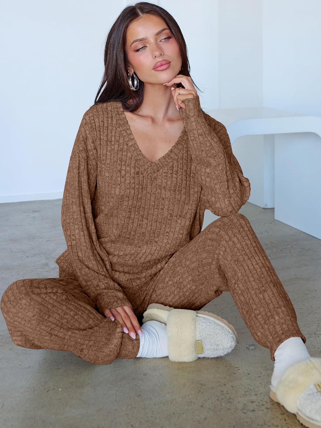 ANRABESS Women’s 2 Piece Lounge Pajama Sets Casual Ribbed Knit V Neck Long Sleeve Jogger Pants Matching Set 2025 Fall Outfits(Tan)
