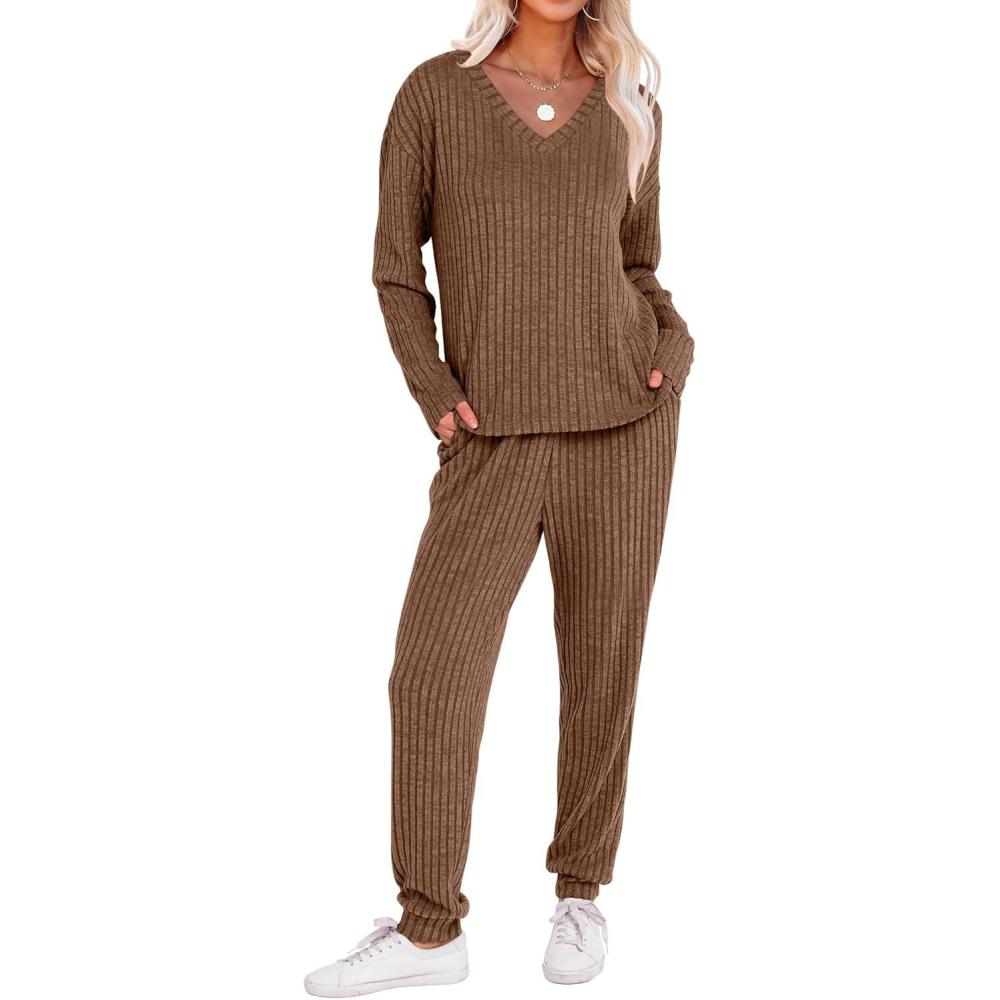 Be the first to review “ANRABESS Women’s 2 Piece Lounge Pajama Sets Casual Ribbed Knit V Neck Long Sleeve Jogger Pants Matching Set 2025 Fall Outfits(Tan)”
