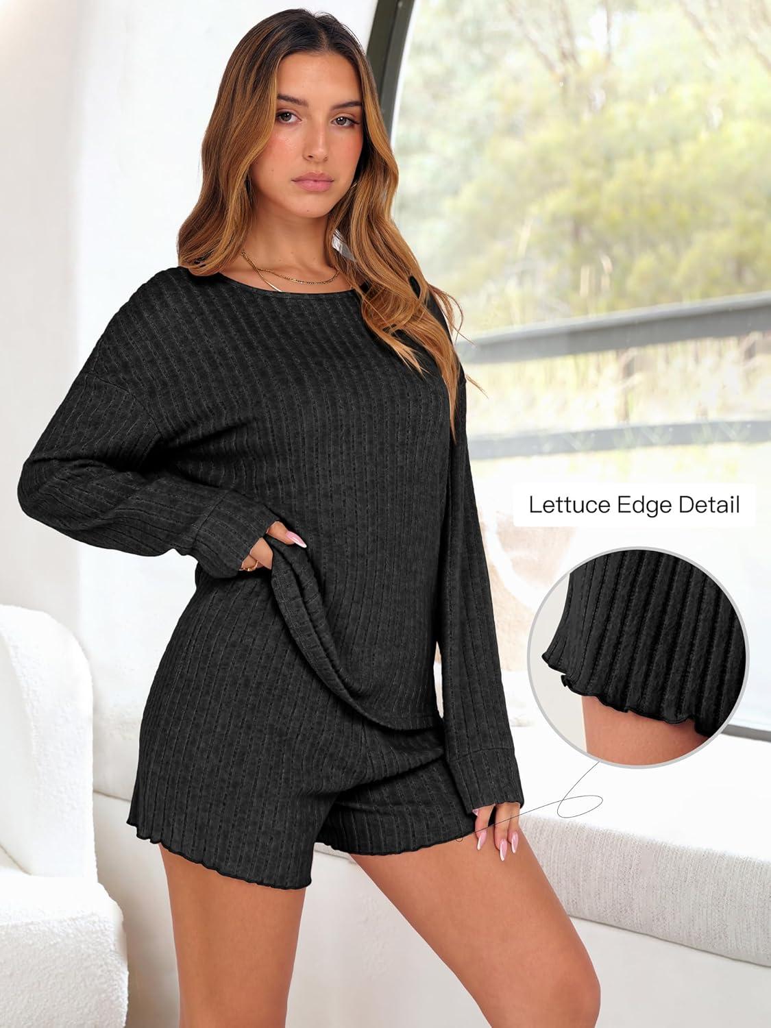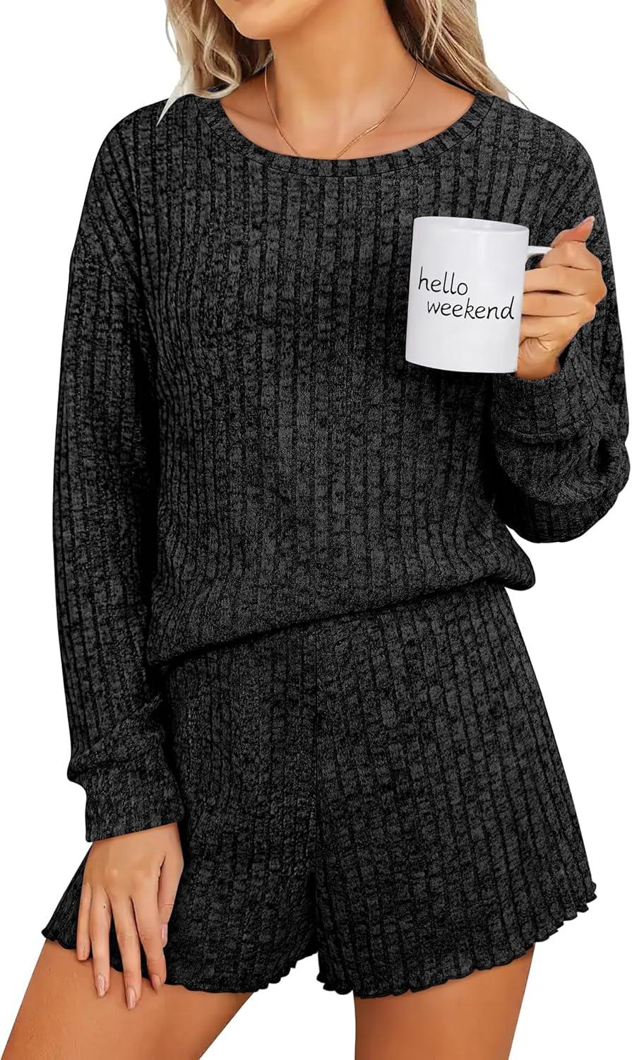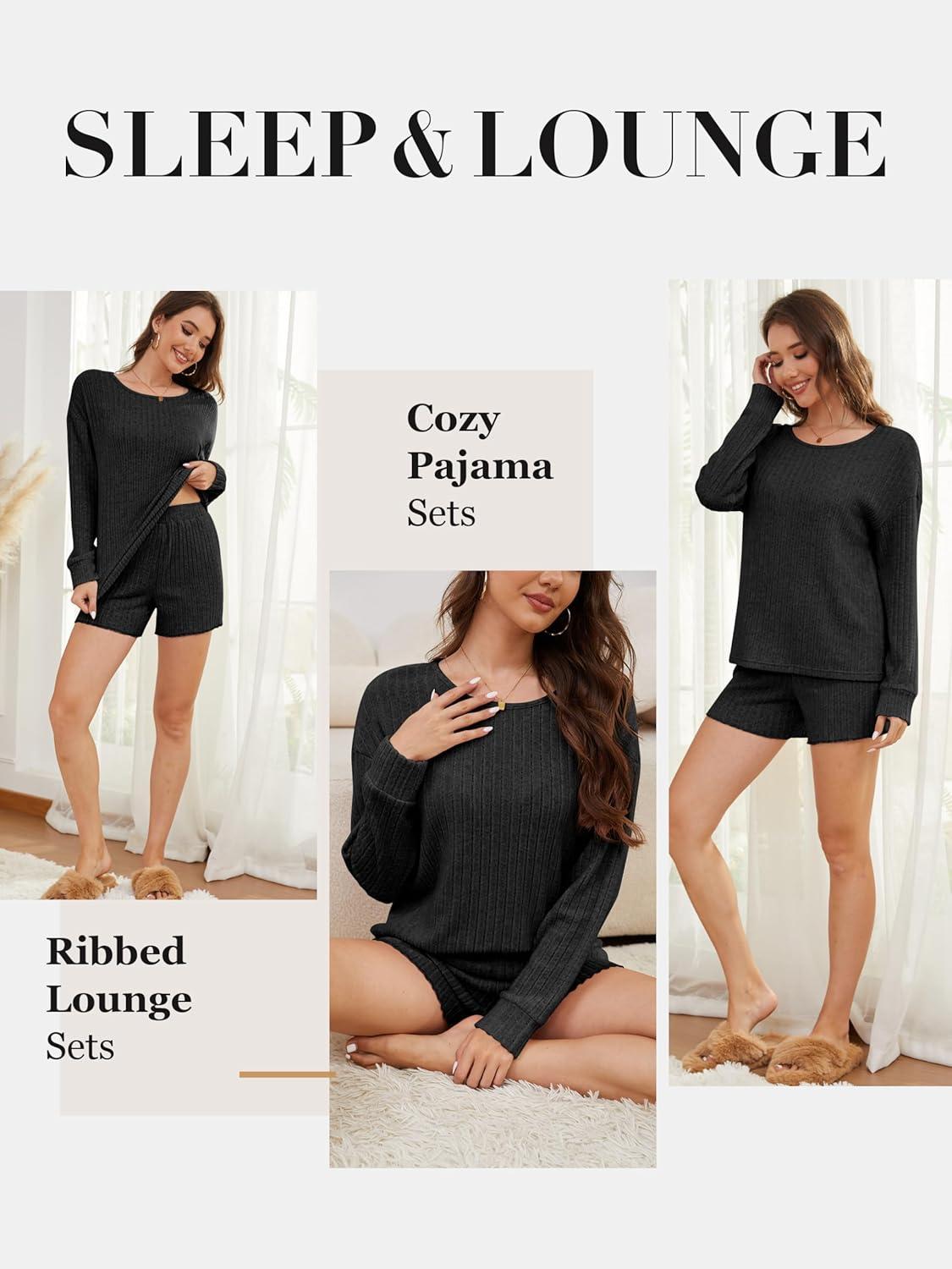 ANRABESS Women’s 2 Piece Lounge Pajama Sets Casual Ribbed Long Sleeve Top Matching Shorts Sleepwear PJ Set 2025 Fall Outfits(Black)