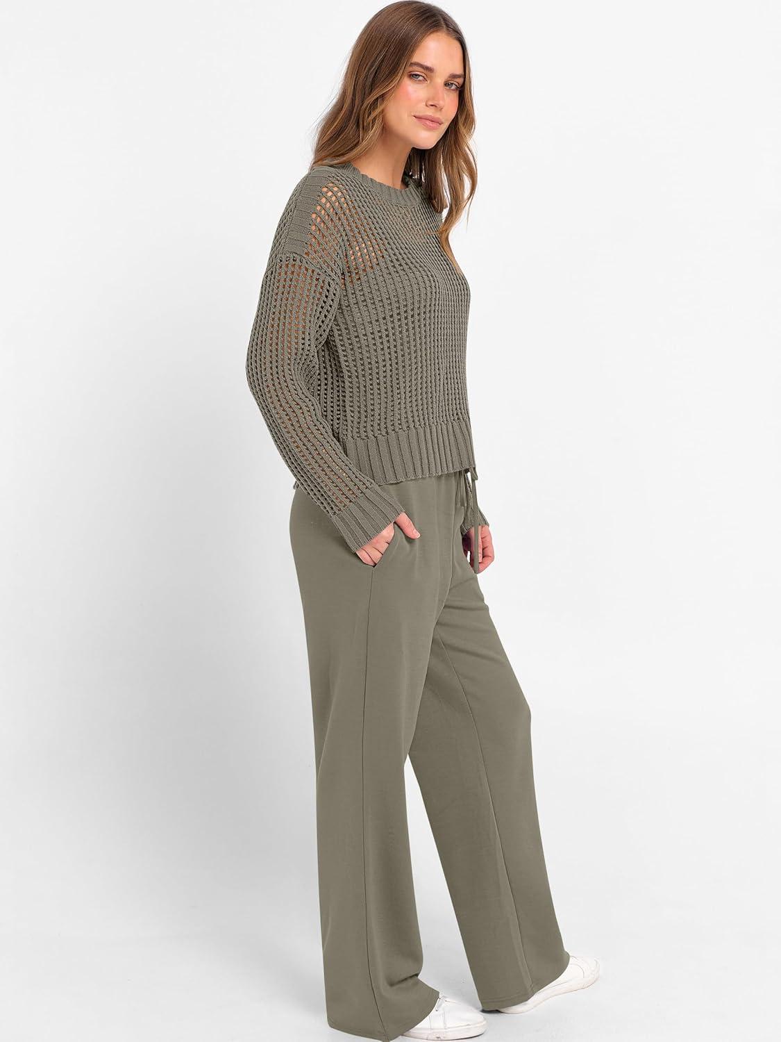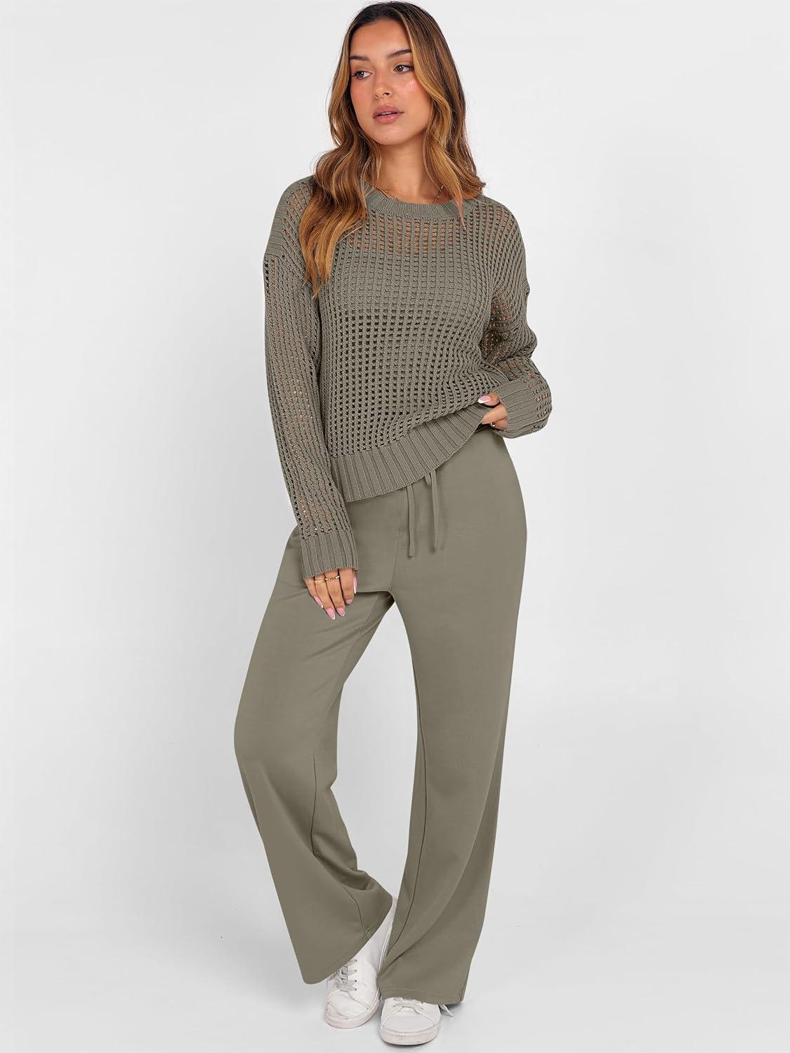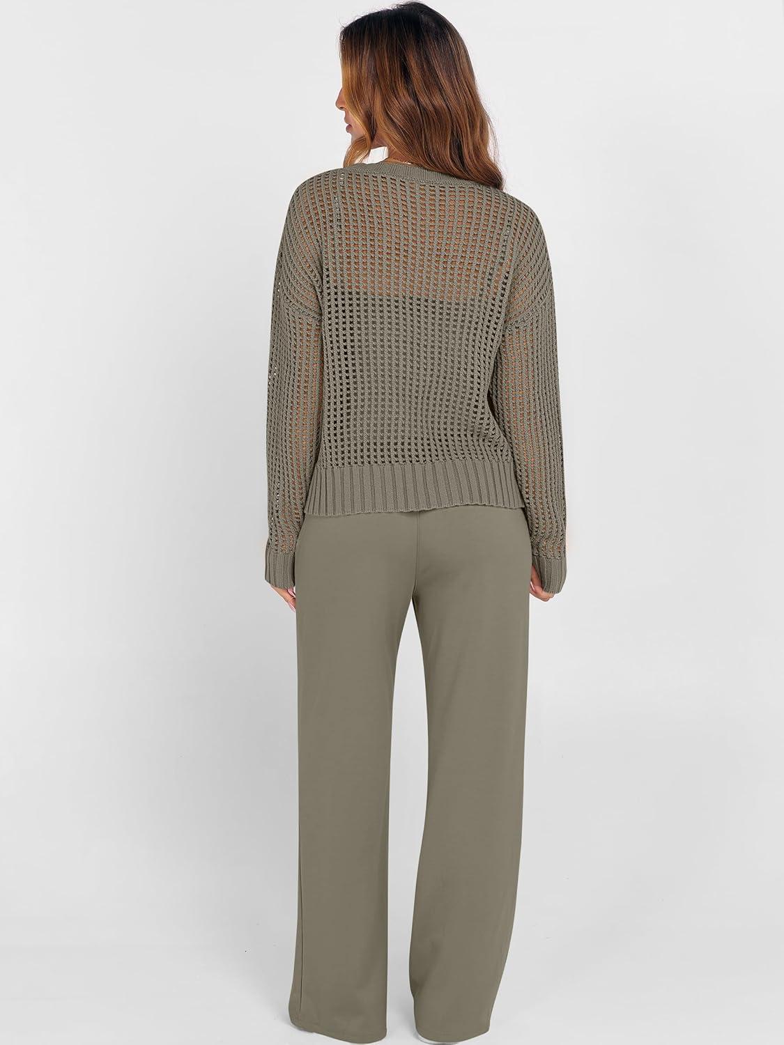 ANRABESS Womens 2 Piece Outfits Crochet Sheer Knit Sweater Top Wide Leg Pants Lounge Sets Sweatsuit 2025 Fall Travel Clothes(Army Green)