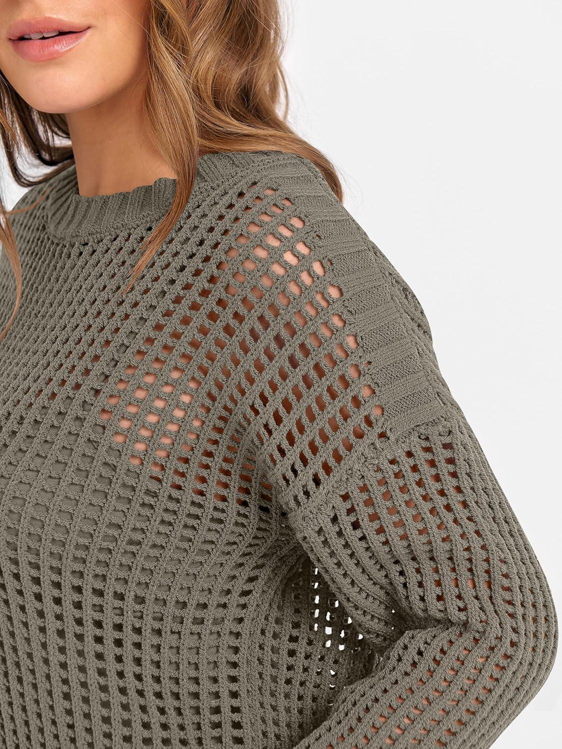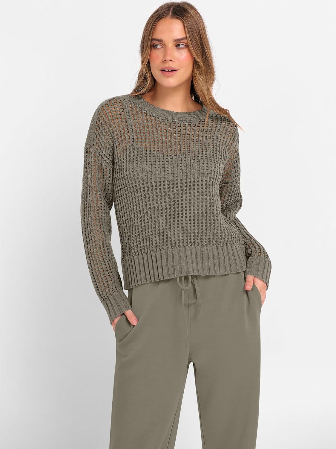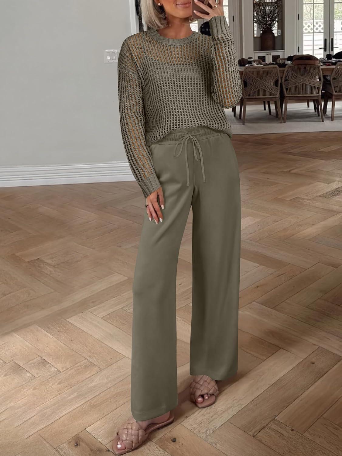 ANRABESS Womens 2 Piece Outfits Crochet Sheer Knit Sweater Top Wide Leg Pants Lounge Sets Sweatsuit 2025 Fall Travel Clothes(Army Green)