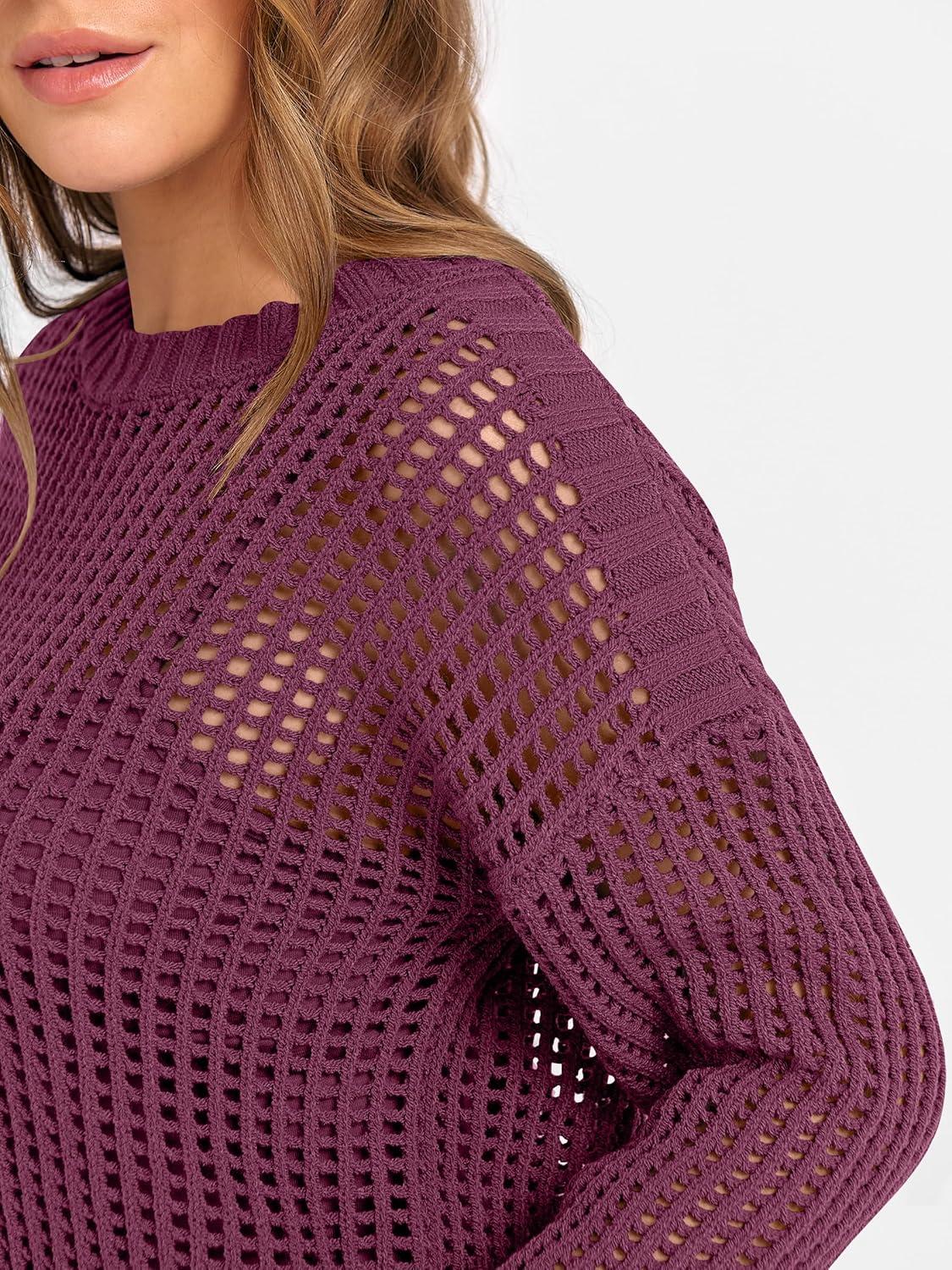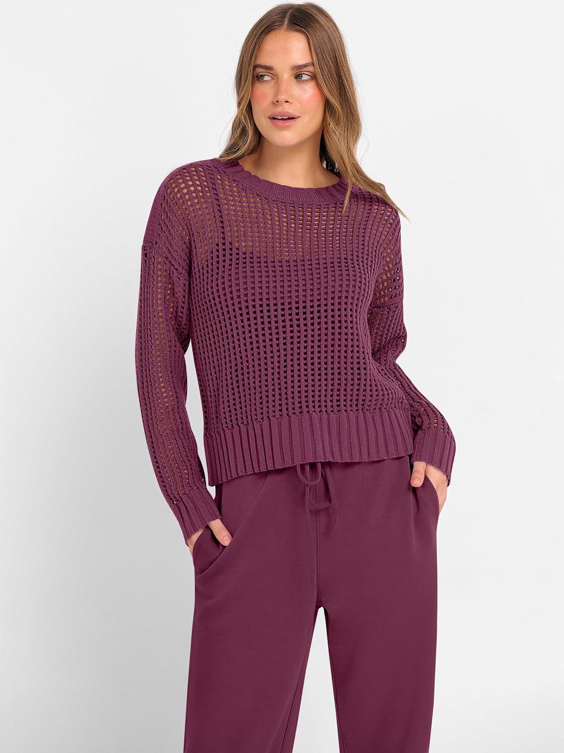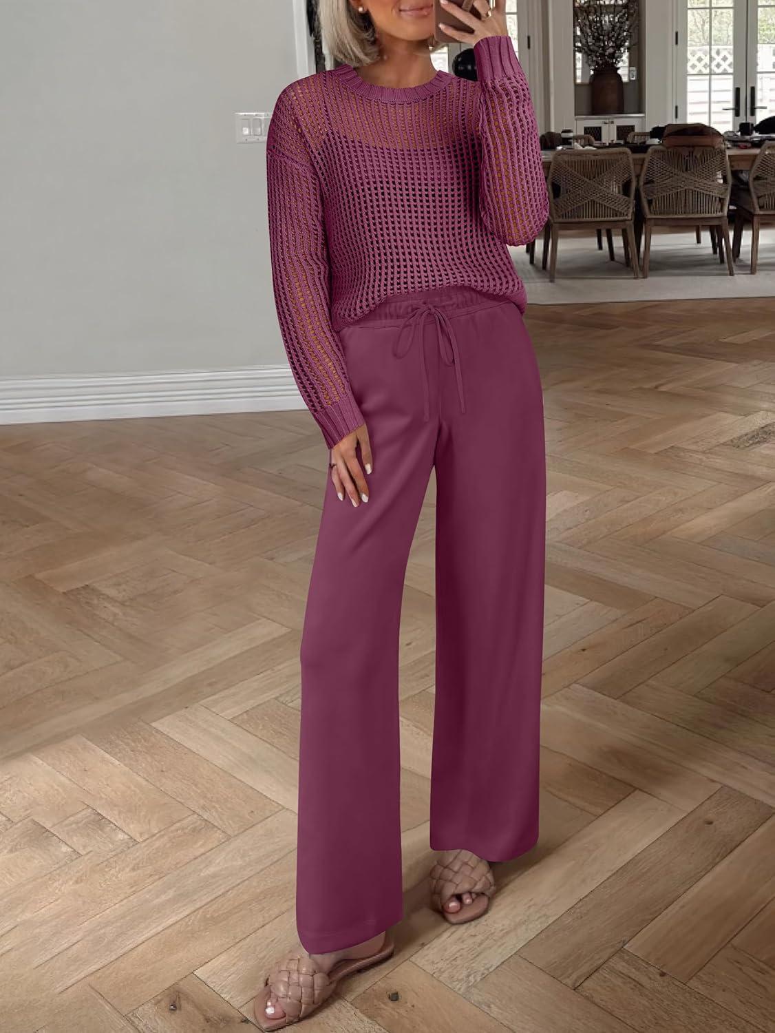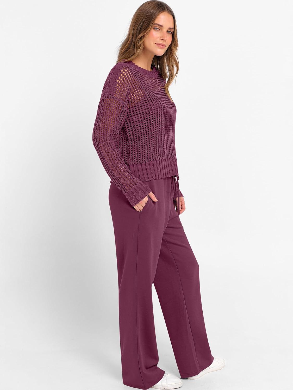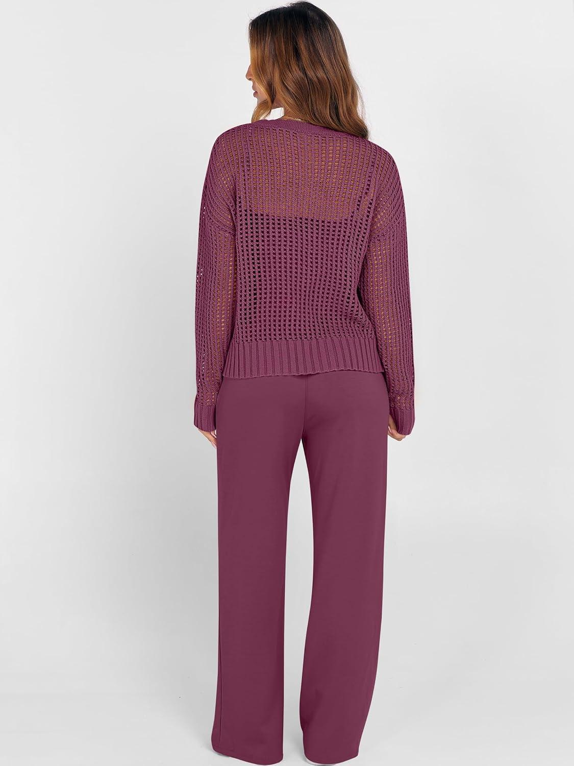 ANRABESS Womens 2 Piece Outfits Crochet Sheer Knit Sweater Top Wide Leg Pants Lounge Sets Sweatsuit 2025 Fall Travel Clothes(Wine Red)