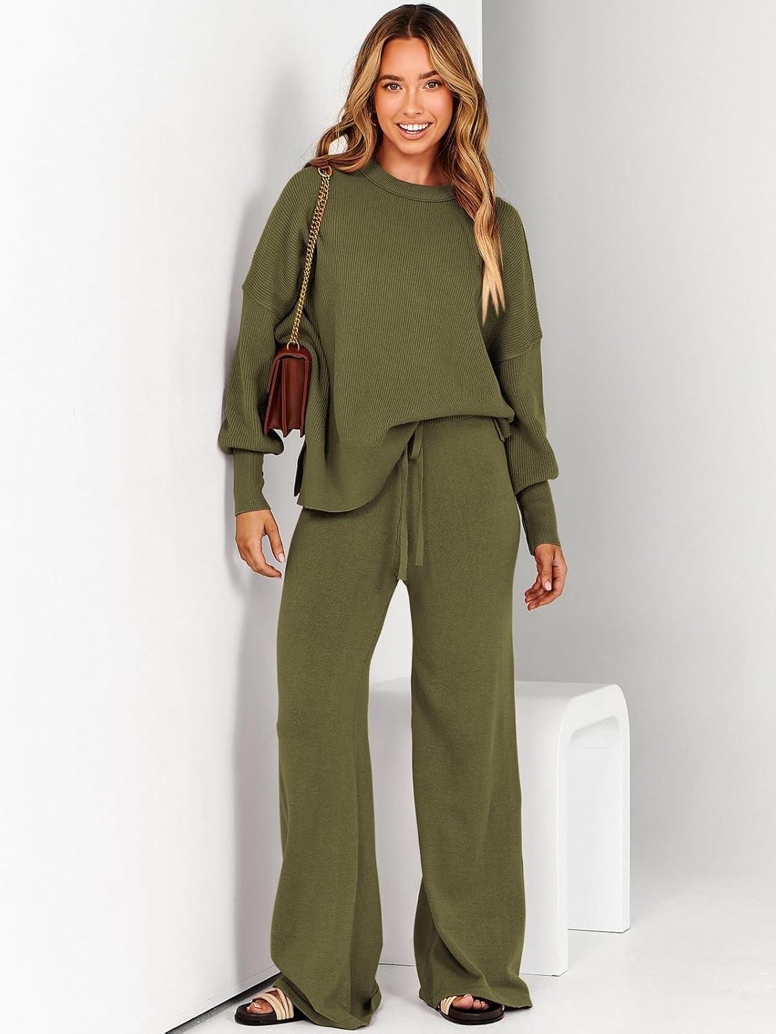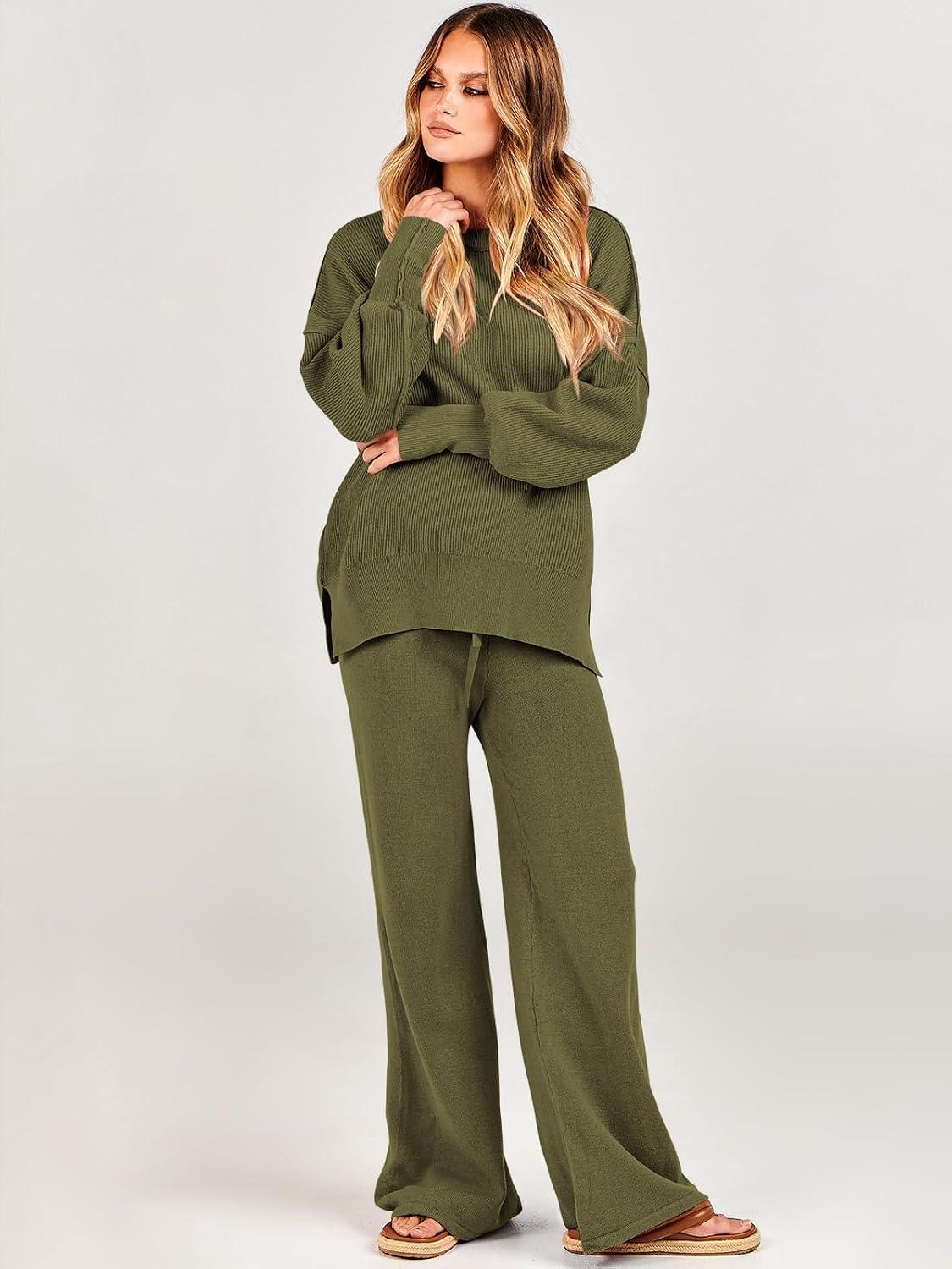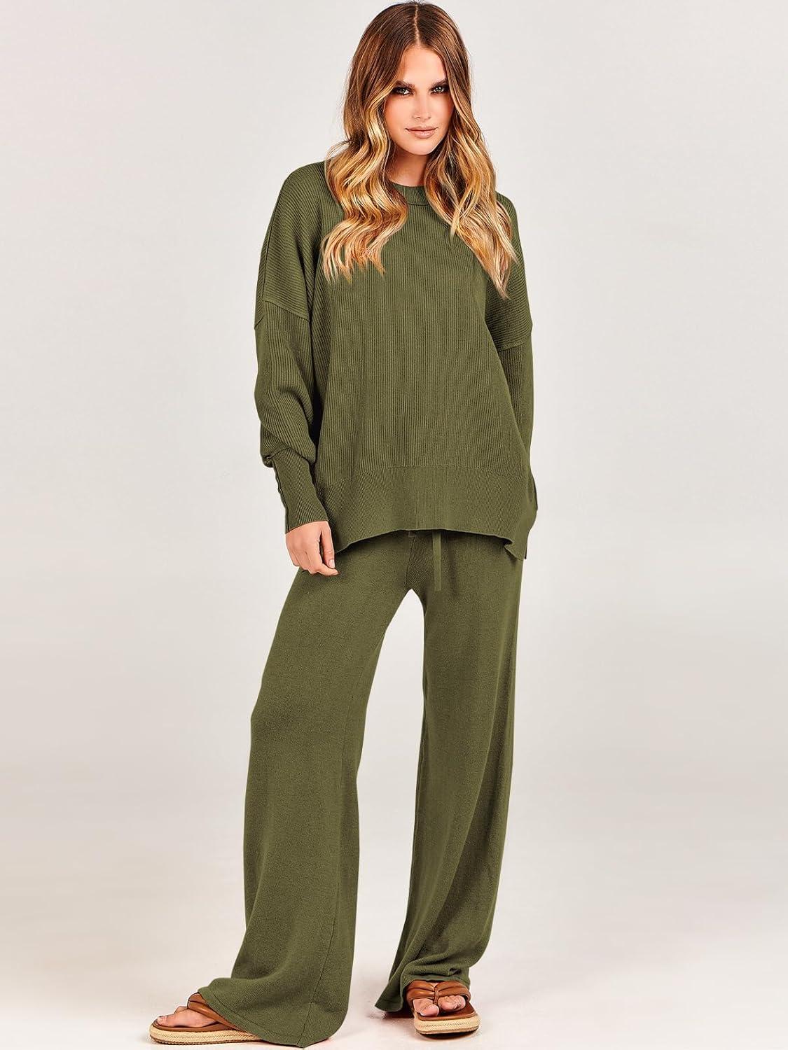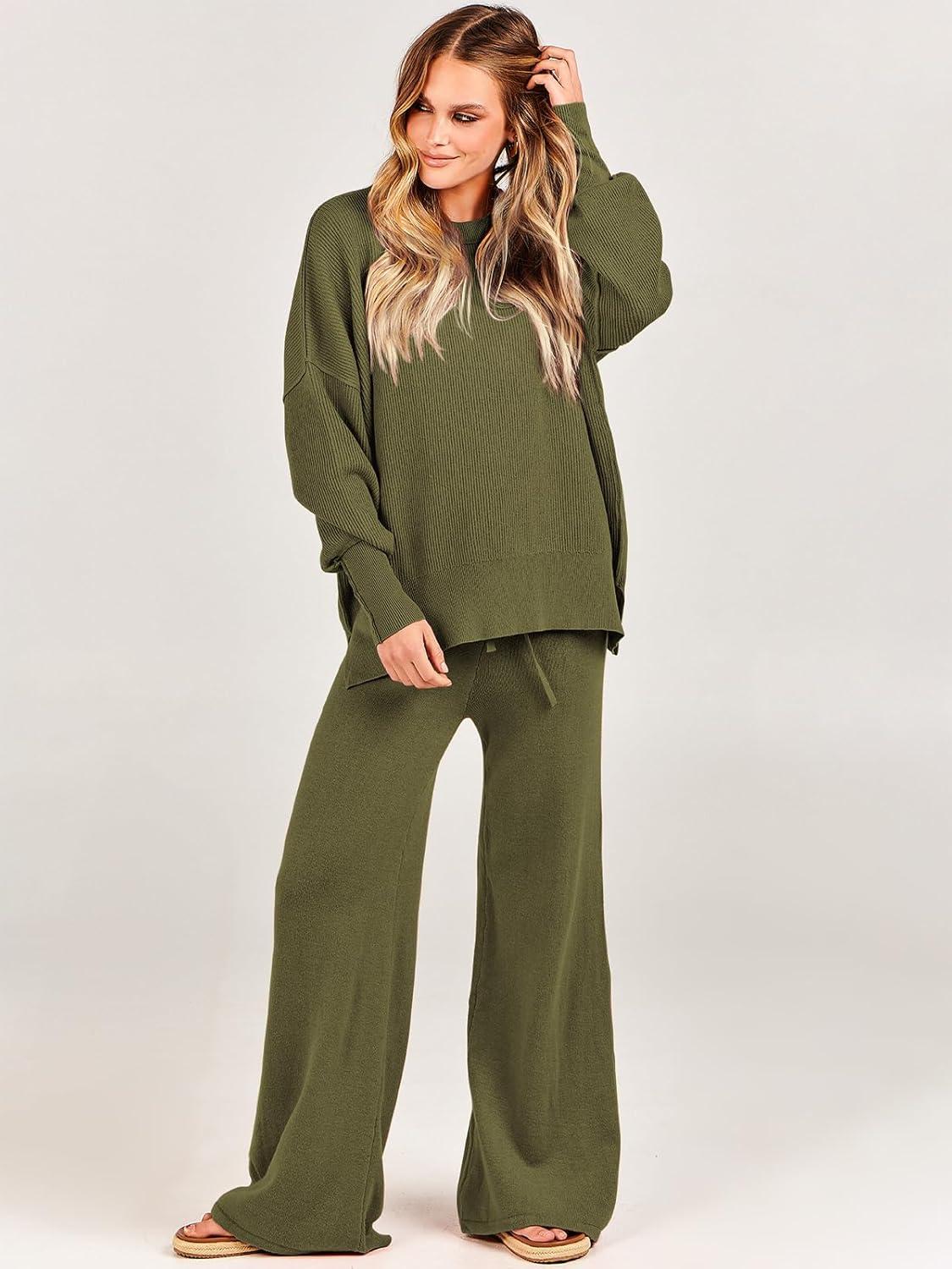 ANRABESS Womens 2 Piece Outfits Fall Lounge Set 2025 Oversized Chunky Knit Sweater Top Wide Leg Pants Loungewear Clothes(Olive)
