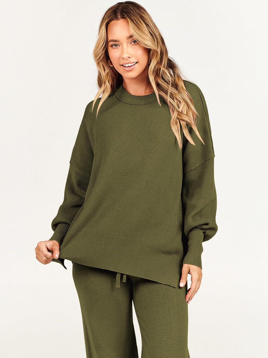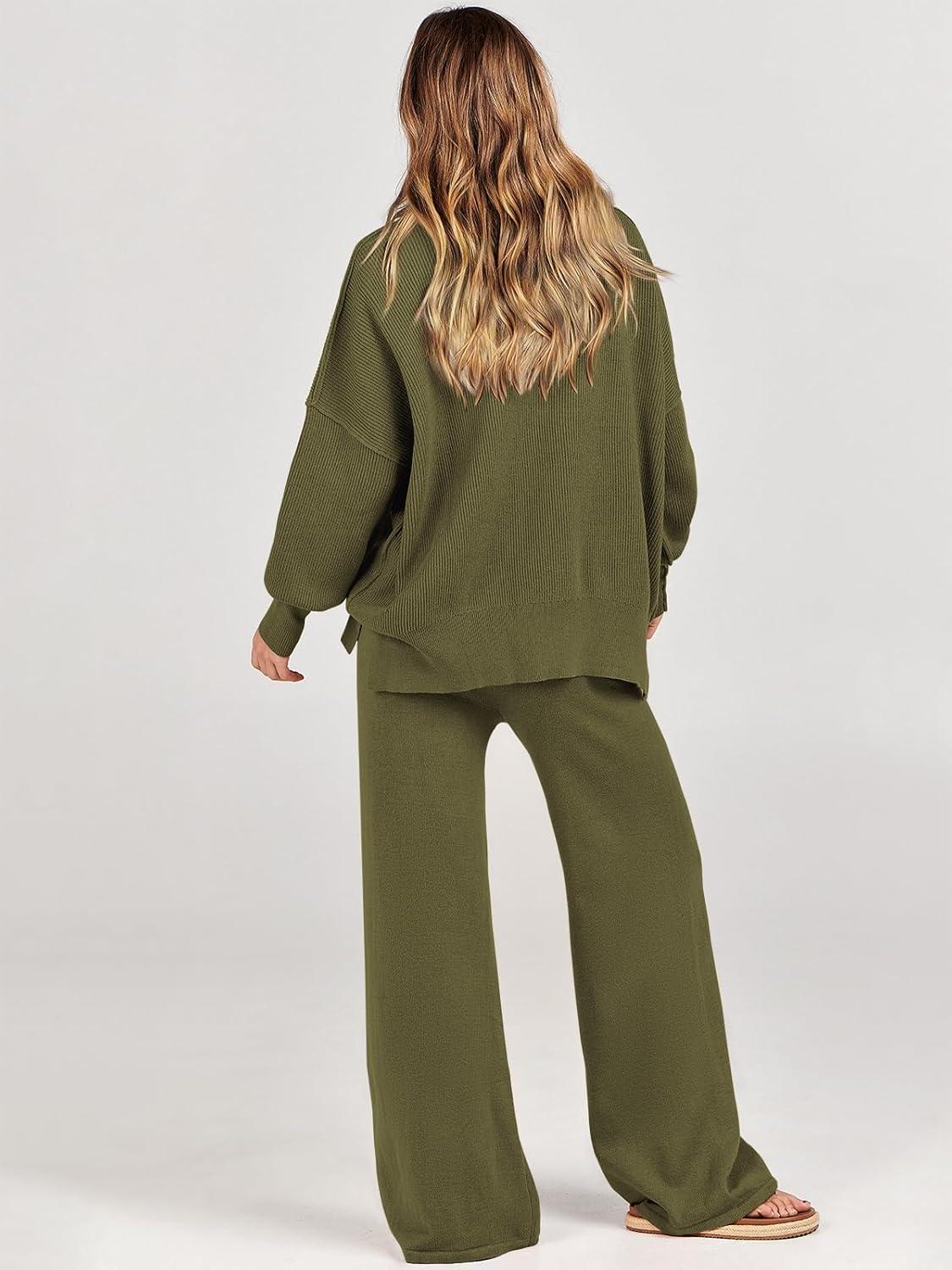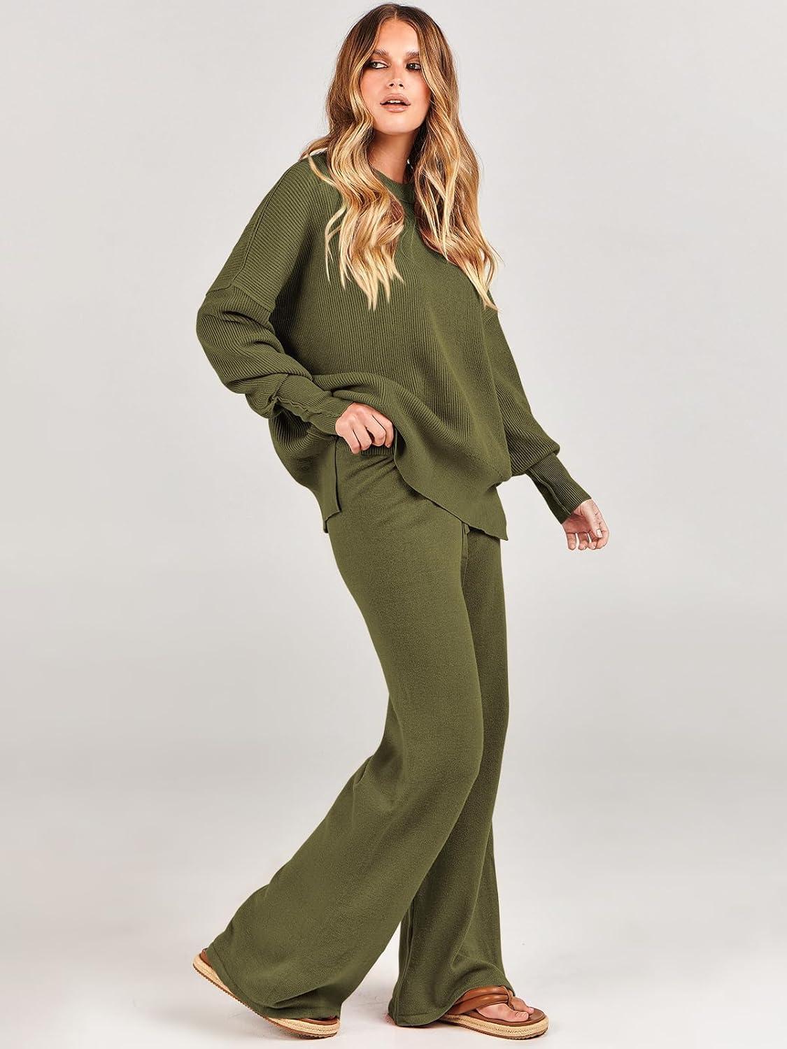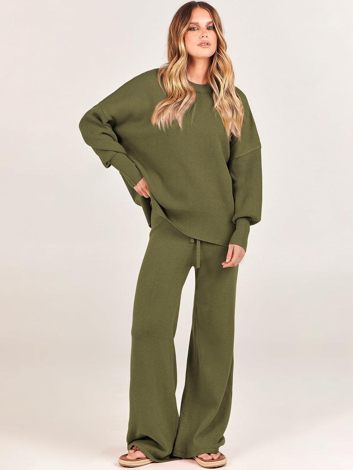 ANRABESS Womens 2 Piece Outfits Fall Lounge Set 2025 Oversized Chunky Knit Sweater Top Wide Leg Pants Loungewear Clothes(Olive)