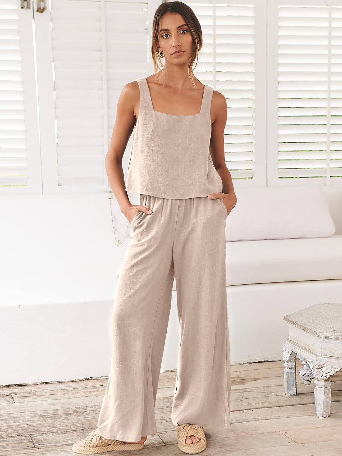 ANRABESS Women’s 2 Piece Outfits Linen Pants Jumpsuit Matching Lounge Set Casual Summer Beach Vacation Trendy Clothes(Apricot)