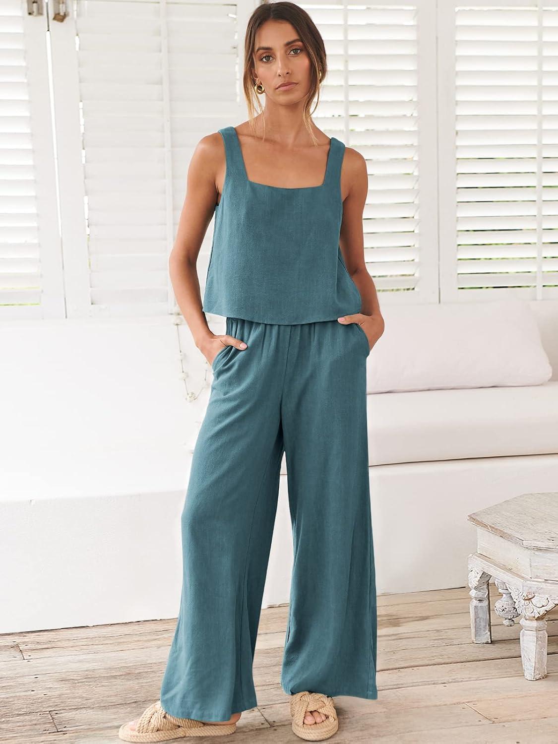 ANRABESS Women’s 2 Piece Outfits Linen Pants Jumpsuit Matching Lounge Set Casual Summer Beach Vacation Trendy Clothes(Grey Blue)