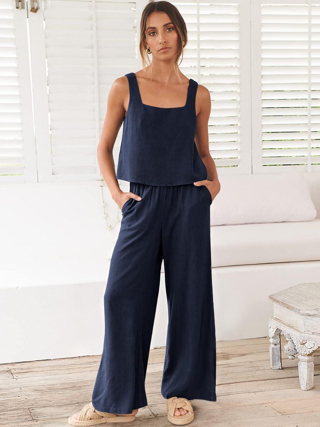 ANRABESS Women’s 2 Piece Outfits Linen Pants Jumpsuit Matching Lounge Set Casual Summer Beach Vacation Trendy Clothes(Navy Blue)