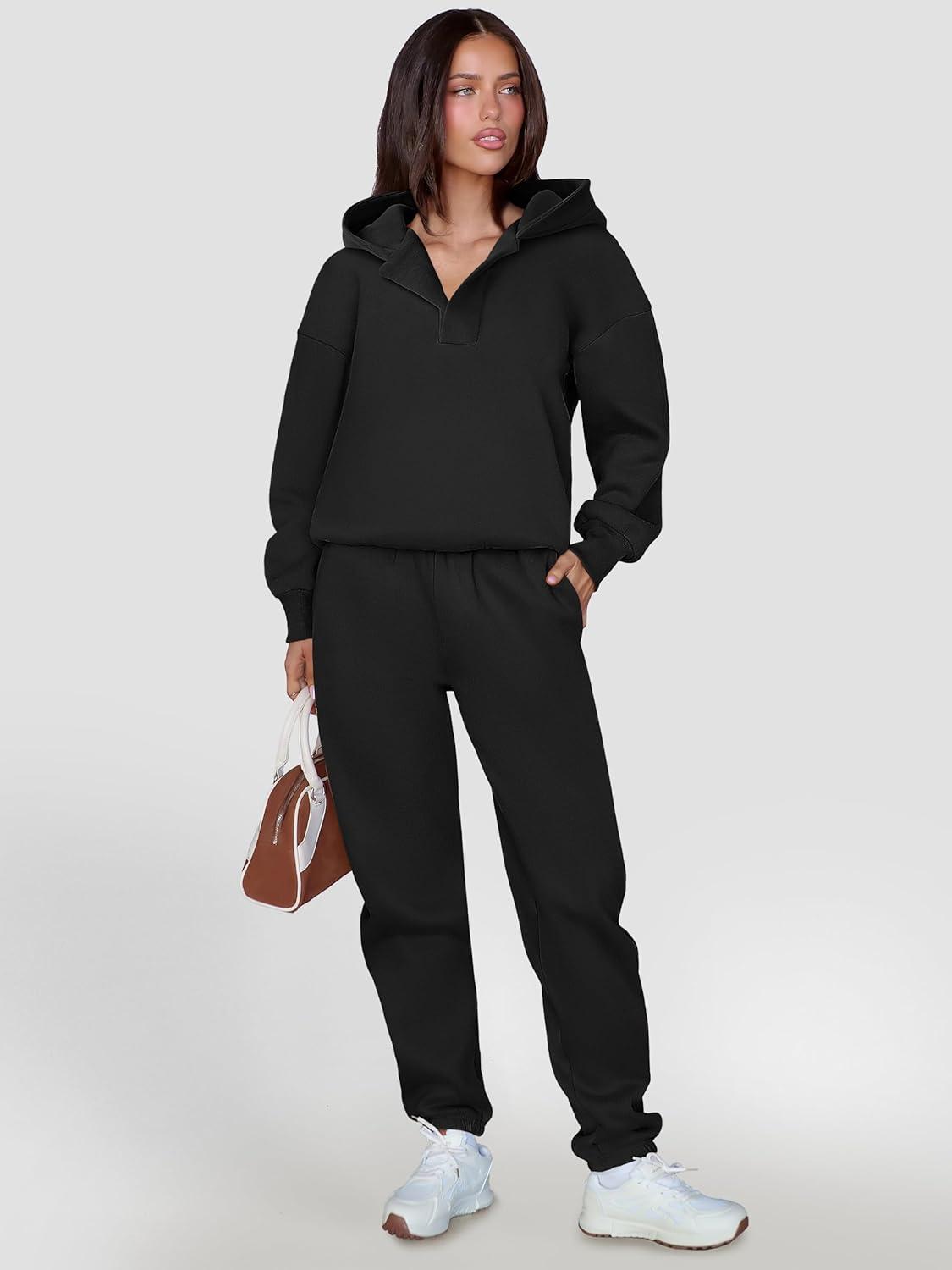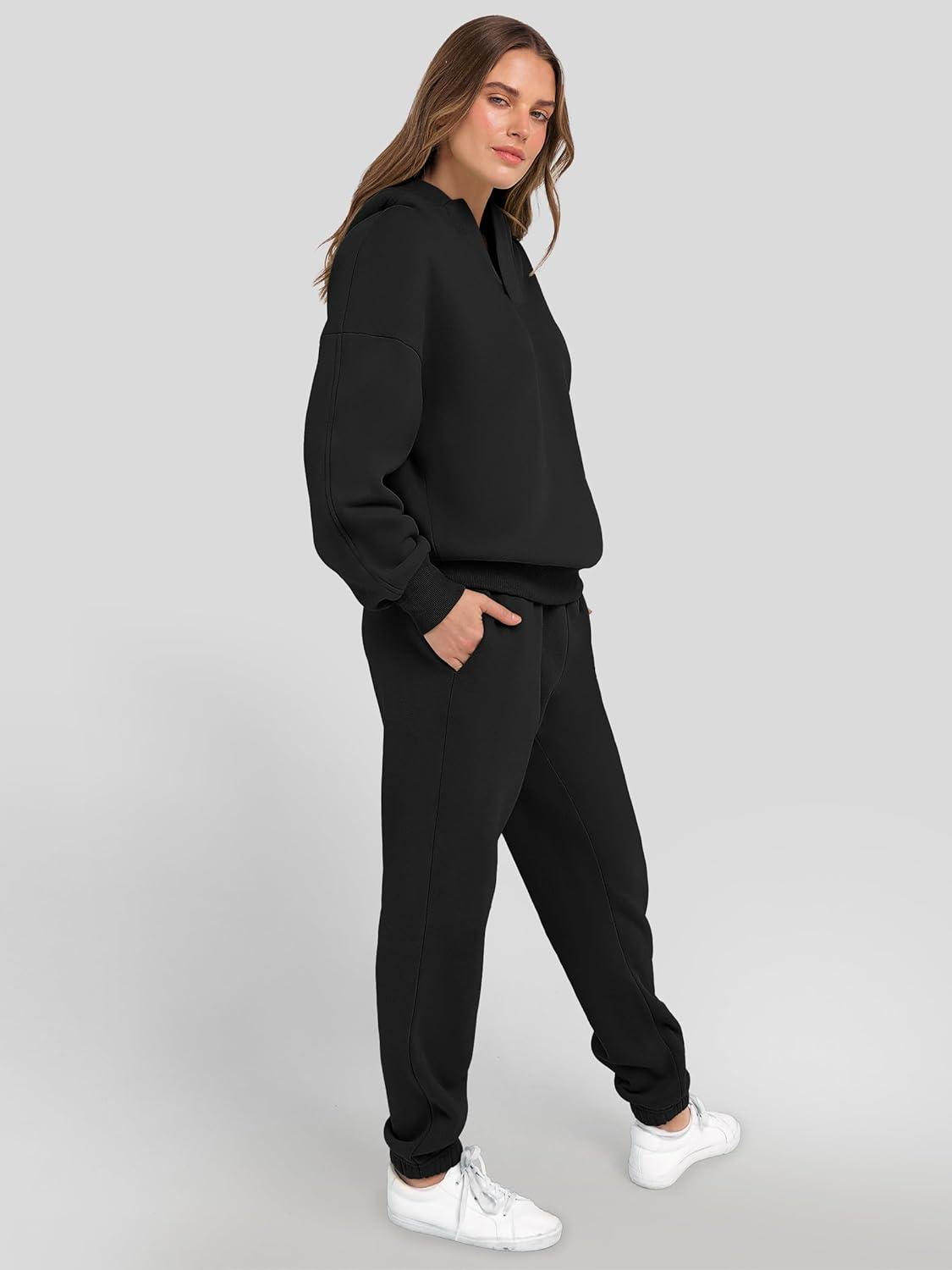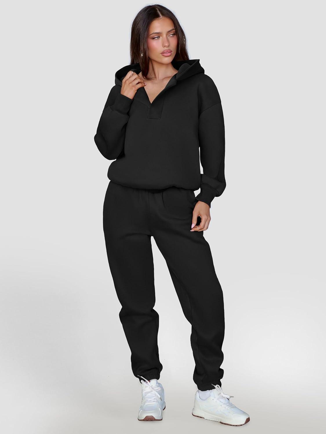 ANRABESS Womens 2 Piece Outfits Lounge Hoodie Oversized Sweatshirt V Neck Pullover Jogger Sweatpants 2025 Fall Matching Set(Black)