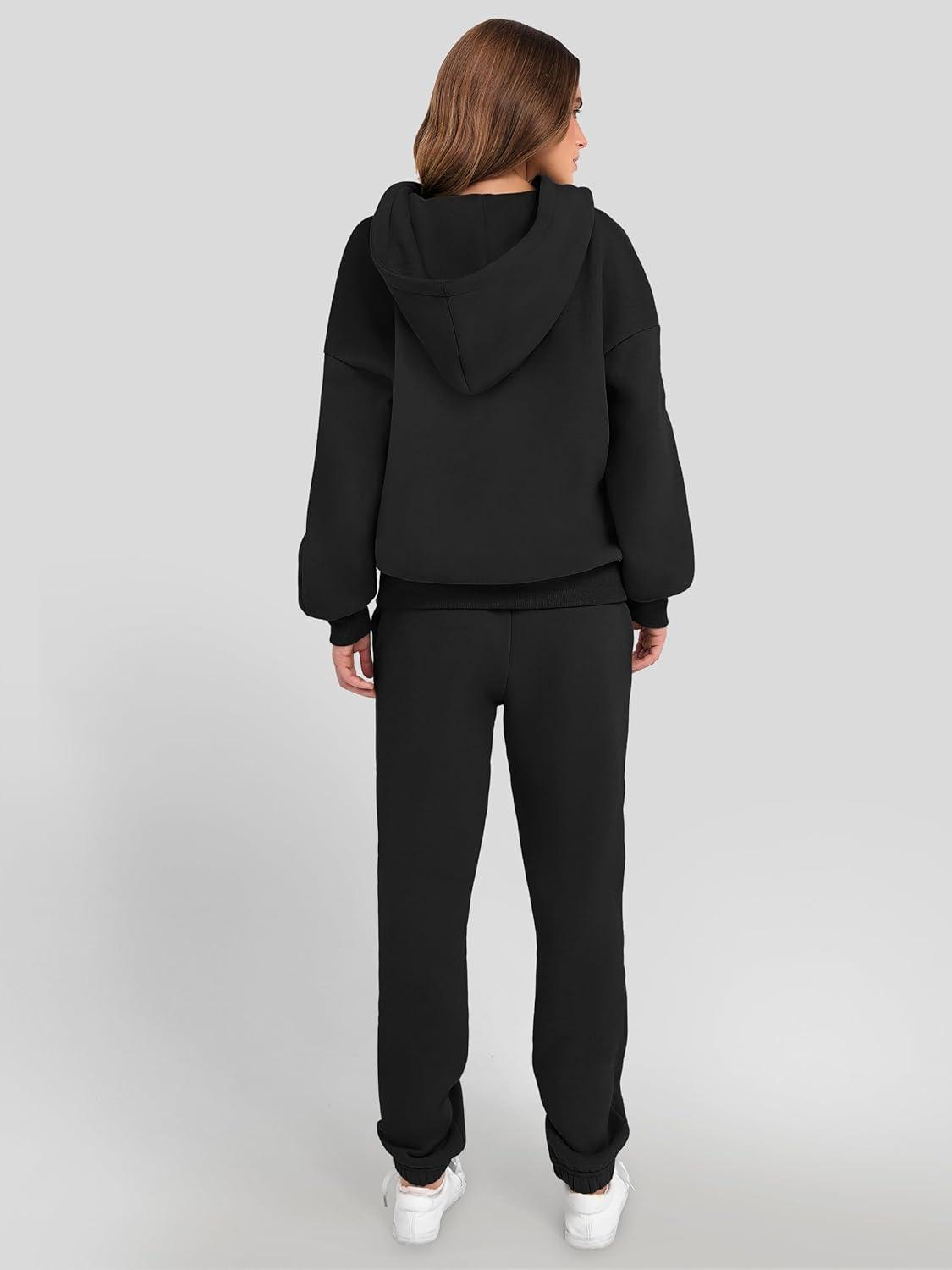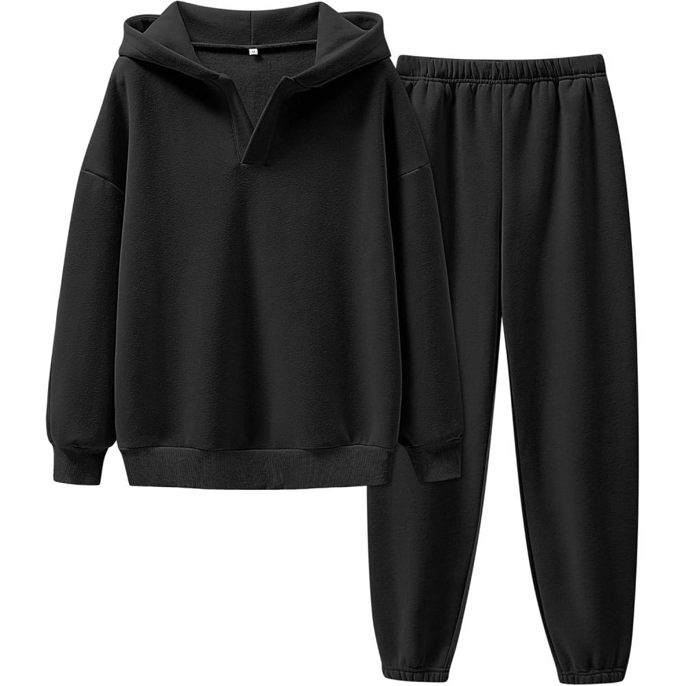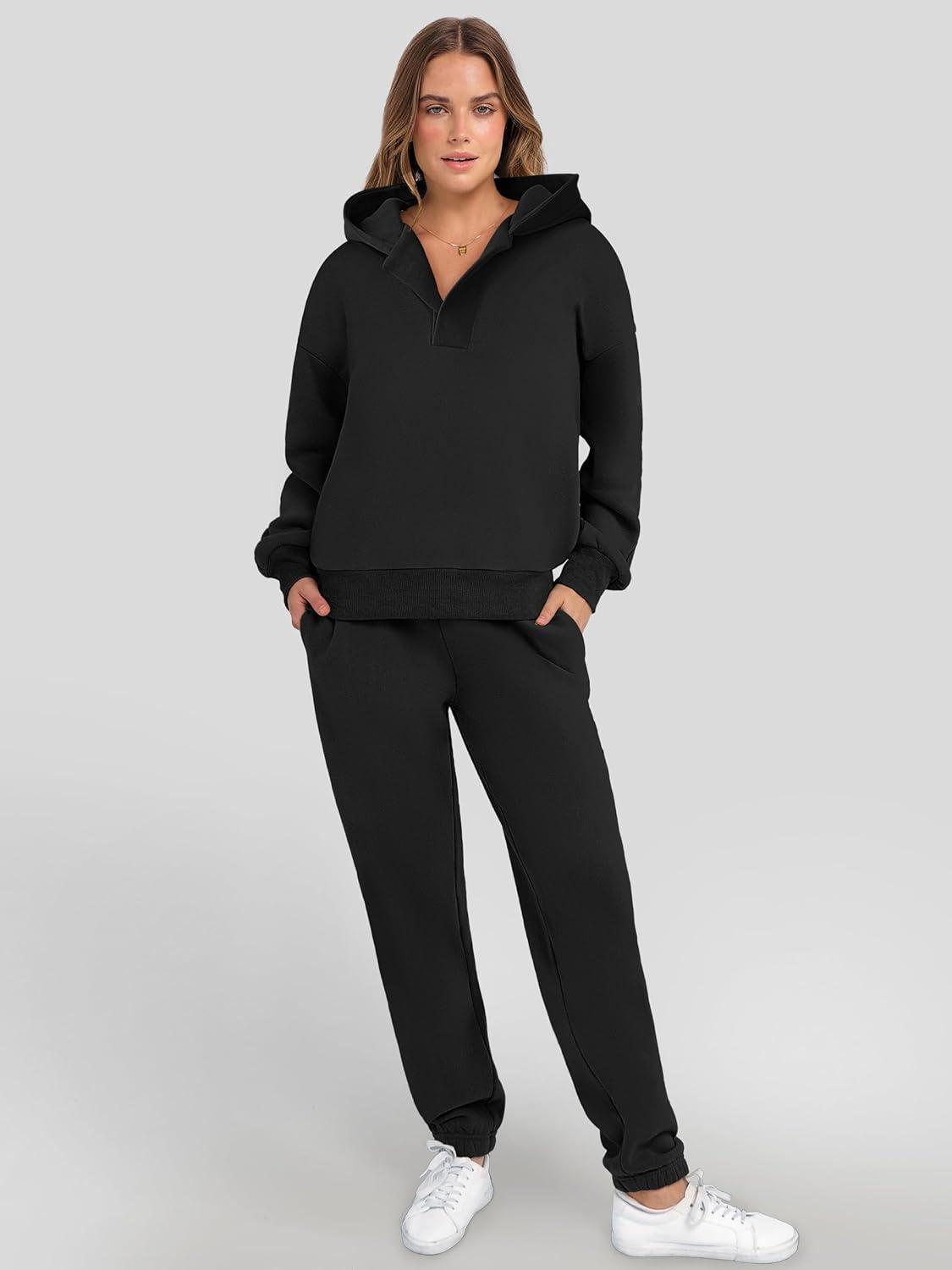 ANRABESS Womens 2 Piece Outfits Lounge Hoodie Oversized Sweatshirt V Neck Pullover Jogger Sweatpants 2025 Fall Matching Set(Black)