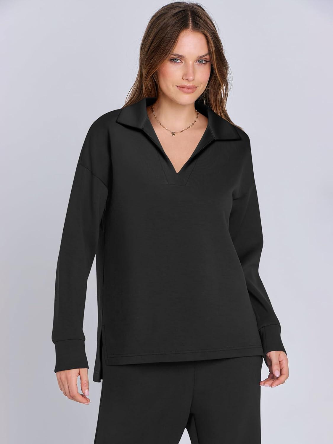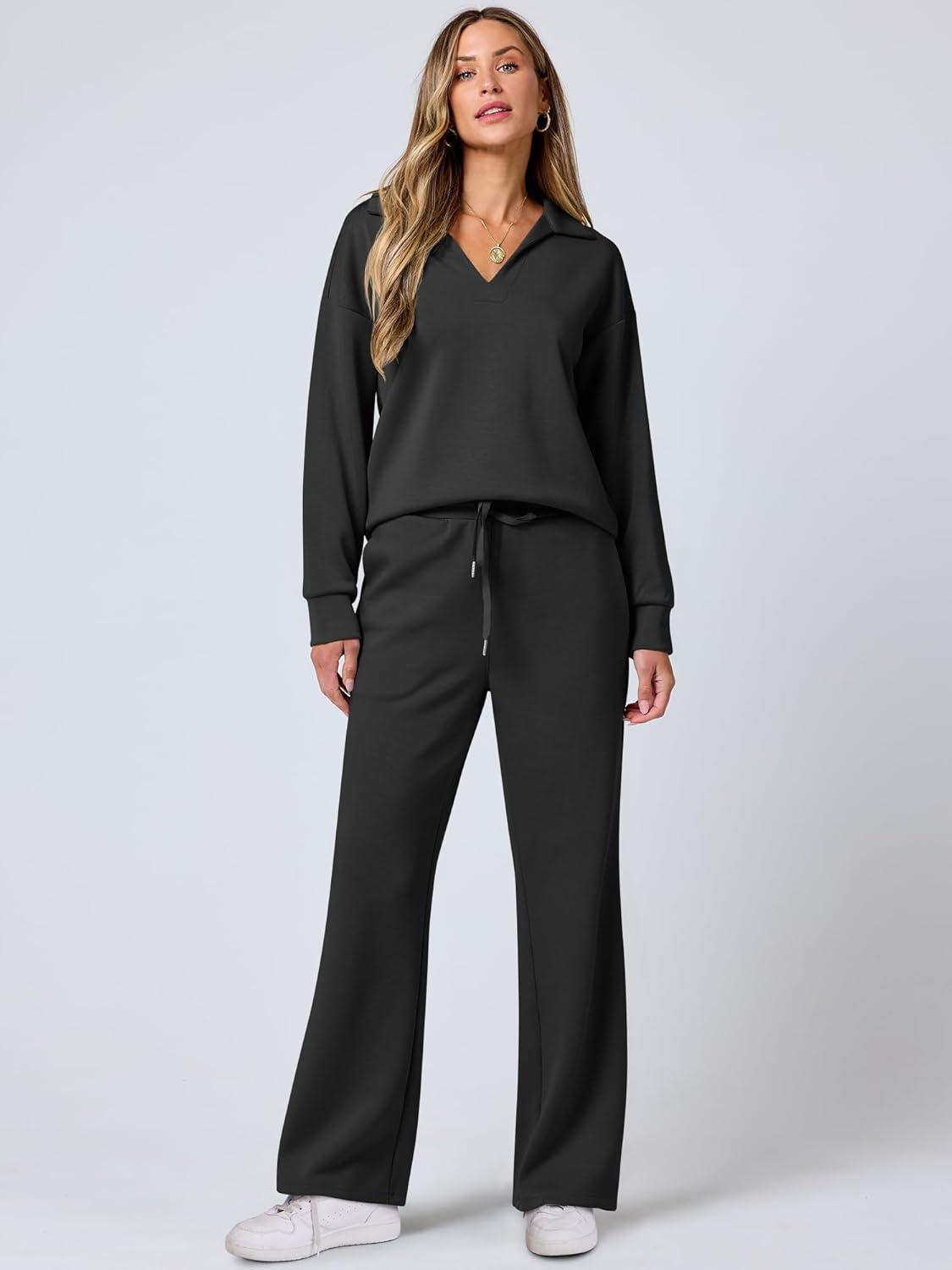 ANRABESS Women’s 2 Piece Outfits Lounge Sets Casual Long Sleeve Sweatsuits Polo Top Wide Leg Pants Fall Sweat Matching Sets(Black)