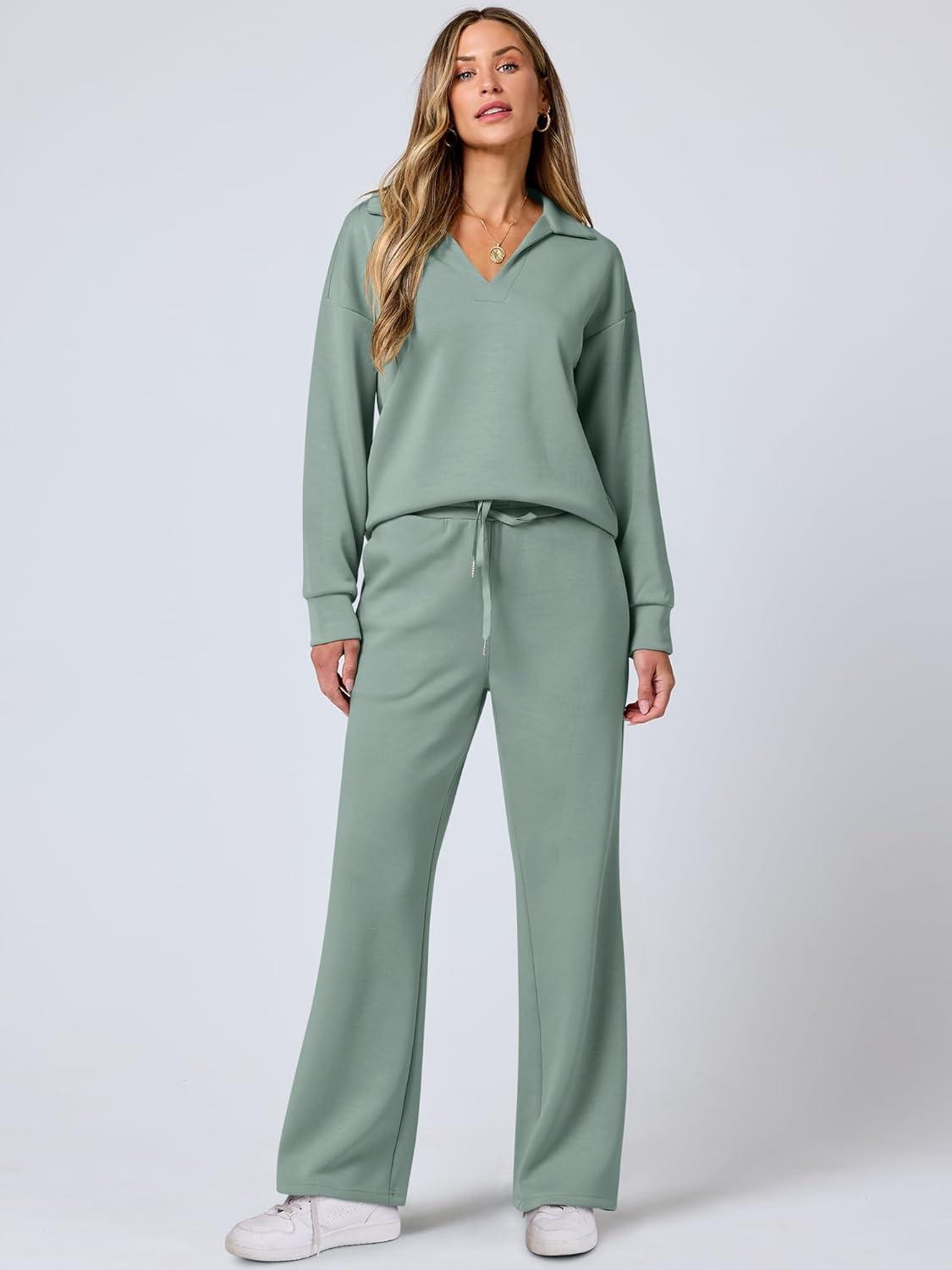ANRABESS Women’s 2 Piece Outfits Lounge Sets Casual Long Sleeve Sweatsuits Polo Top Wide Leg Pants Fall Sweat Matching Sets(Pea Green)