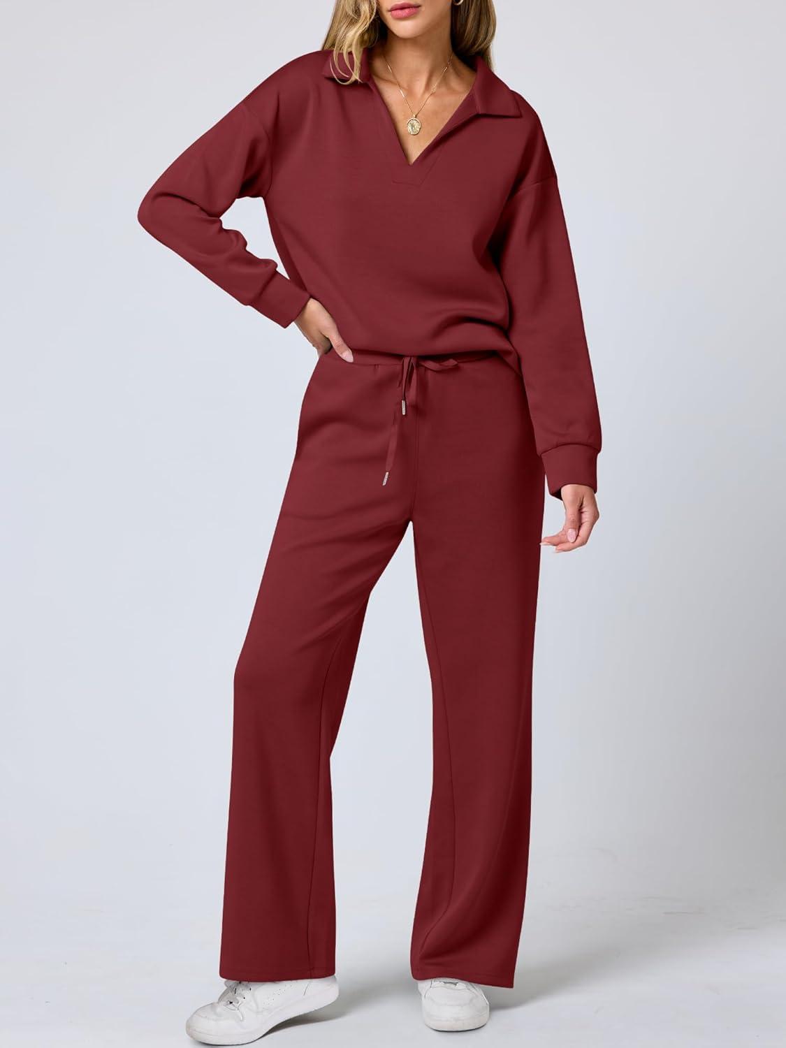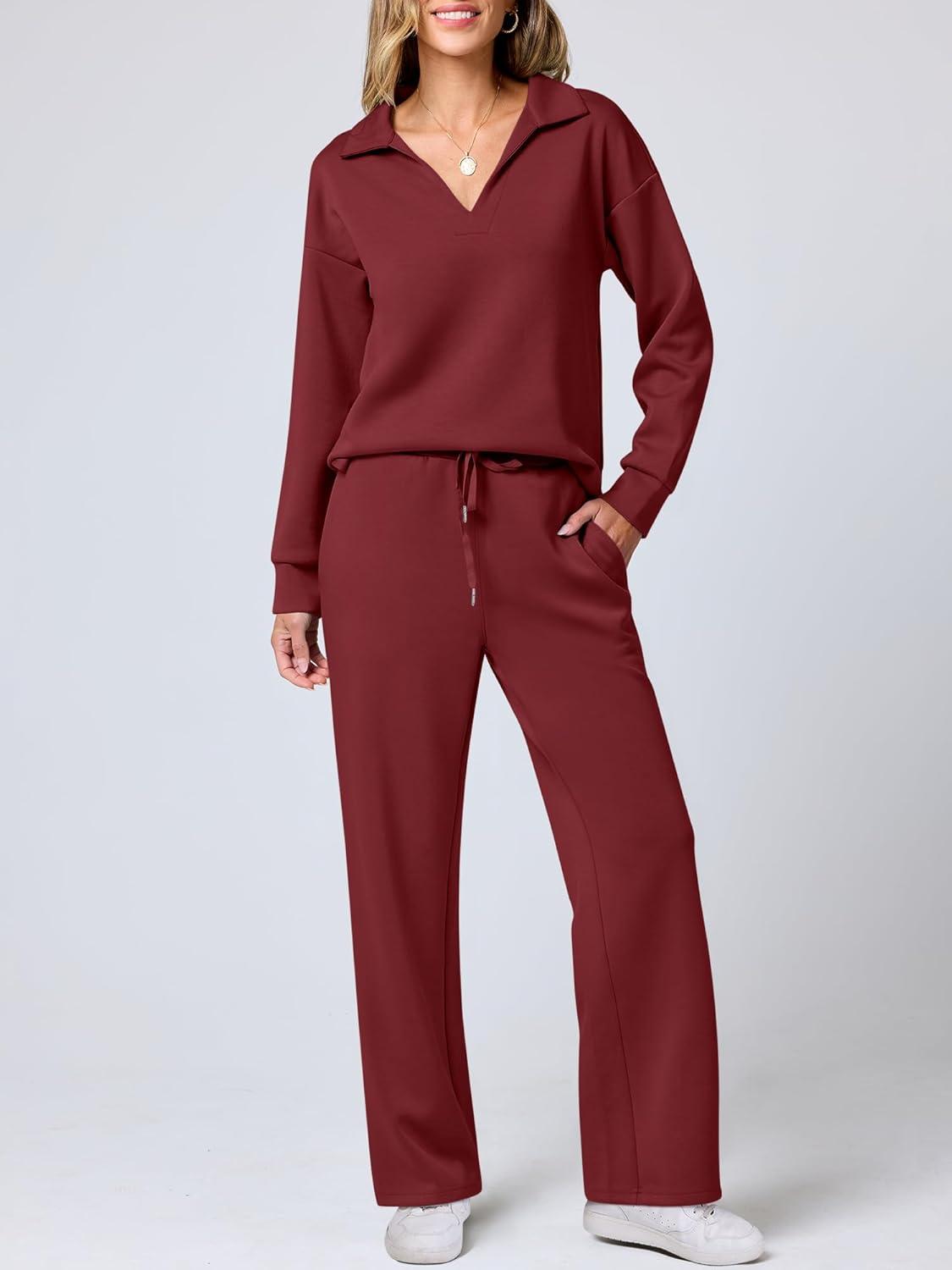 ANRABESS Women’s 2 Piece Outfits Lounge Sets Casual Long Sleeve Sweatsuits Polo Top Wide Leg Pants Fall Sweat Matching Sets(Wine Red)
