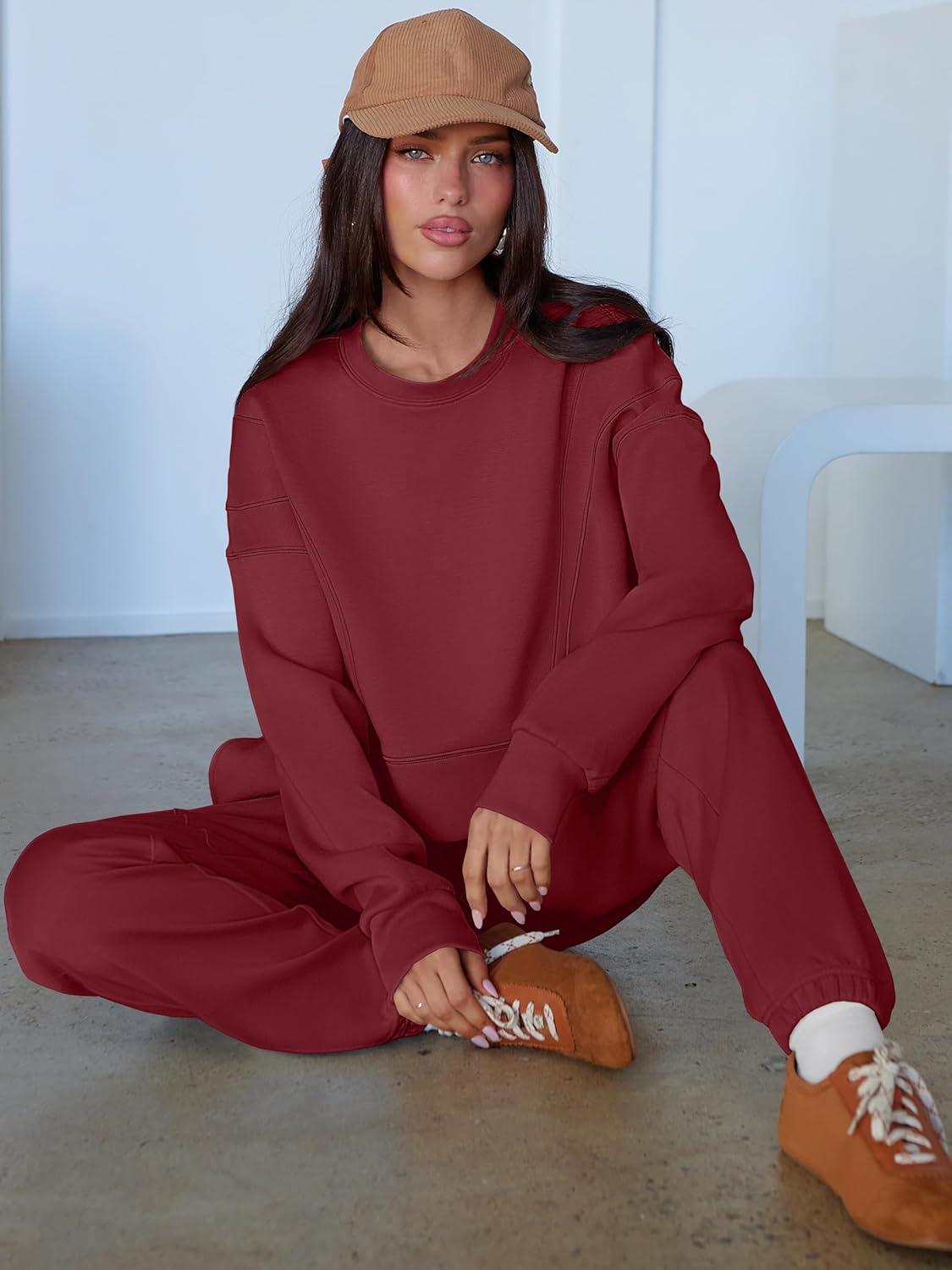 ANRABESS Womens 2 Piece Outfits Lounge Sets Cropped Sweatshirt Joggers Fashion Sweatsuit Sweat Set 2025 Winter Travel Outfits(Wine Red)