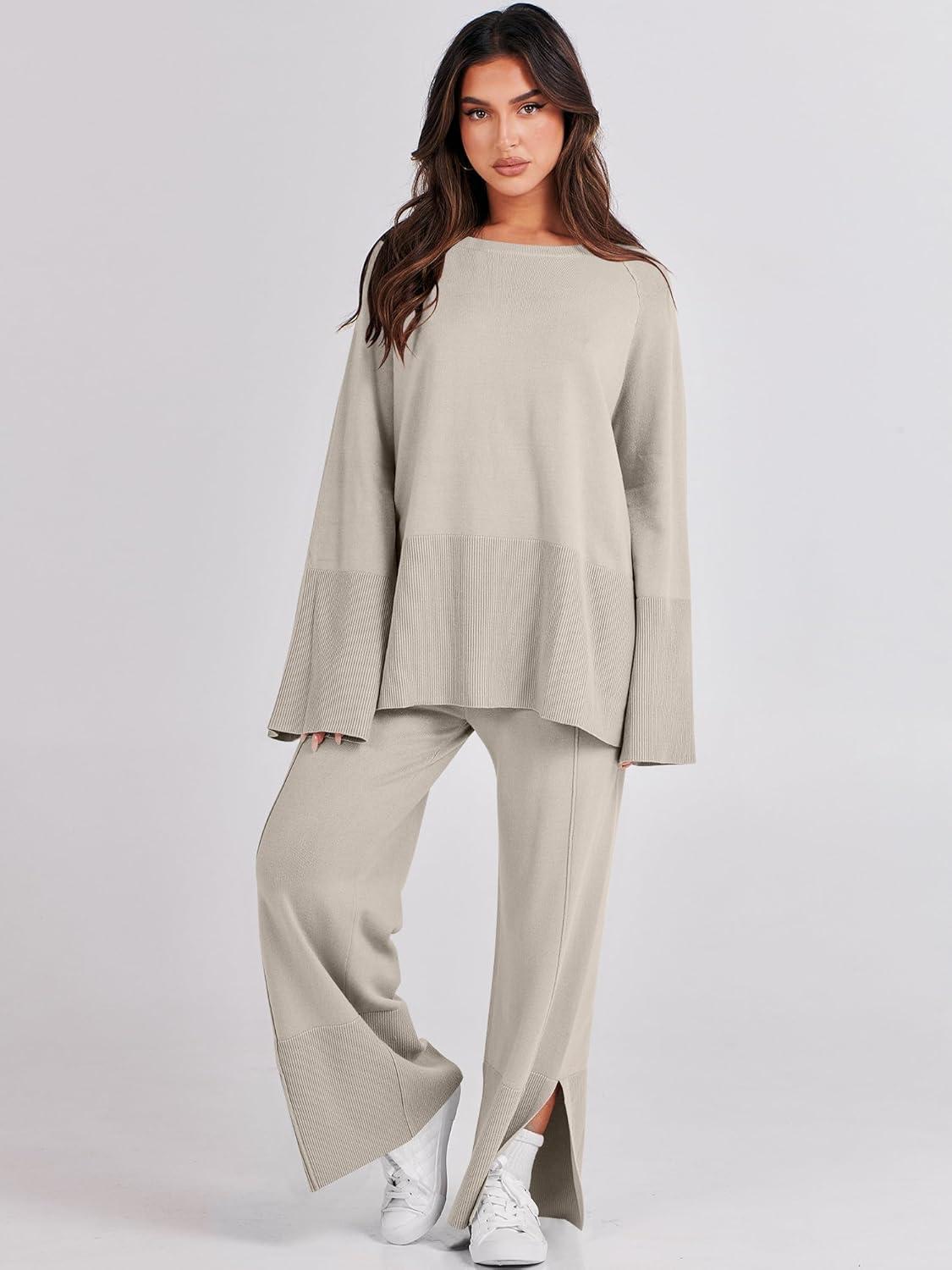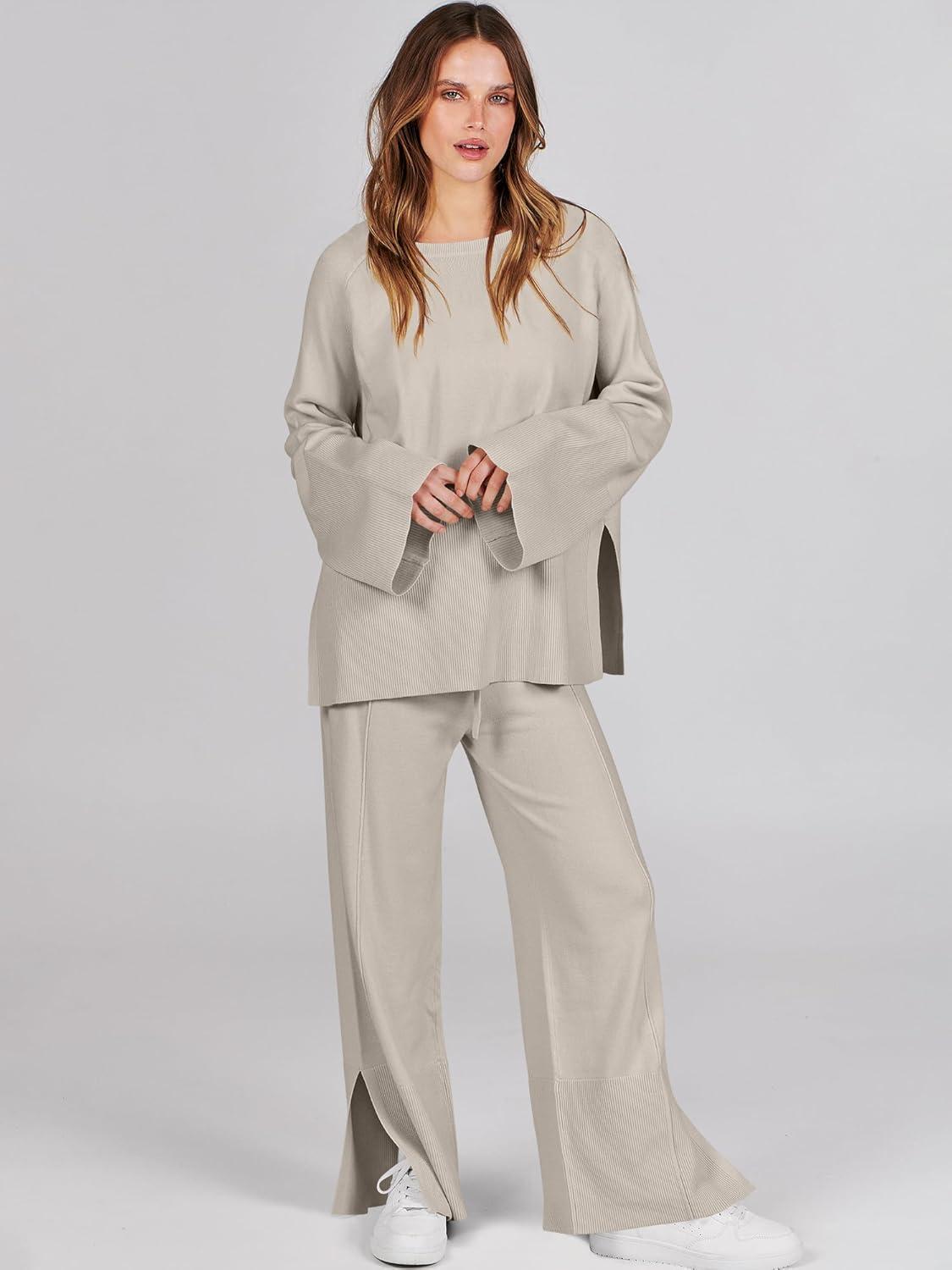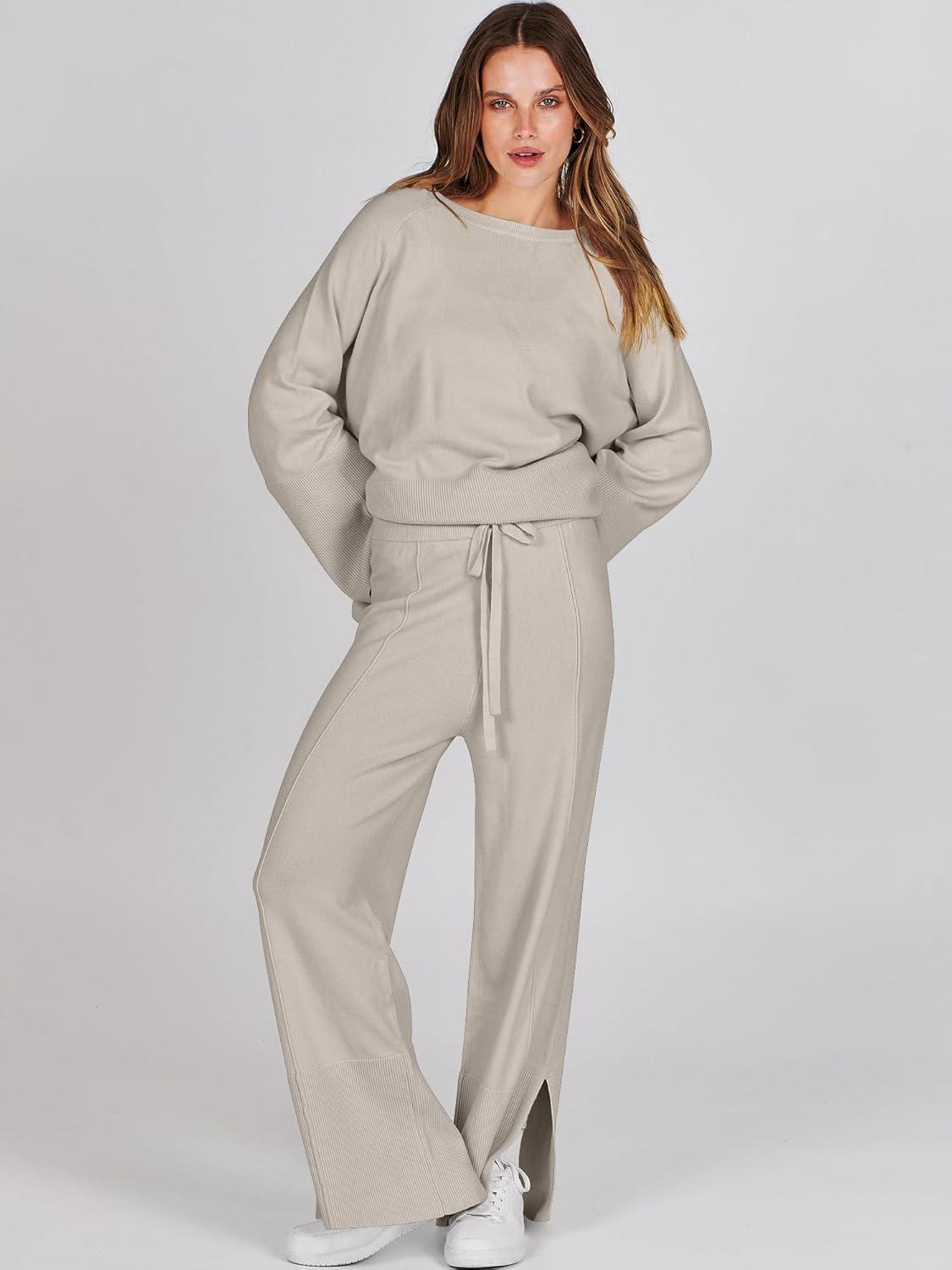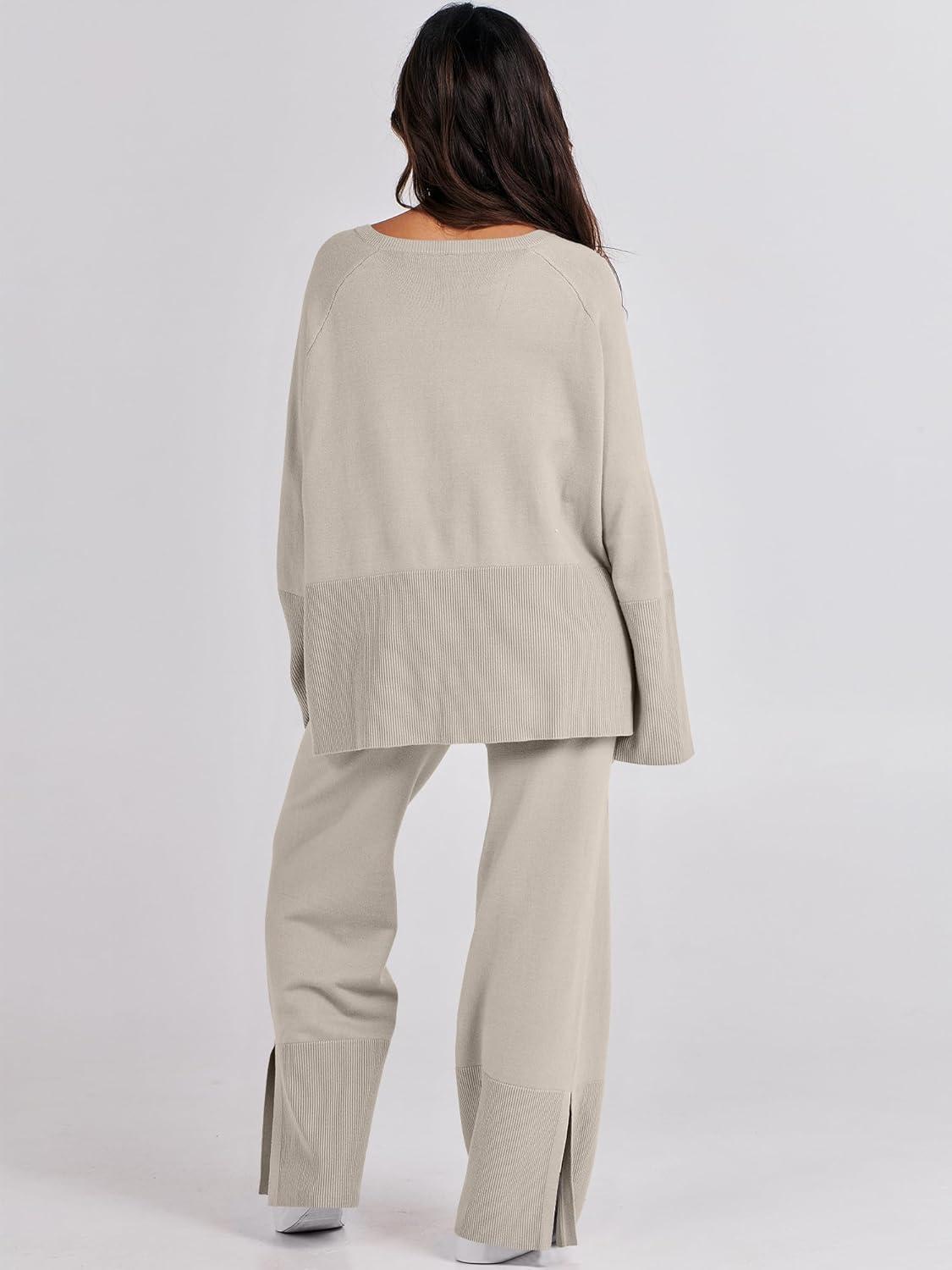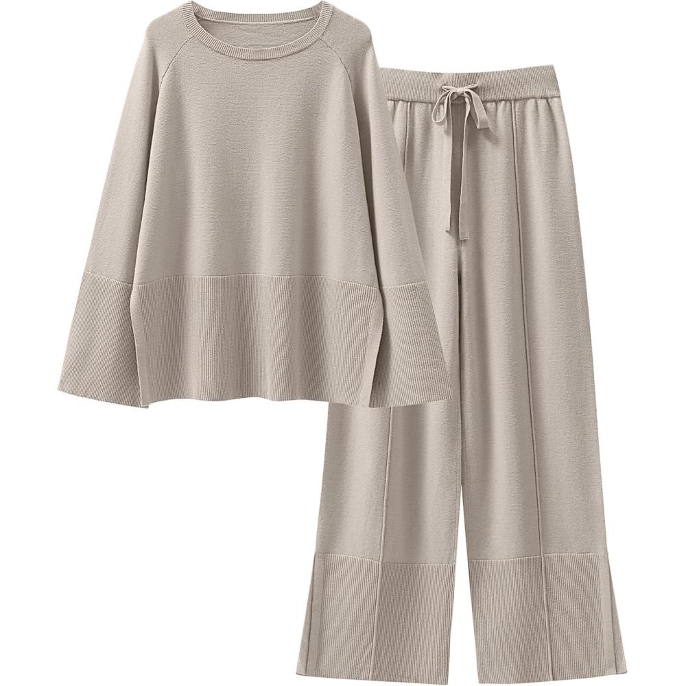 ANRABESS Womens 2 Piece Outfits Oversized Knit Sweater Set Wide Leg Pant Cozy Lounge Matching Pajama Sets 2025 Trendy Clothes(Grey Apricot)