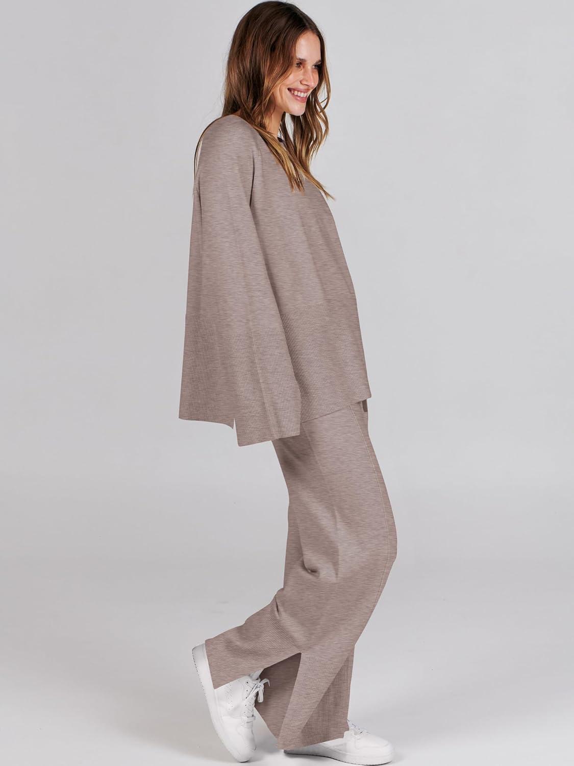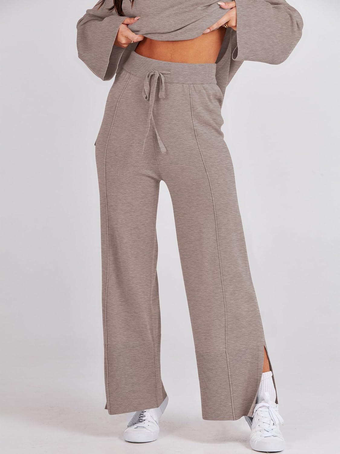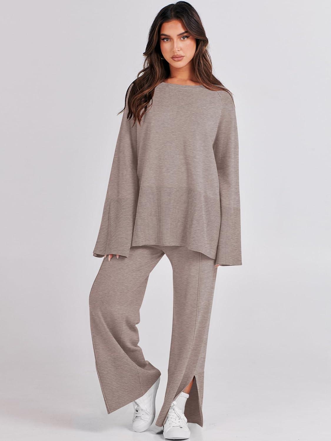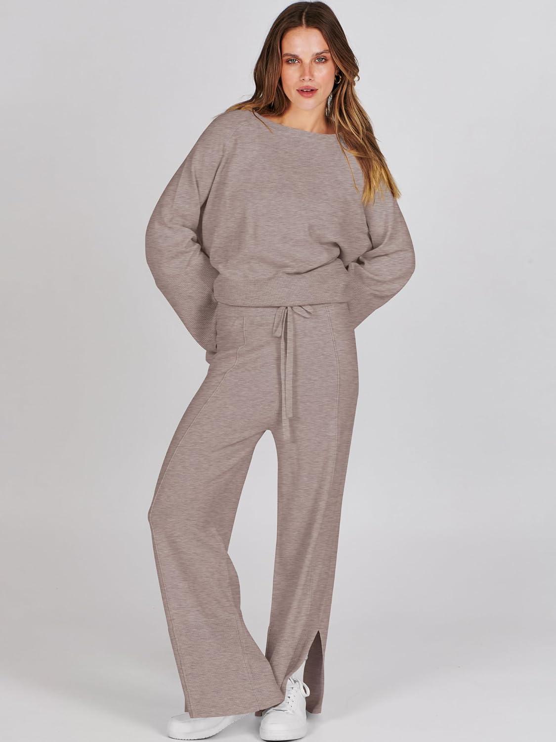 ANRABESS Womens 2 Piece Outfits Oversized Knit Sweater Set Wide Leg Pant Cozy Lounge Matching Pajama Sets 2025 Trendy Clothes(Red Apricot)