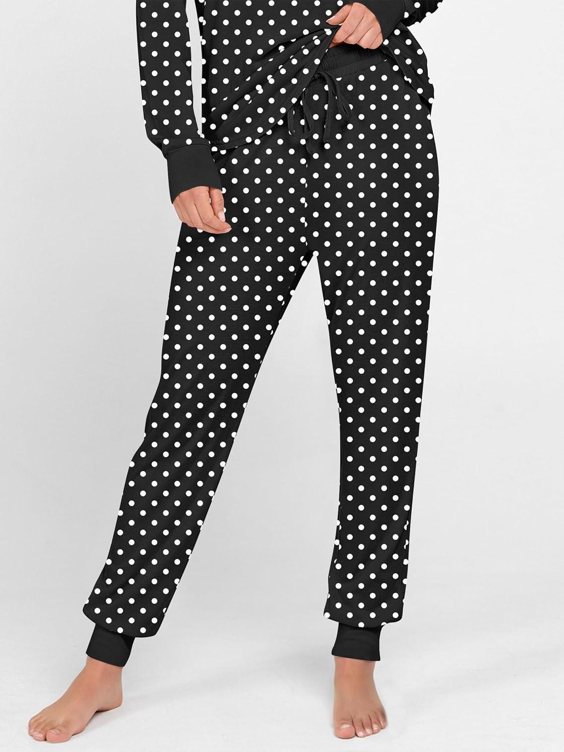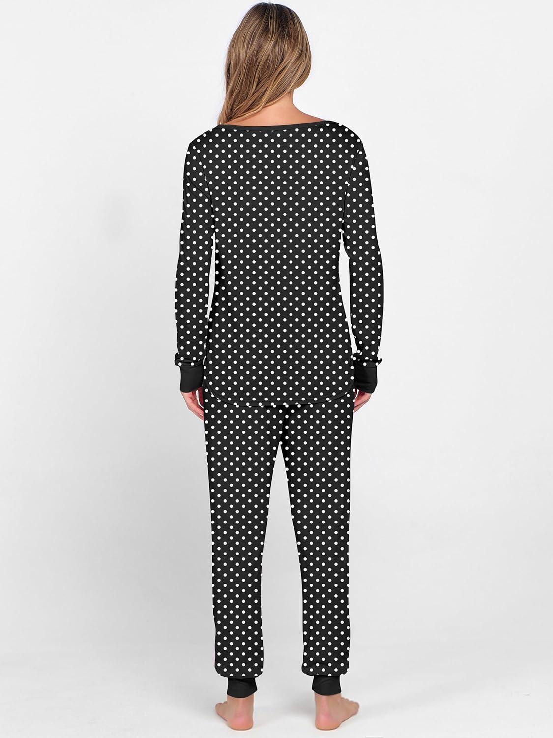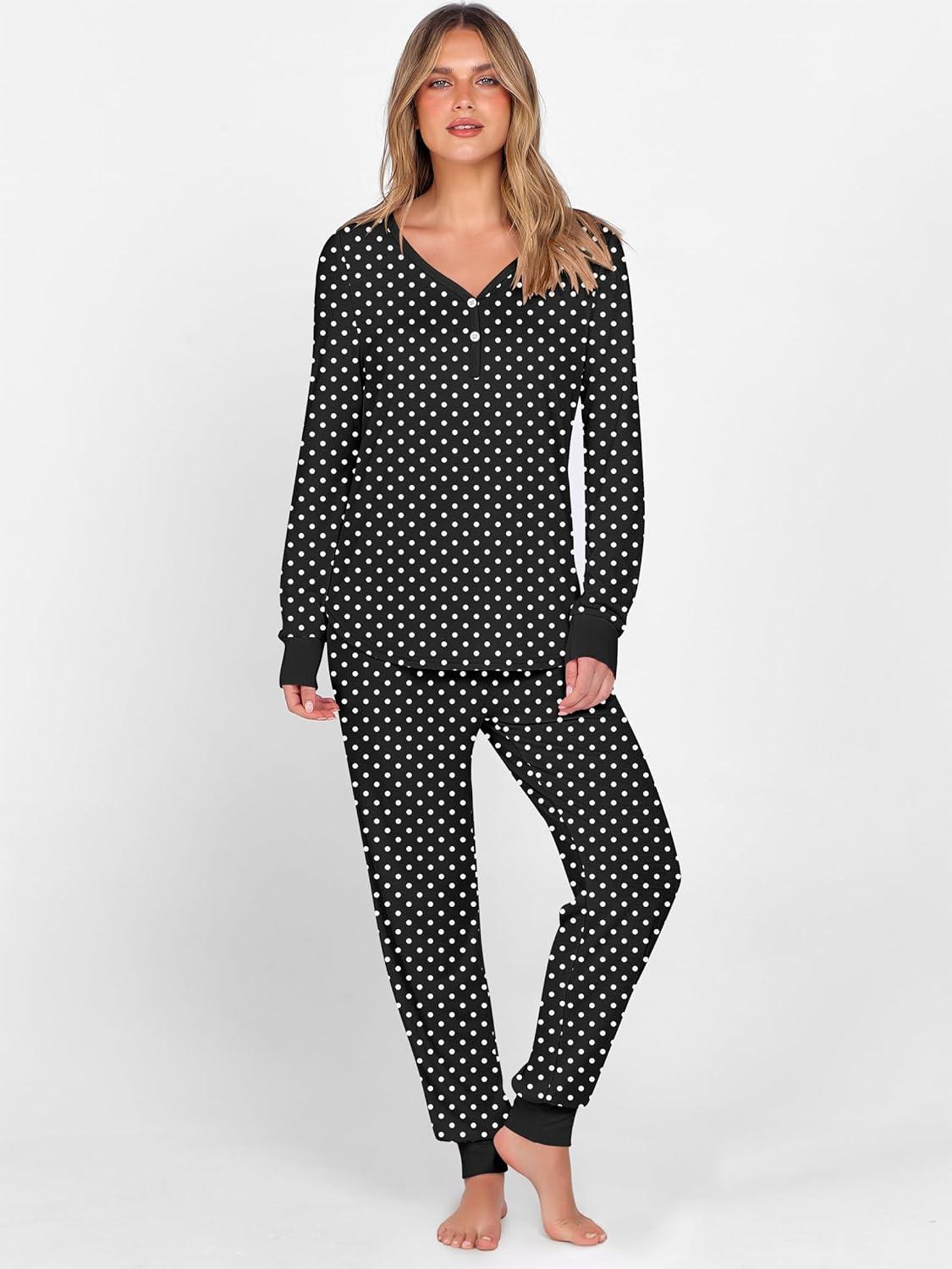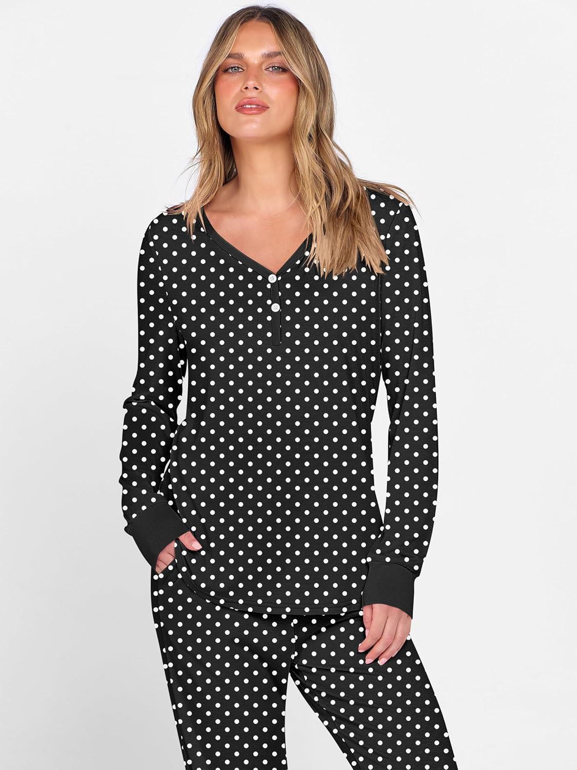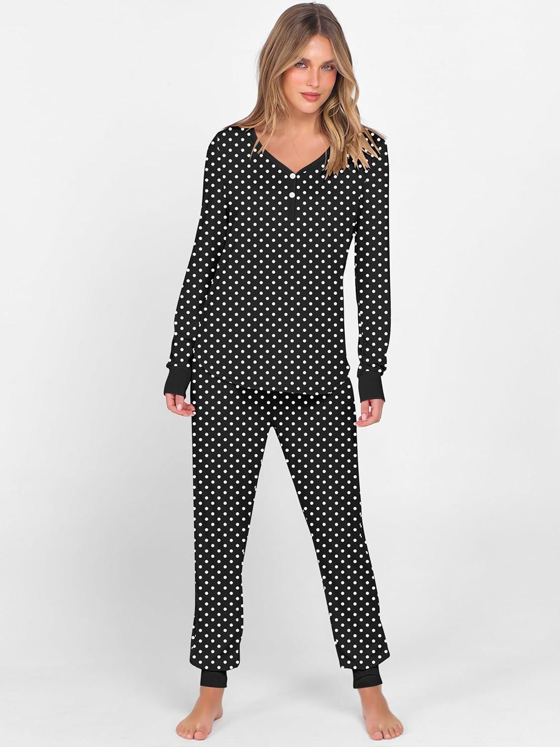 ANRABESS Women’s 2 Piece Outfits Pajama Sets Long Sleeve Henley Tops Sweatpants Matching Lounge Set 2025 Fall Pj Sleepwear(Black Spots Floral)
