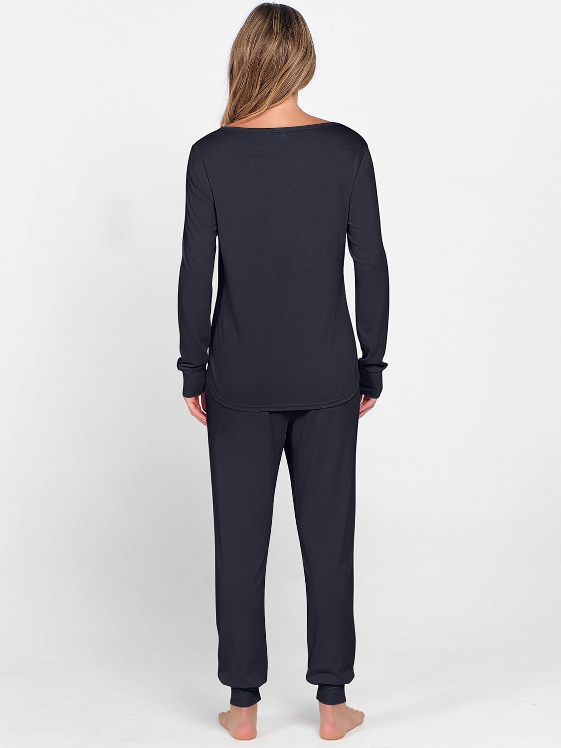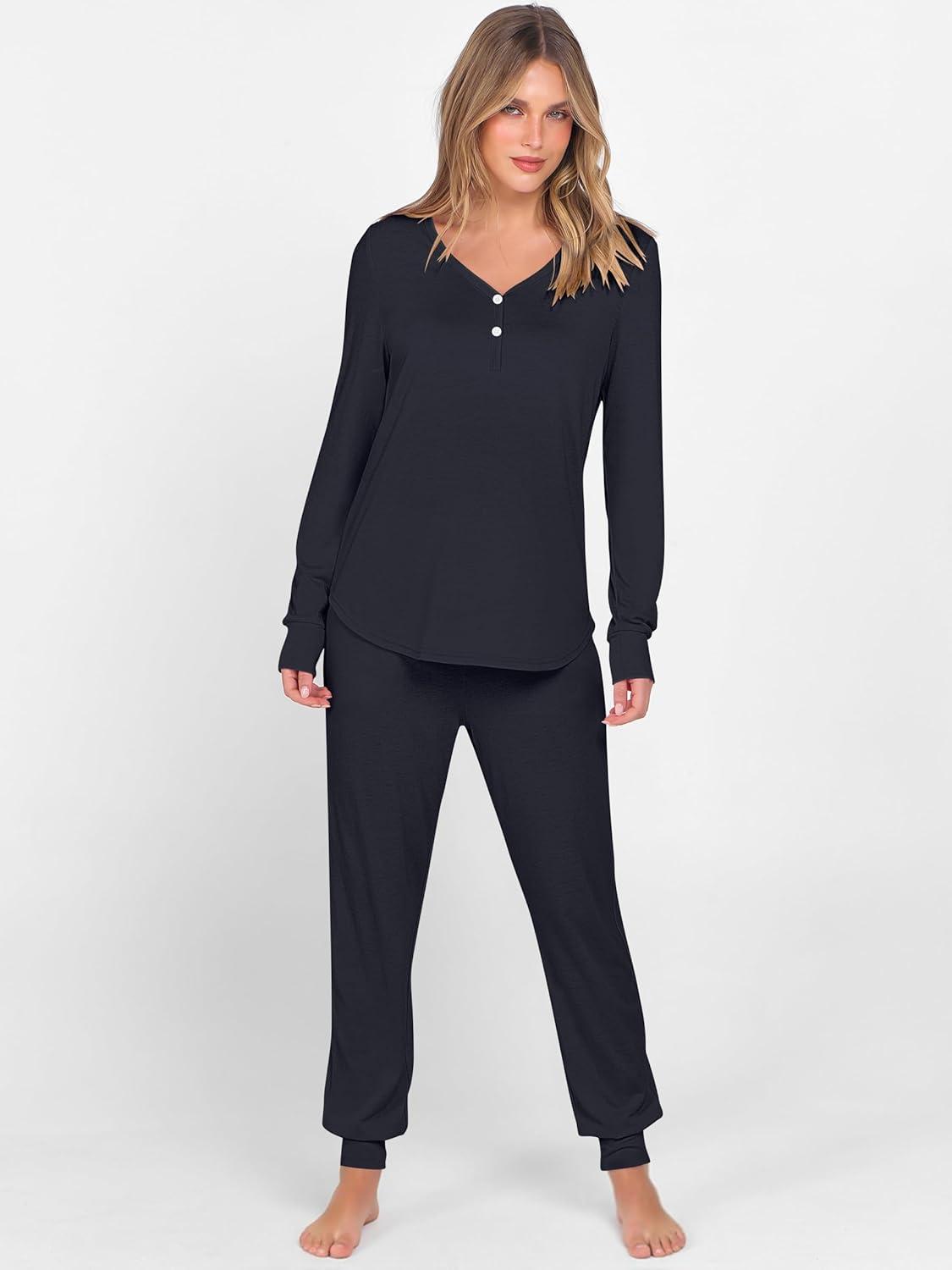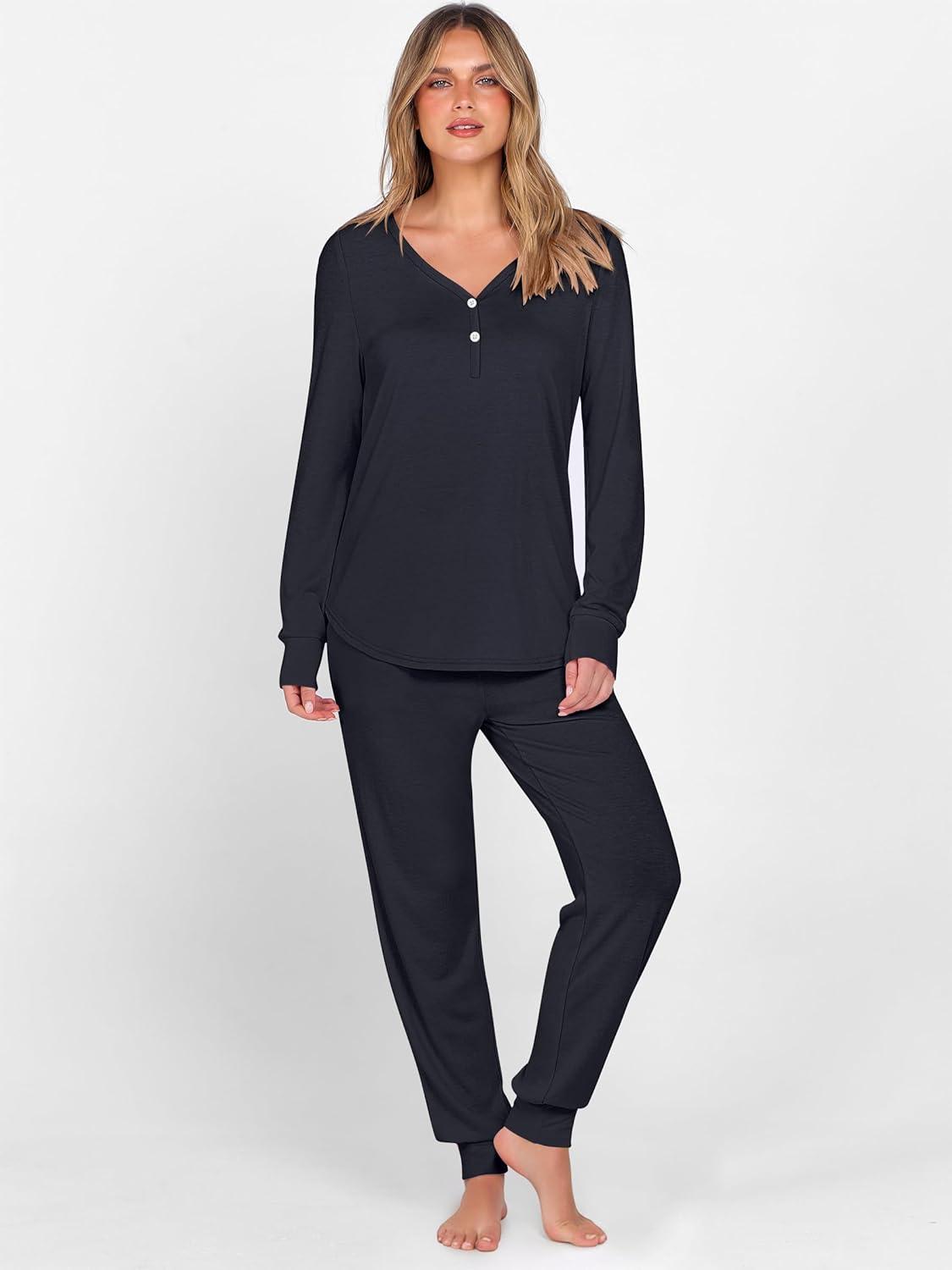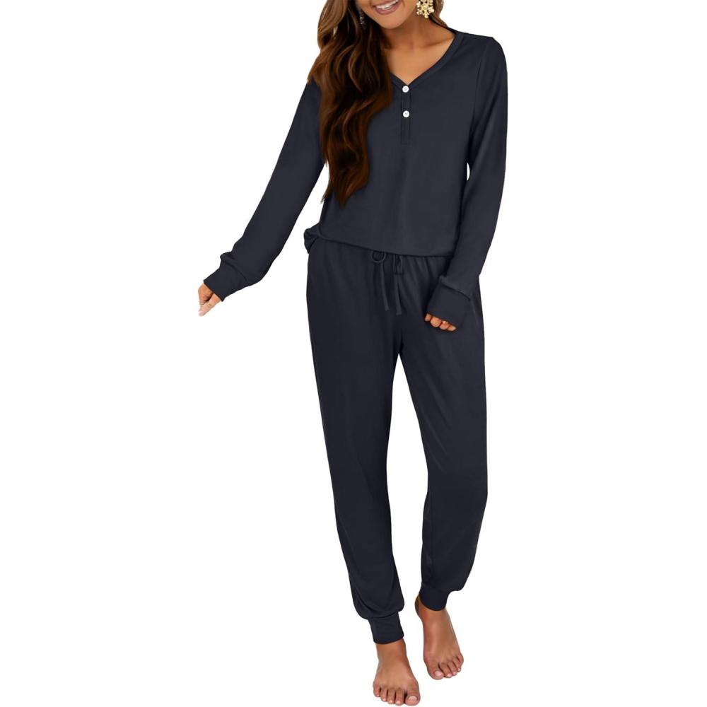 ANRABESS Women’s 2 Piece Outfits Pajama Sets Long Sleeve Henley Tops Sweatpants Matching Lounge Set 2025 Fall Pj Sleepwear(Deep Blue)