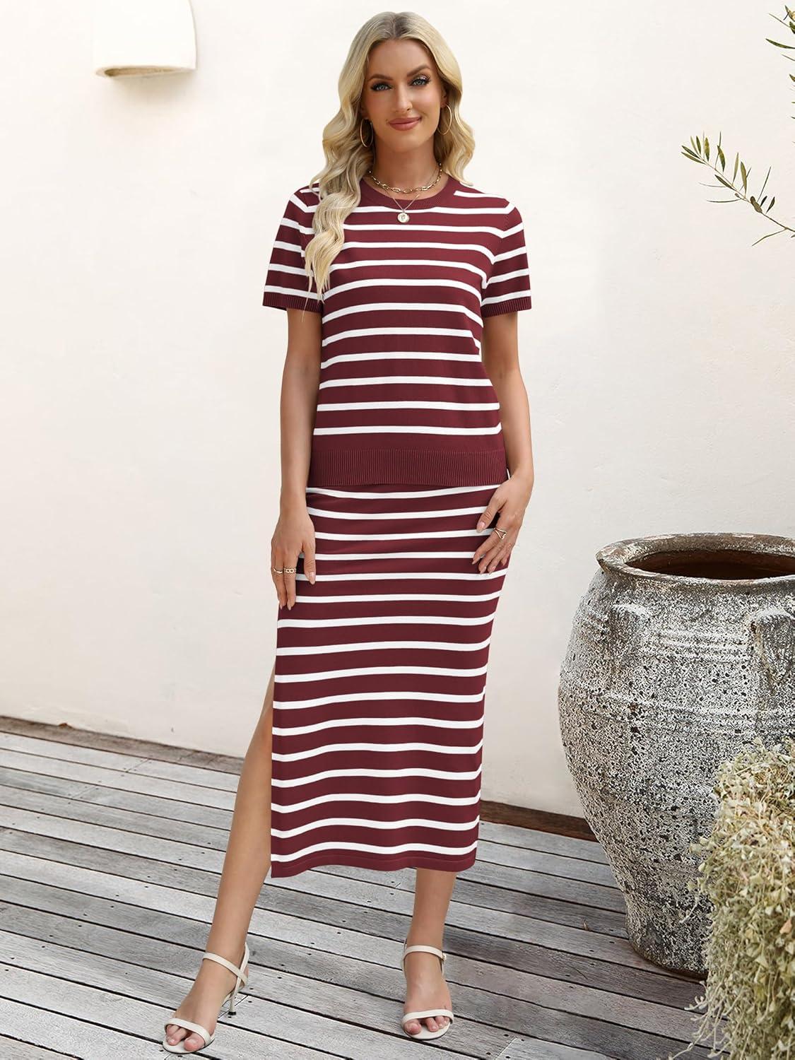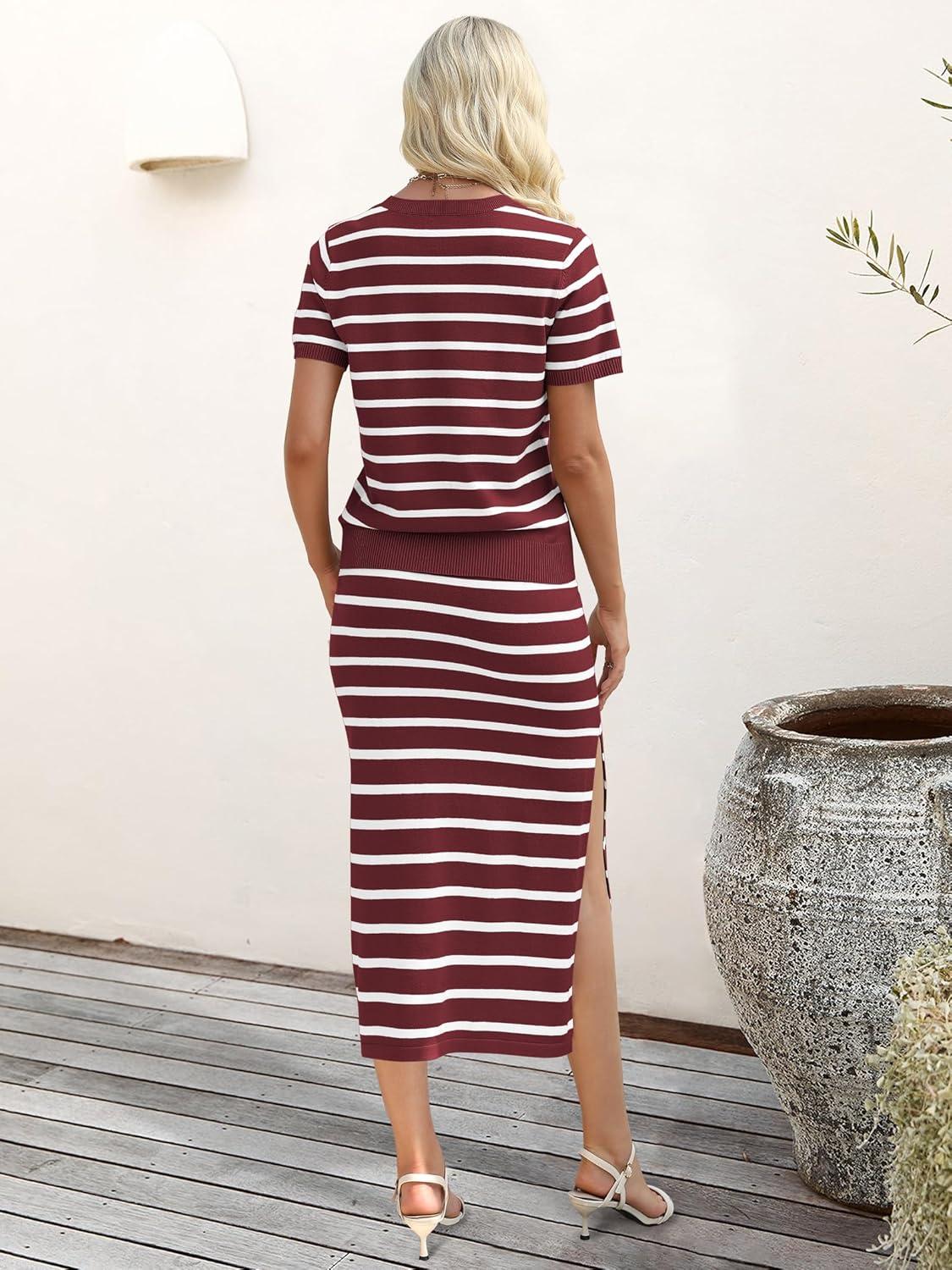 ANRABESS Womens 2 Piece Outfits Striped Sweater Skirt Sets 2025 Summer Casual Short Sleeve Pullover Tops Travel Midi Dress(Red White)
