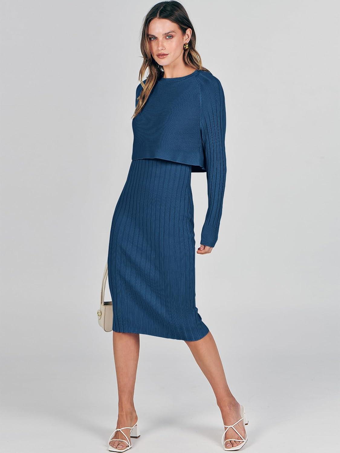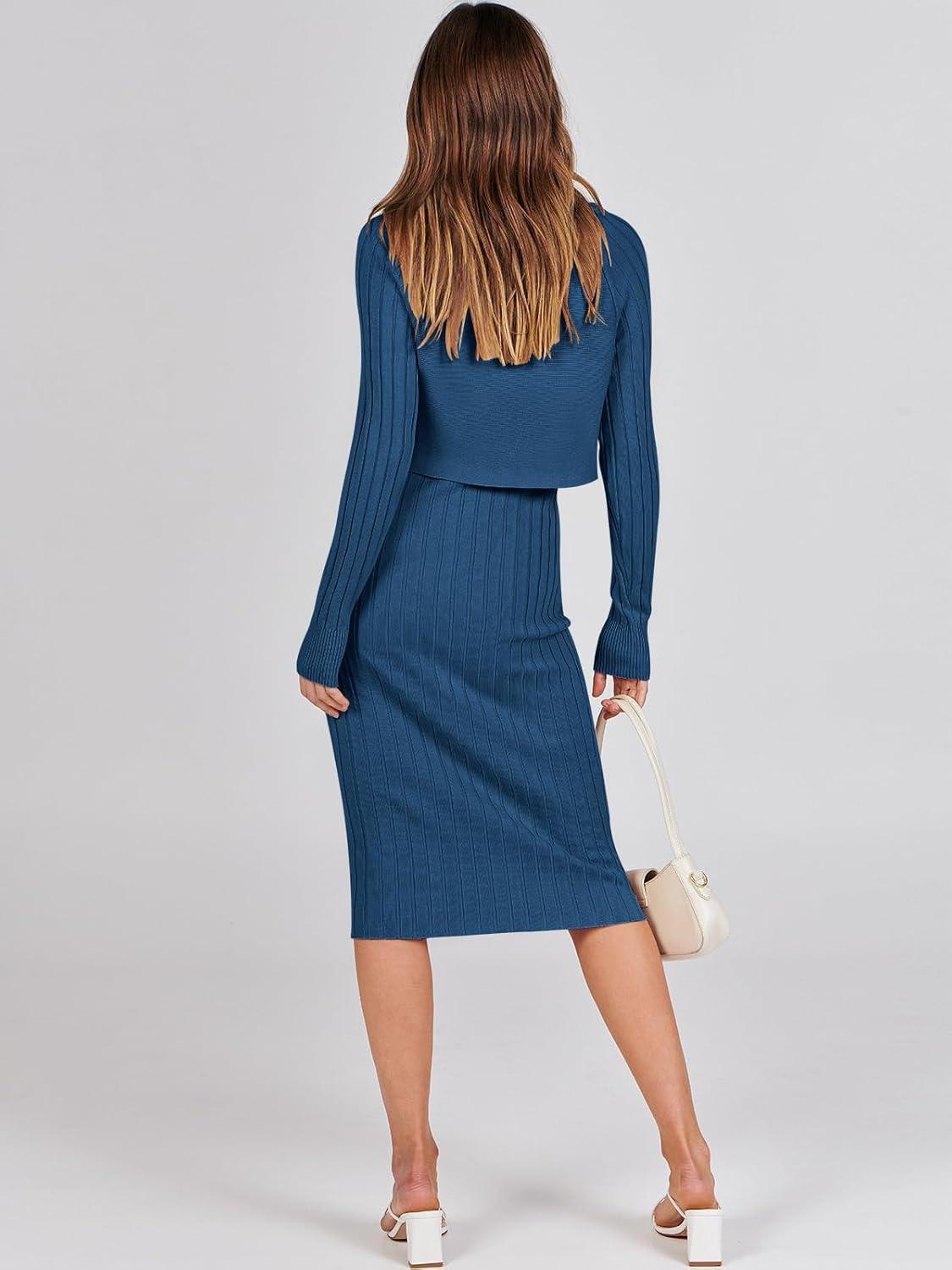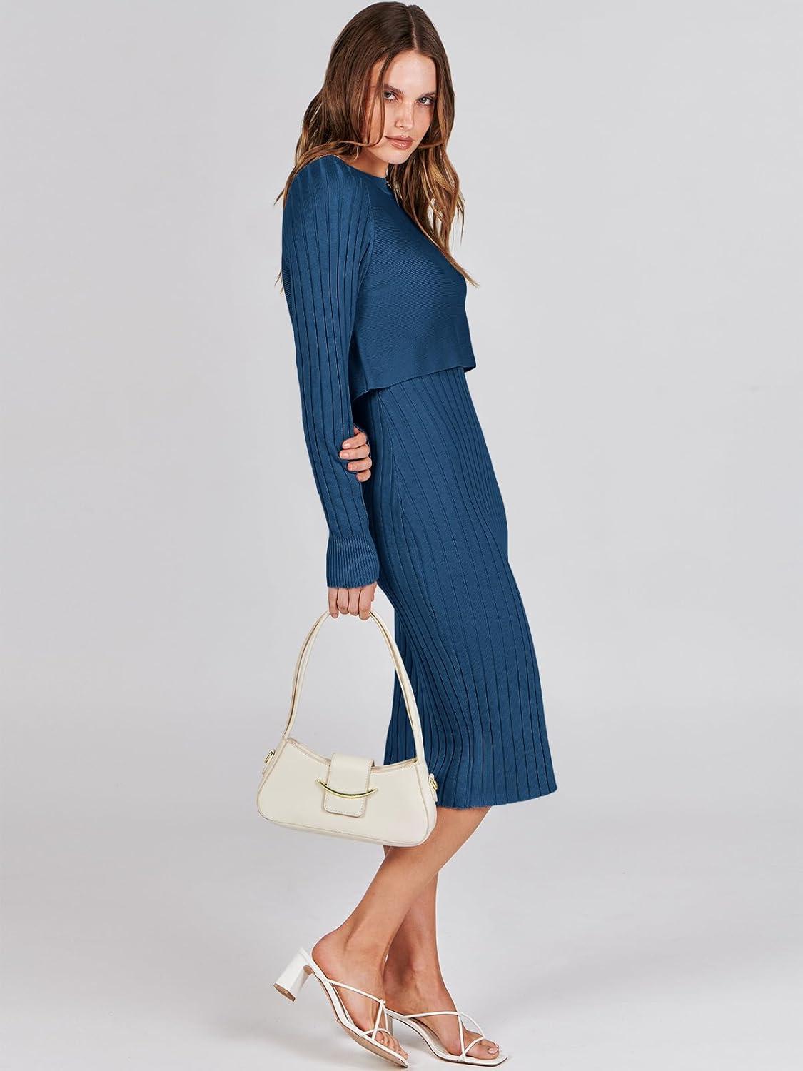 ANRABESS Womens 2 Piece Outfits Sweater Dresses Set Midi Skirt Sets Long Sleeve Crop Top Bodycon Ribbed Knit Dress 2025 Fall(Blue)