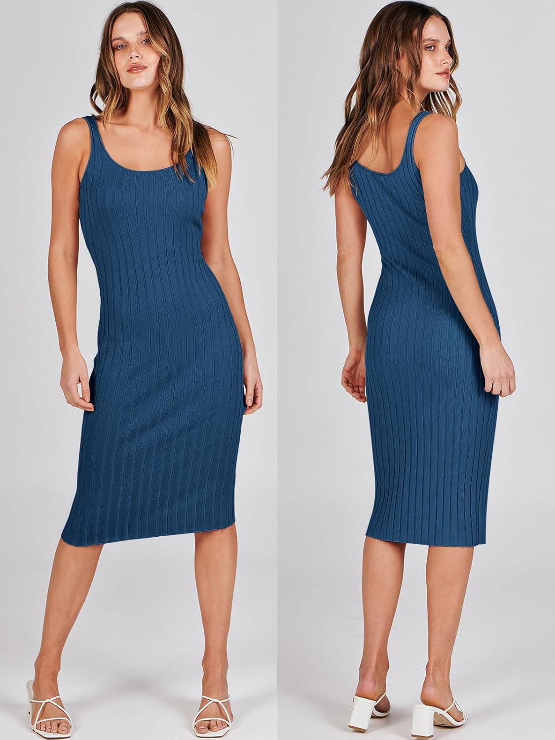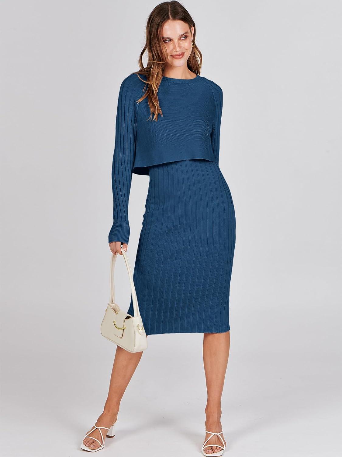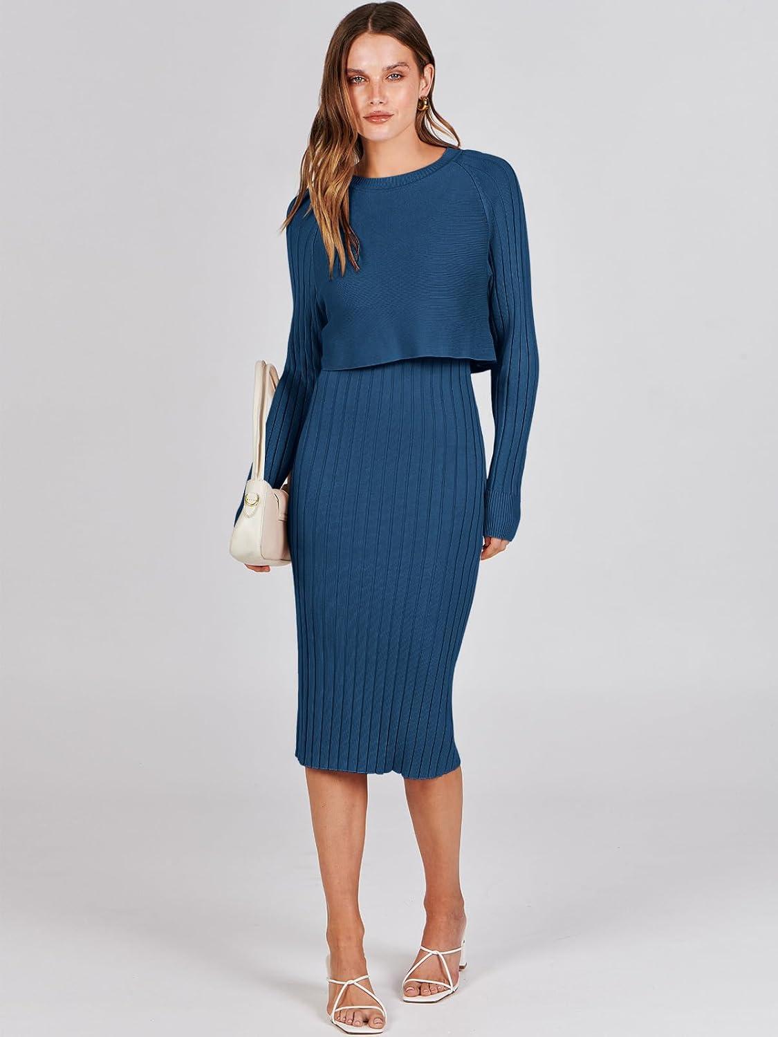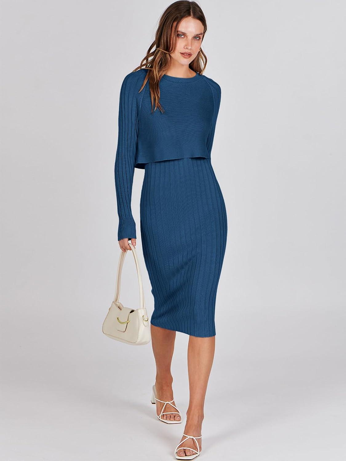 ANRABESS Womens 2 Piece Outfits Sweater Dresses Set Midi Skirt Sets Long Sleeve Crop Top Bodycon Ribbed Knit Dress 2025 Fall(Blue)