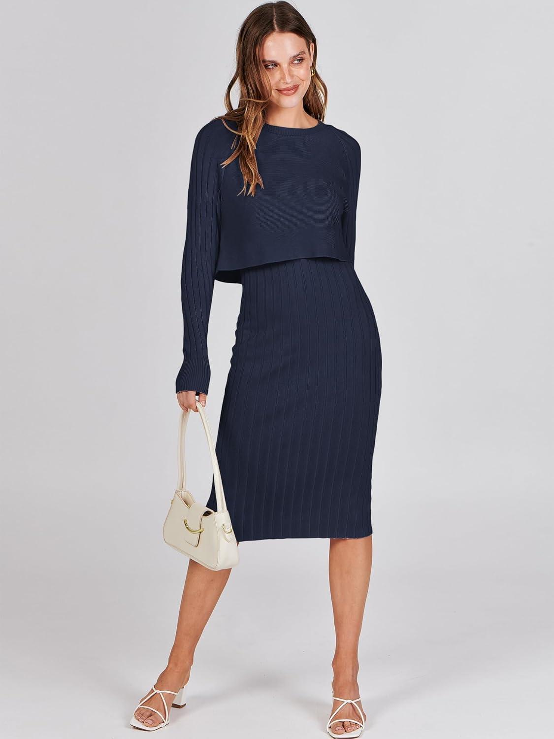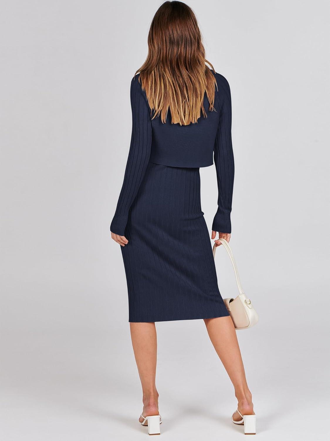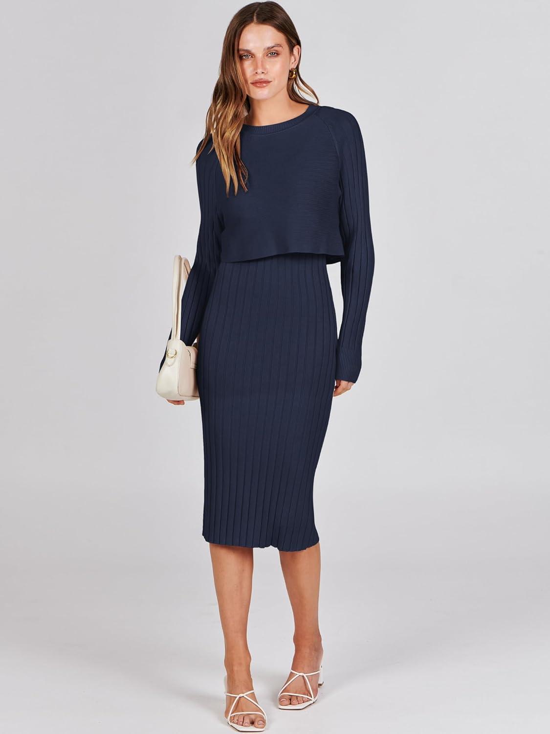 ANRABESS Womens 2 Piece Outfits Sweater Dresses Set Midi Skirt Sets Long Sleeve Crop Top Bodycon Ribbed Knit Dress 2025 Fall(Navy Blue)