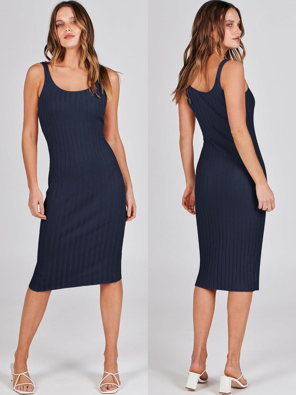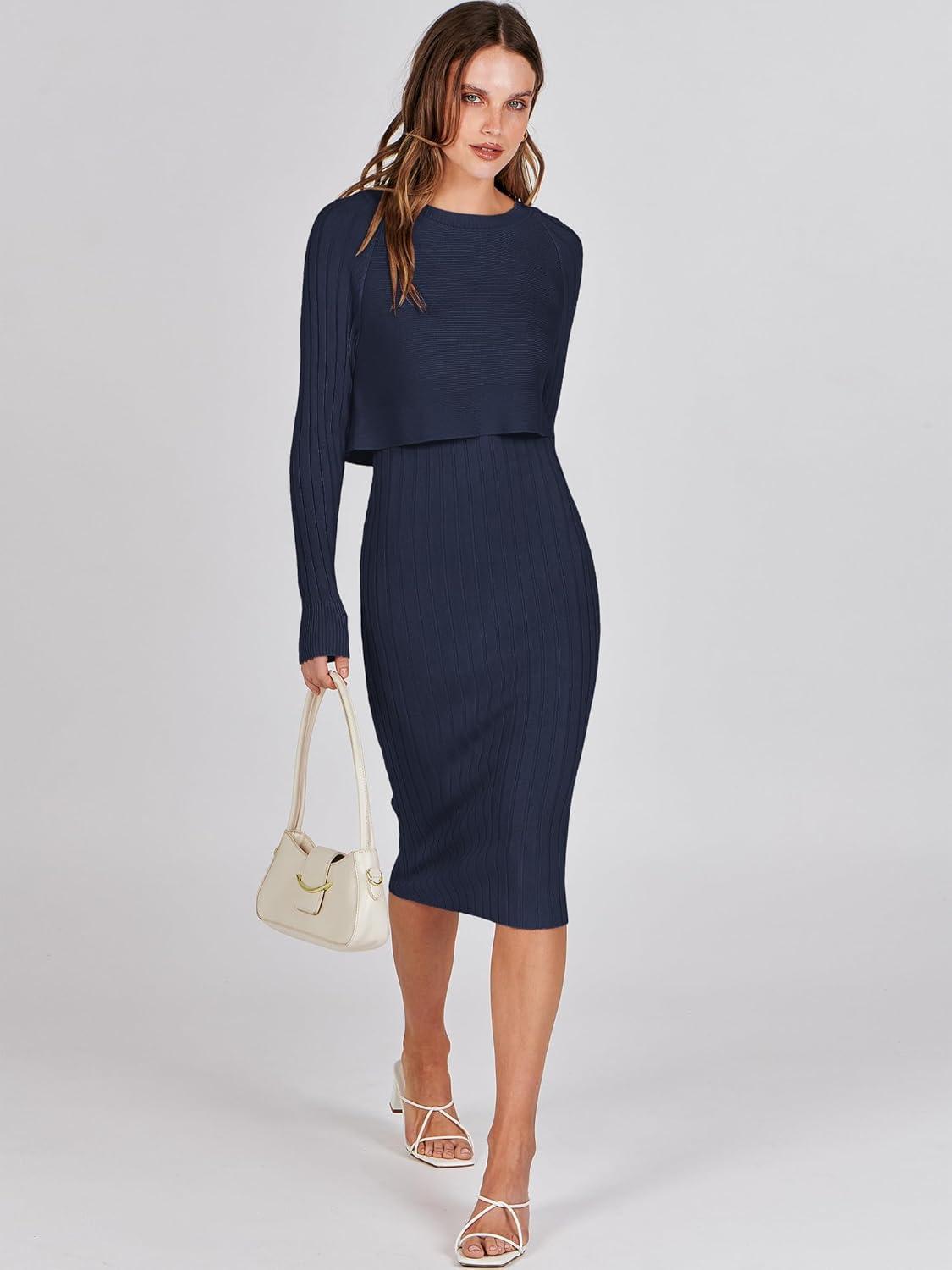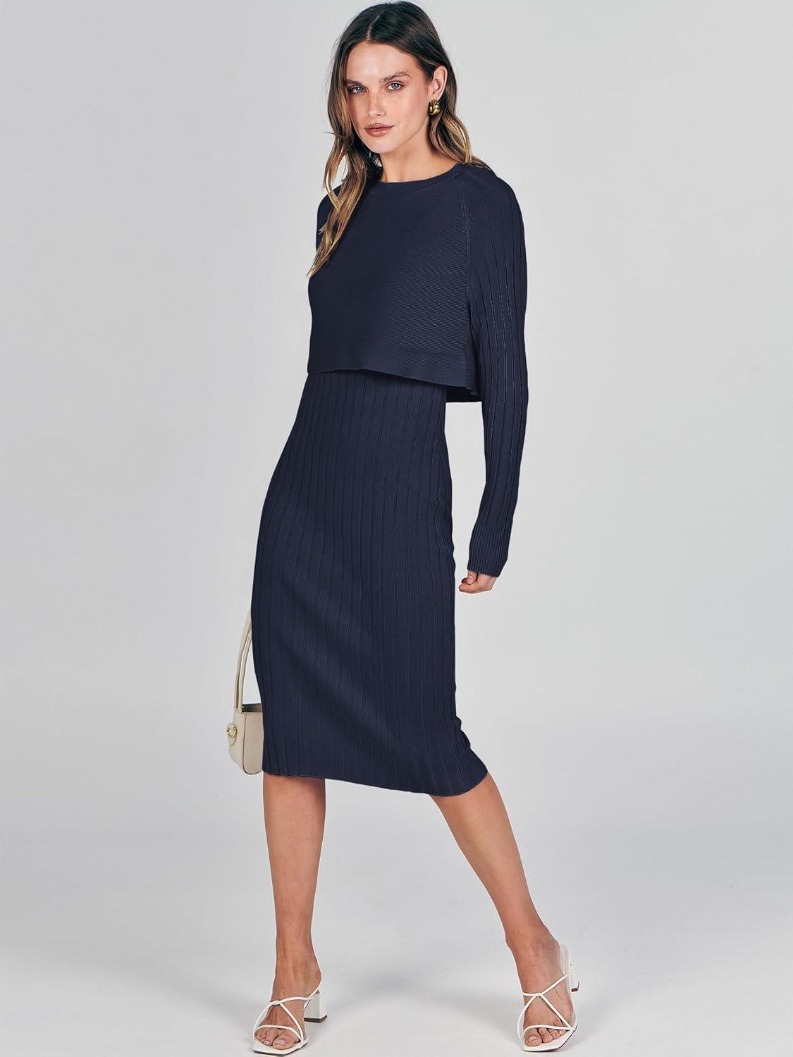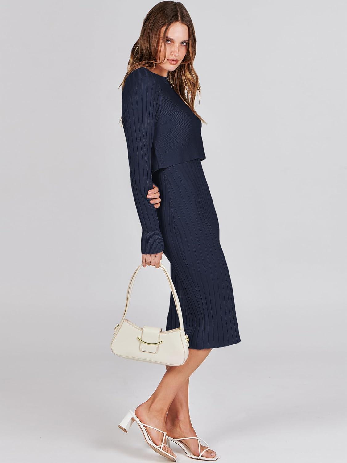 ANRABESS Womens 2 Piece Outfits Sweater Dresses Set Midi Skirt Sets Long Sleeve Crop Top Bodycon Ribbed Knit Dress 2025 Fall(Navy Blue)