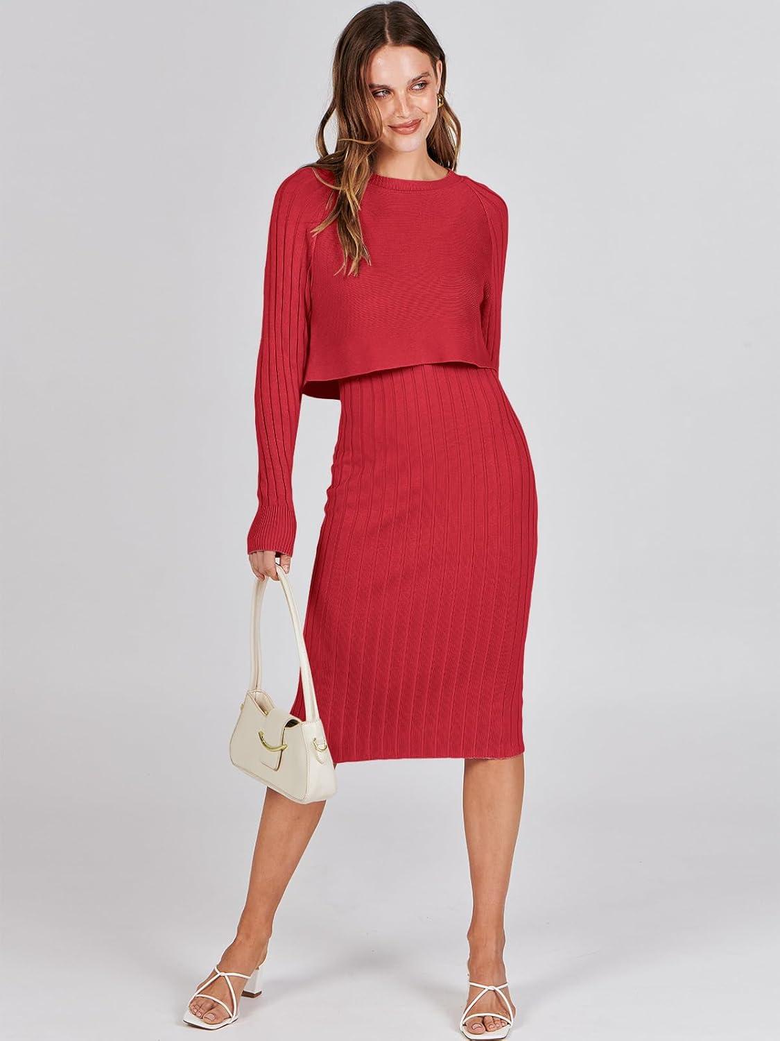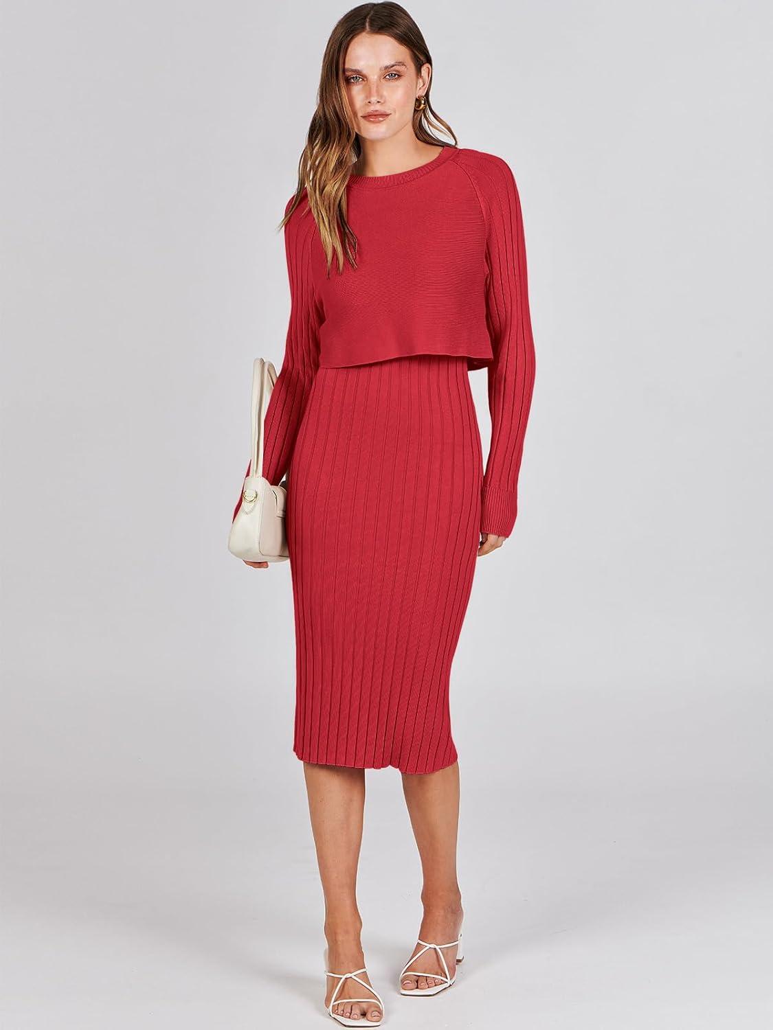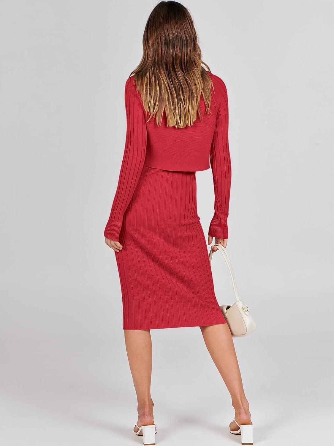 ANRABESS Womens 2 Piece Outfits Sweater Dresses Set Midi Skirt Sets Long Sleeve Crop Top Bodycon Ribbed Knit Dress 2025 Fall(Red)