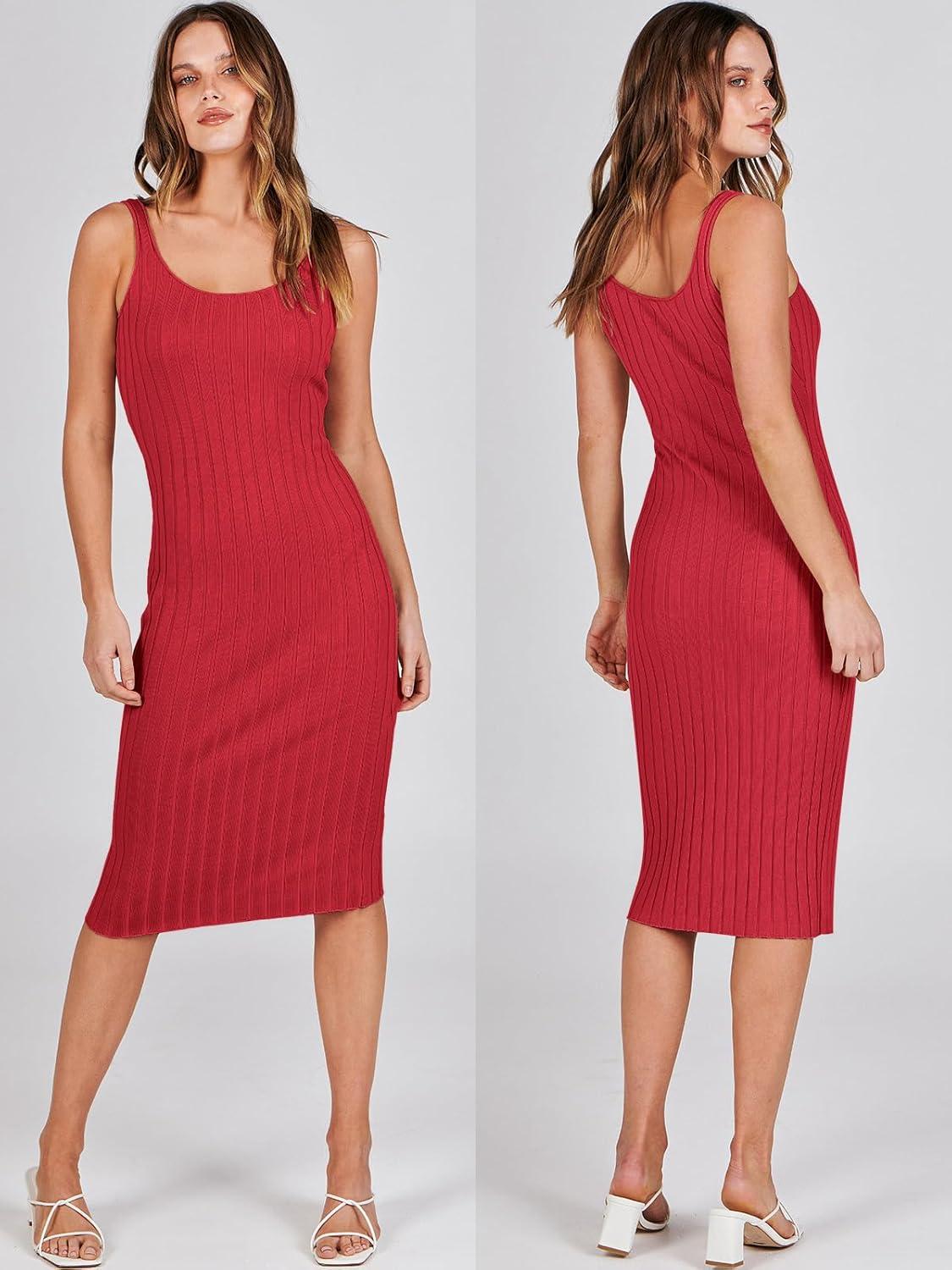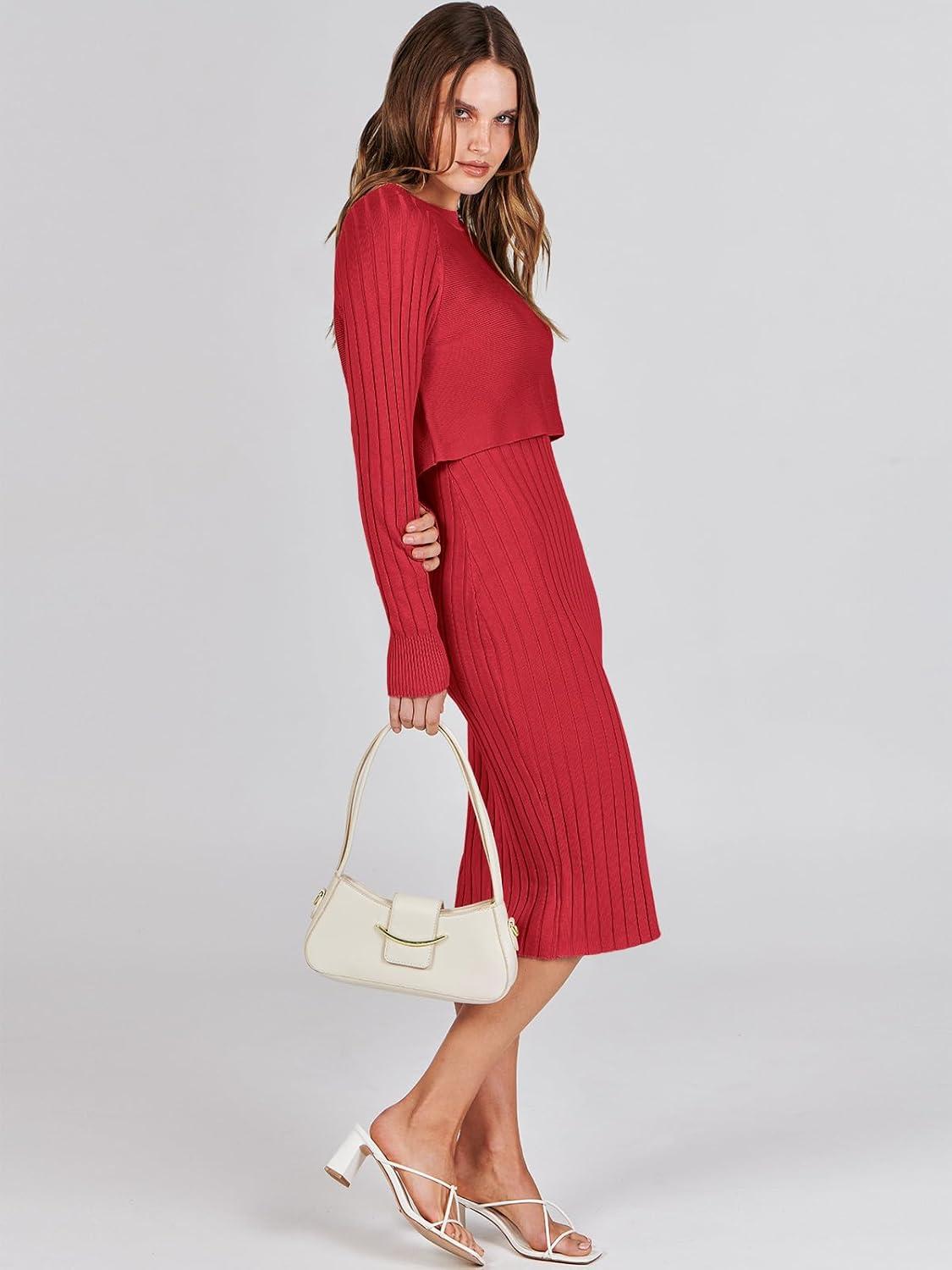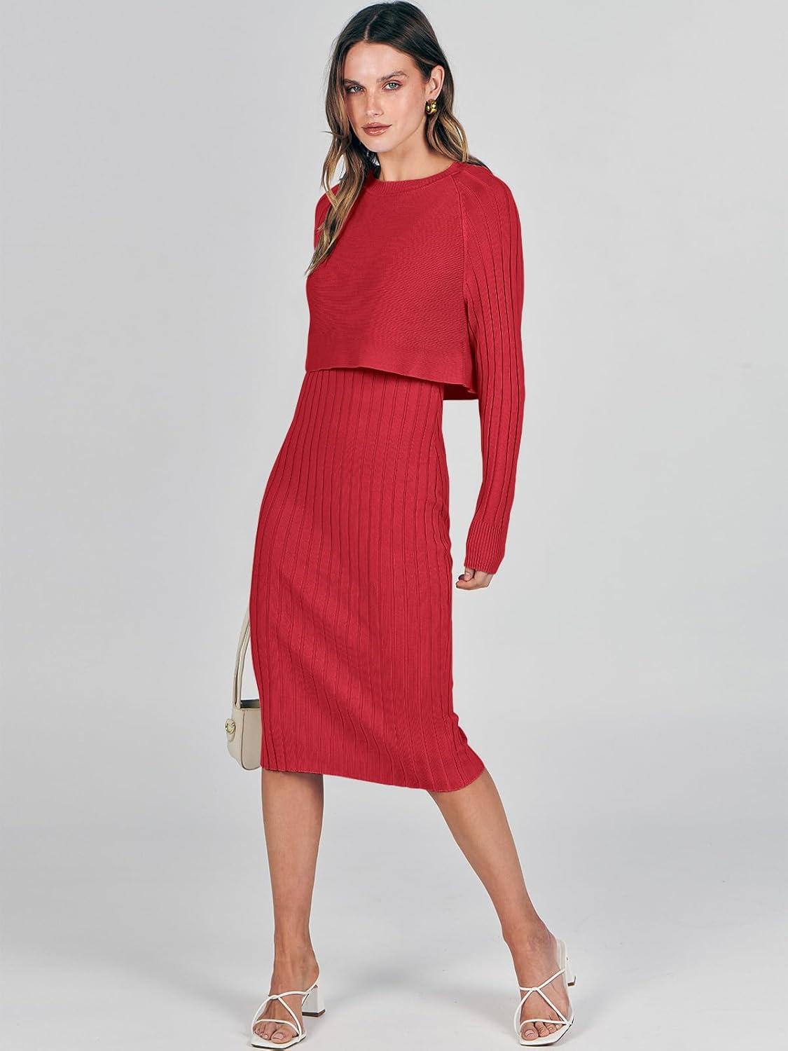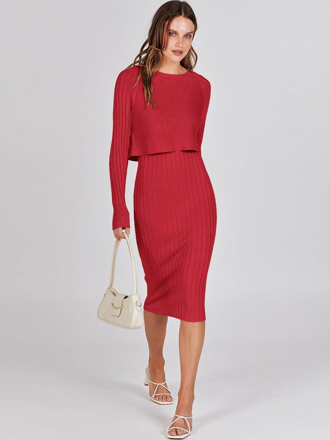ANRABESS Womens 2 Piece Outfits Sweater Dresses Set Midi Skirt Sets Long Sleeve Crop Top Bodycon Ribbed Knit Dress 2025 Fall(Red)