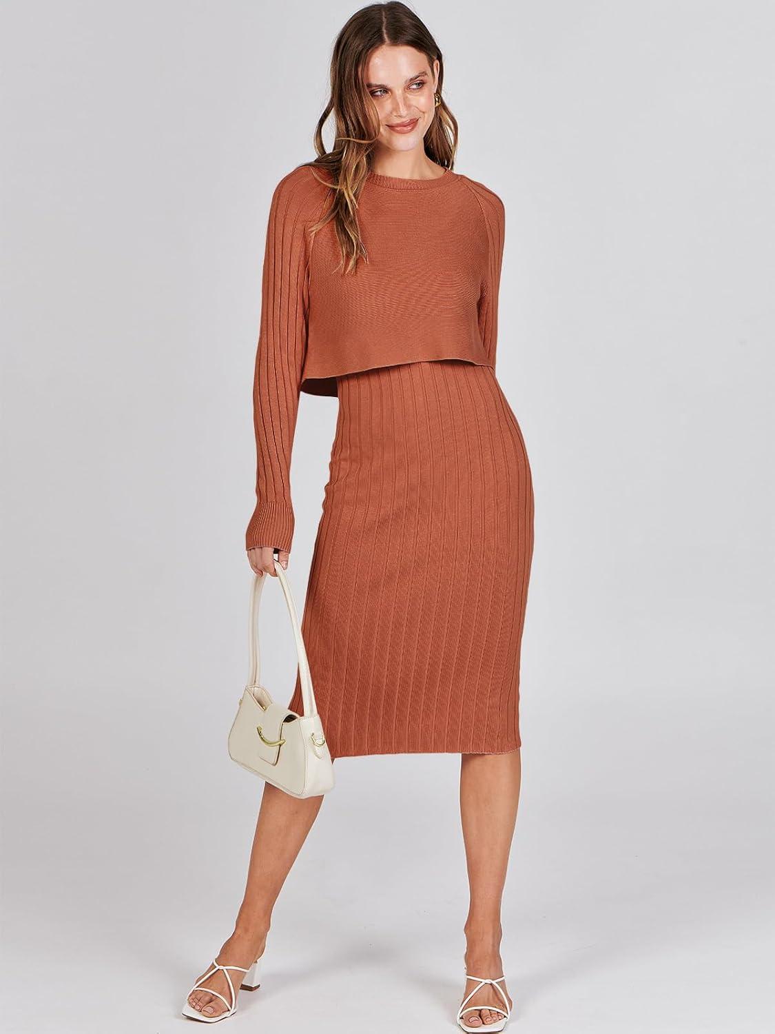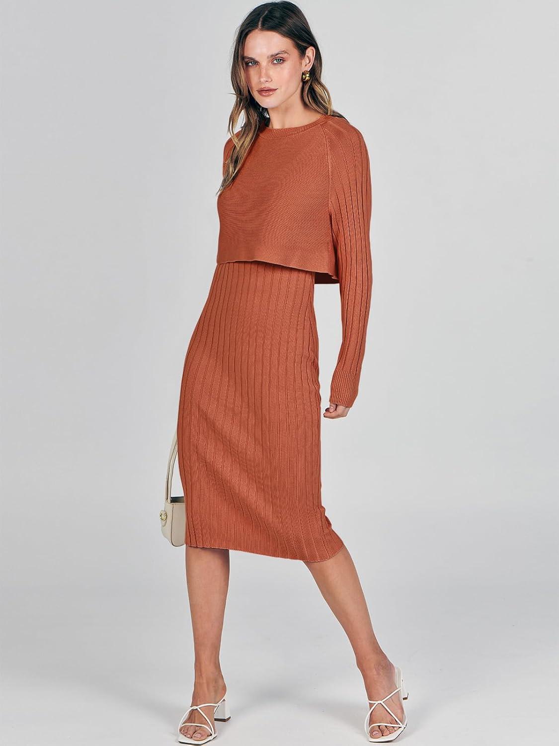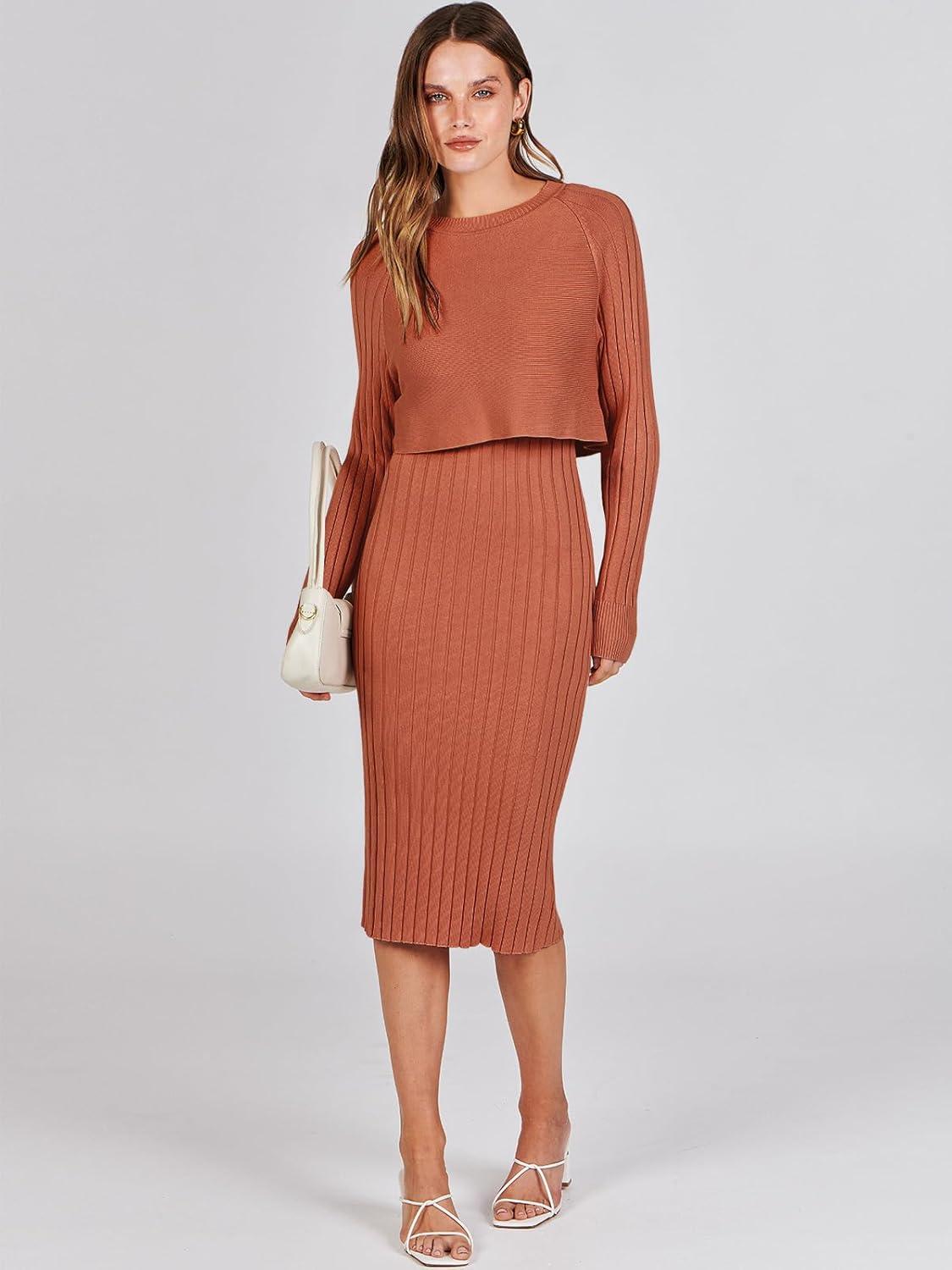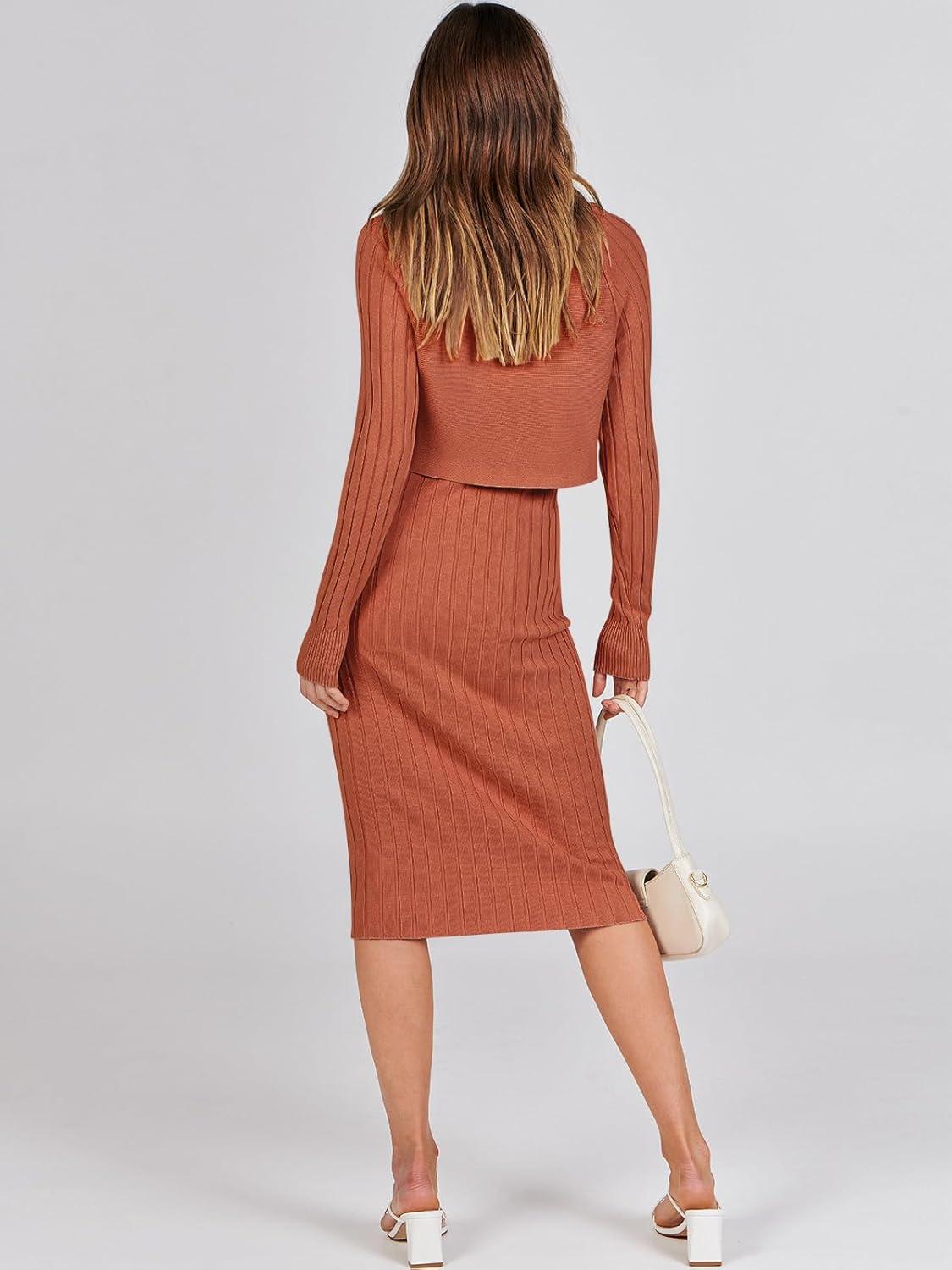ANRABESS Womens 2 Piece Outfits Sweater Dresses Set Midi Skirt Sets Long Sleeve Crop Top Bodycon Ribbed Knit Dress 2025 Fall(Rust)