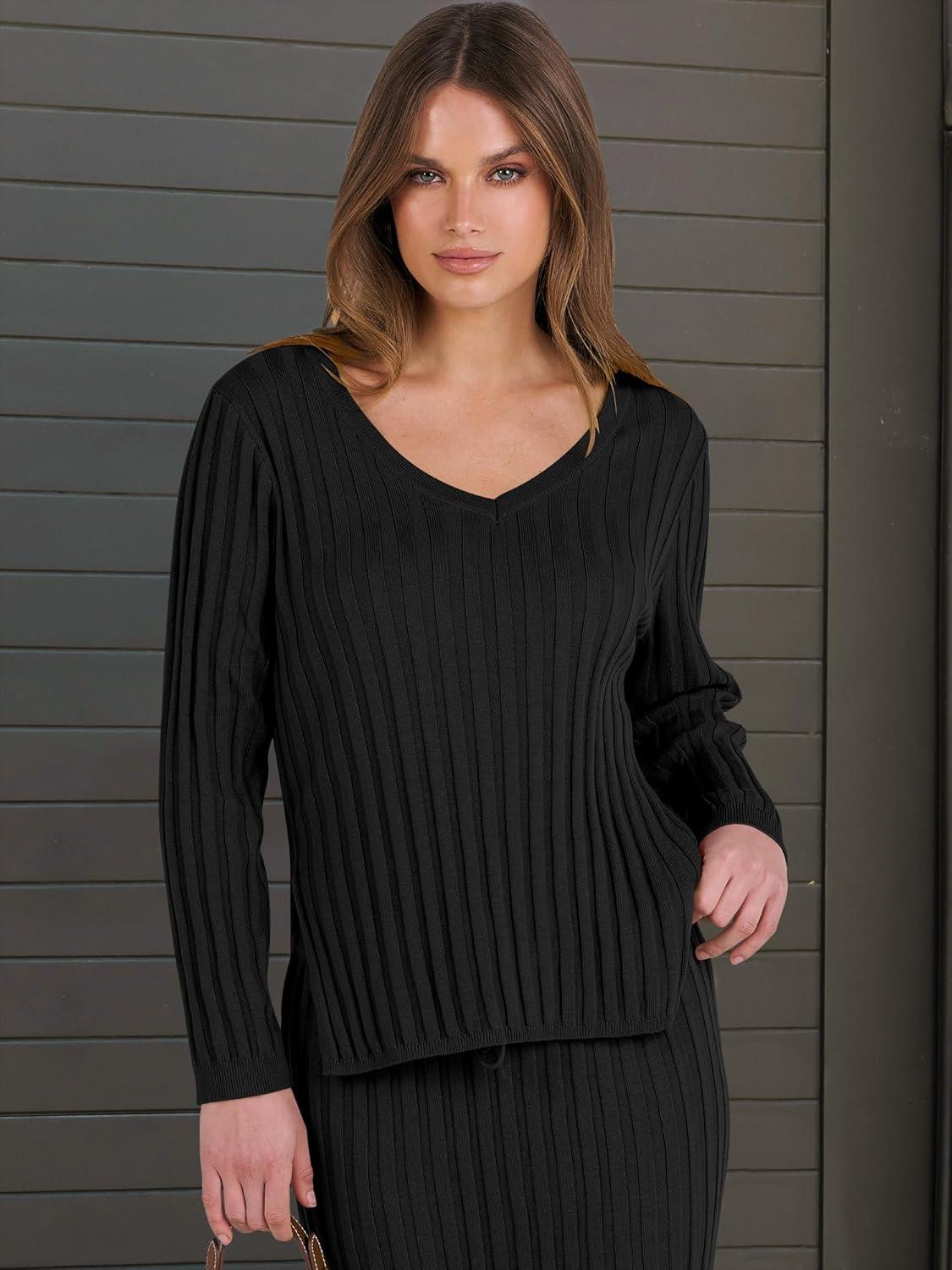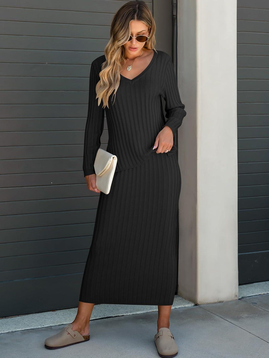 ANRABESS Women’s 2 Piece Outfits Sweater Skirt Sets Casual Long Sleeve V Neck Ribbed Knit Tops Midi Dress 2025 Fall Fashion(Black)