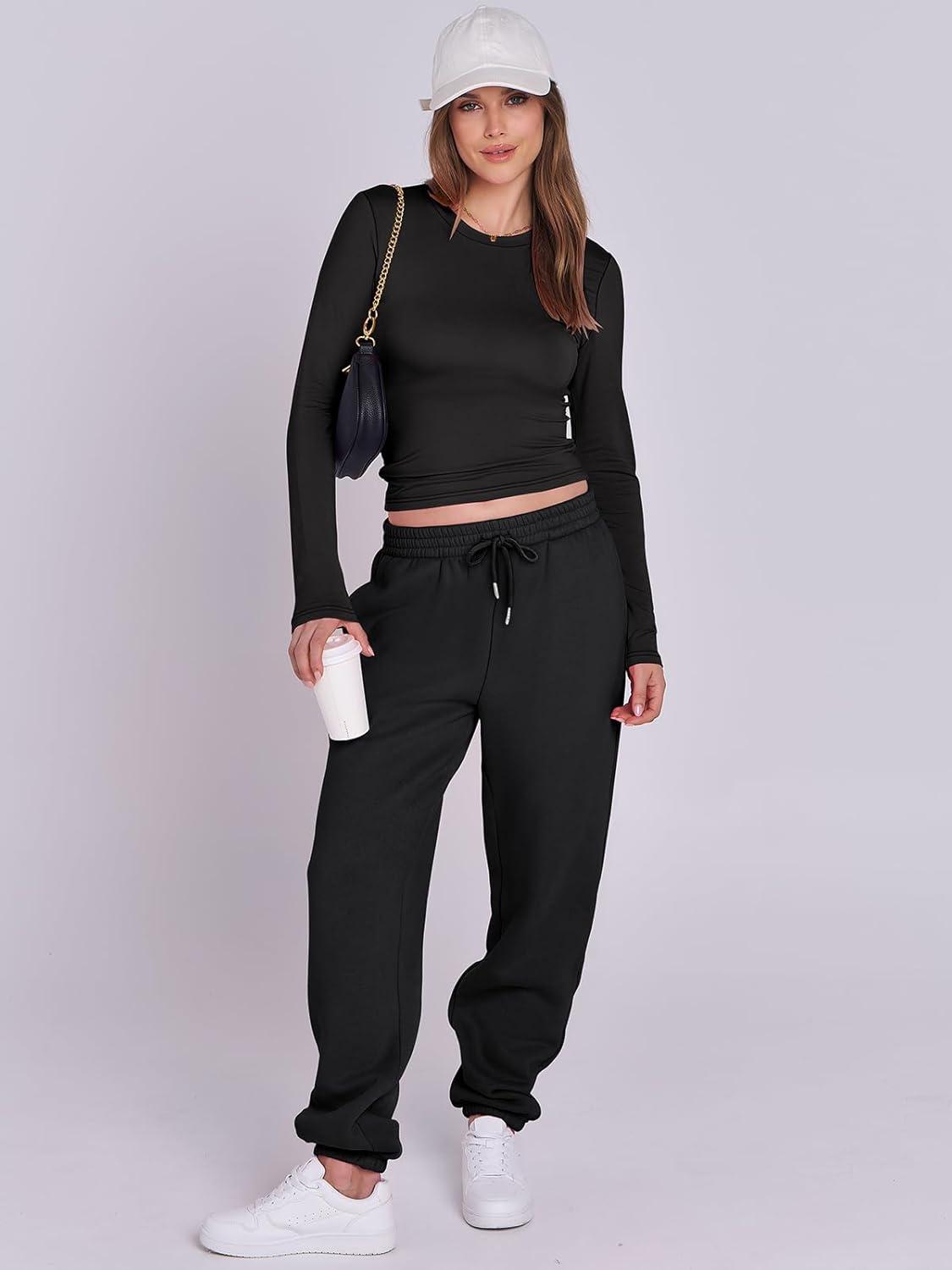 ANRABESS Womens 2 Piece Sweatsuits Long Sleeve Tight Shirt Tops Joggers Fleece Sweatpants Sets 2025 Fall Sweat Lounge Outfits(Black)