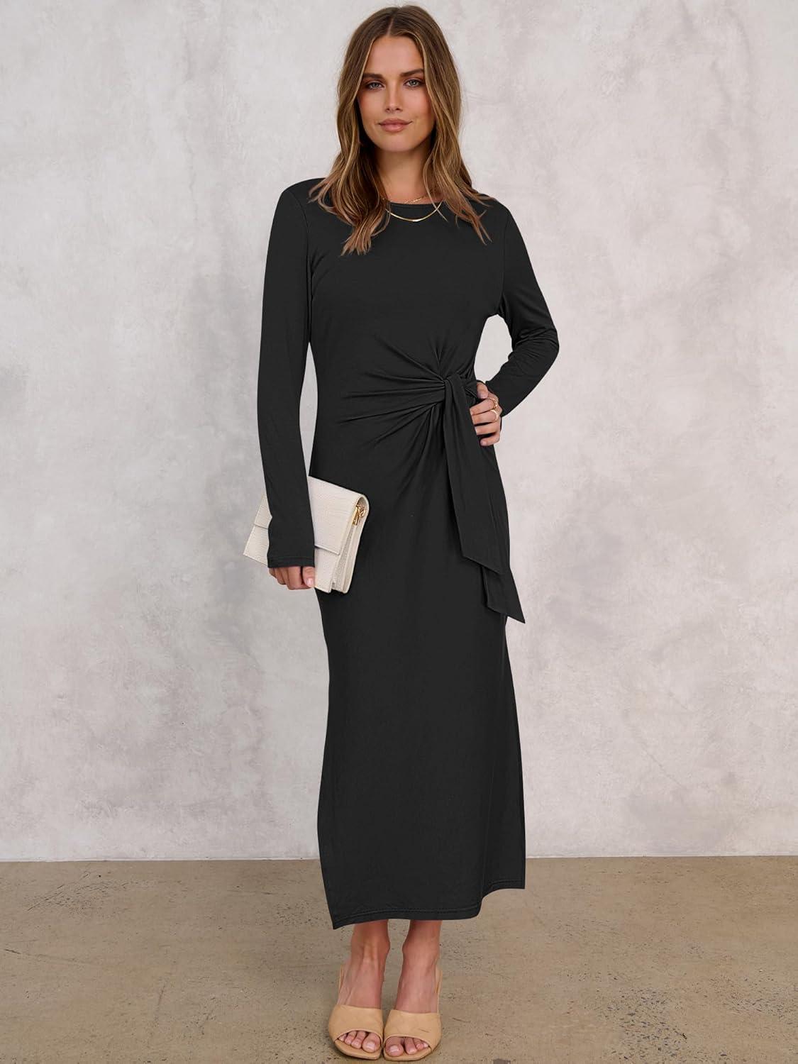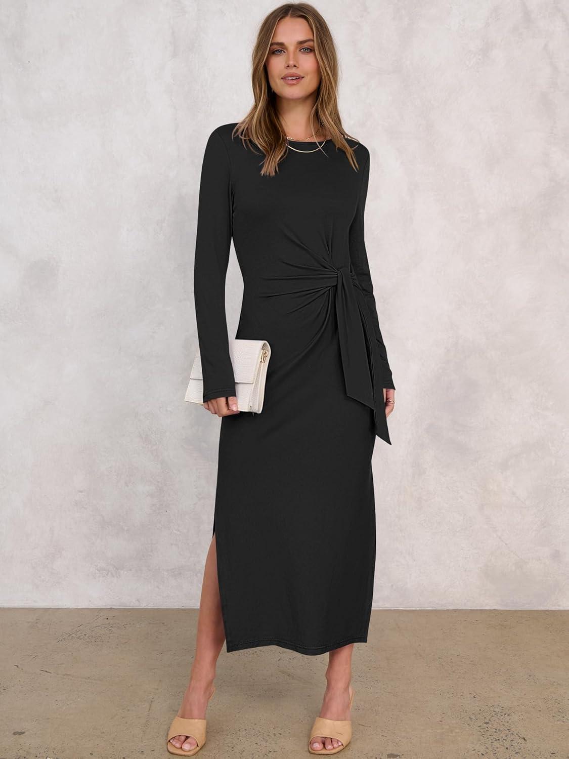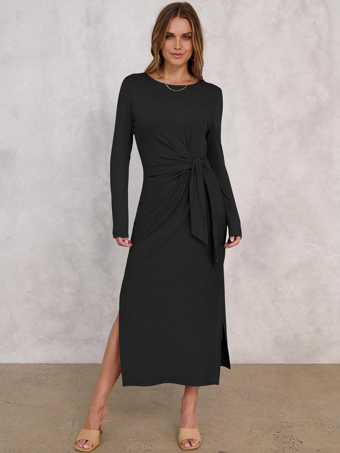 ANRABESS Womens 2025 Fall Long Sleeve Maxi Dress Crewneck Tie Waist Slit Casual Long T Shirt Dresses Winter Trendy Outfits(Black)