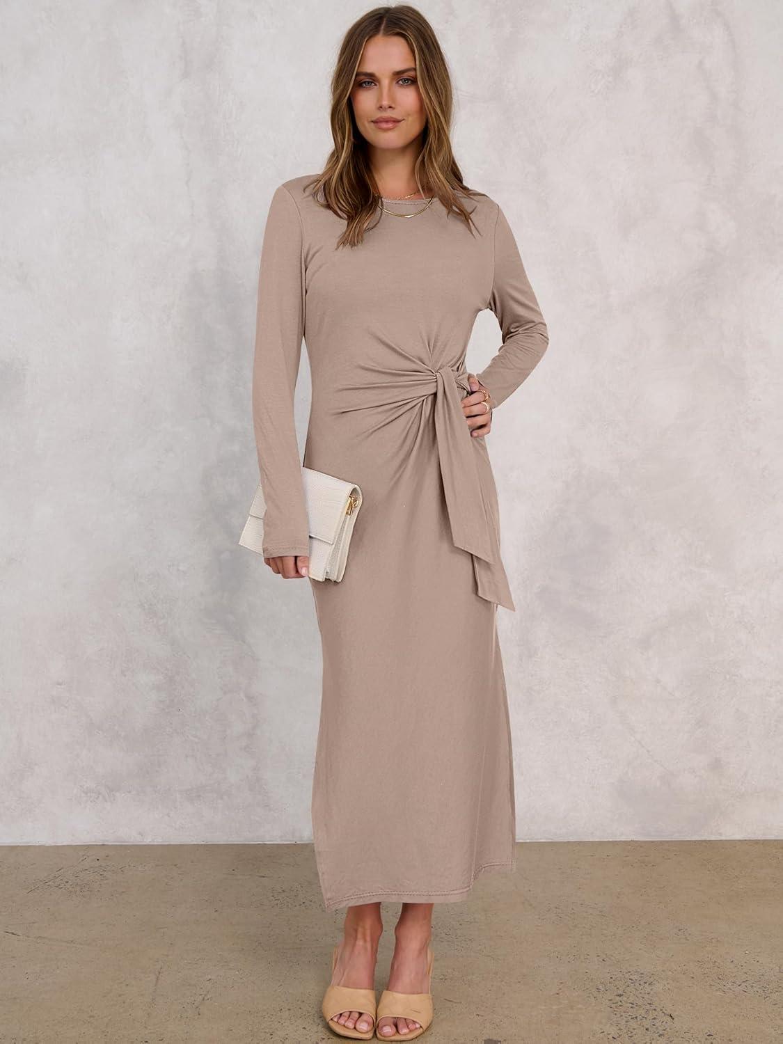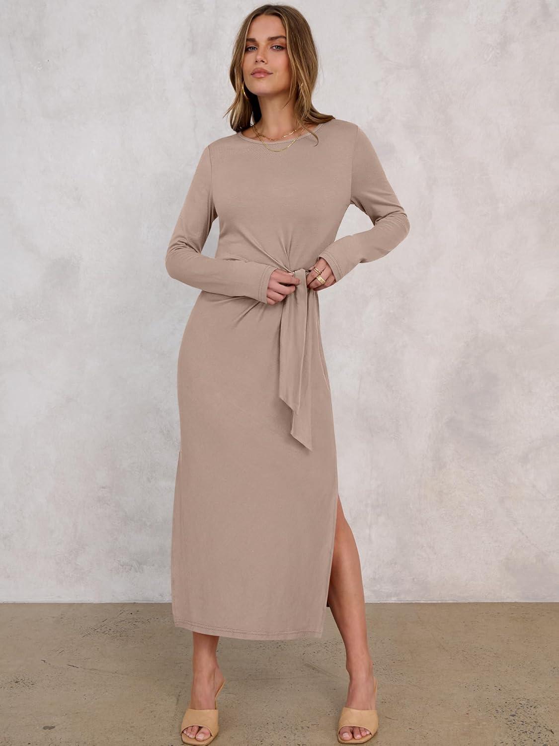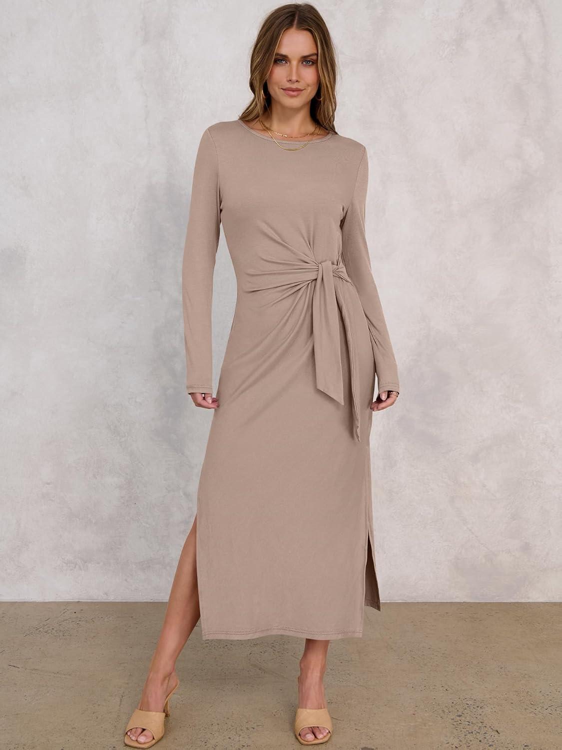 ANRABESS Womens 2025 Fall Long Sleeve Maxi Dress Crewneck Tie Waist Slit Casual Long T Shirt Dresses Winter Trendy Outfits(Khaki)