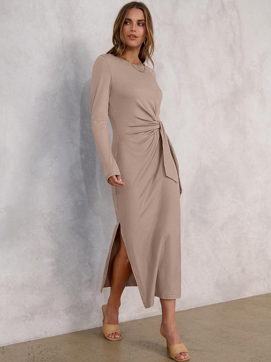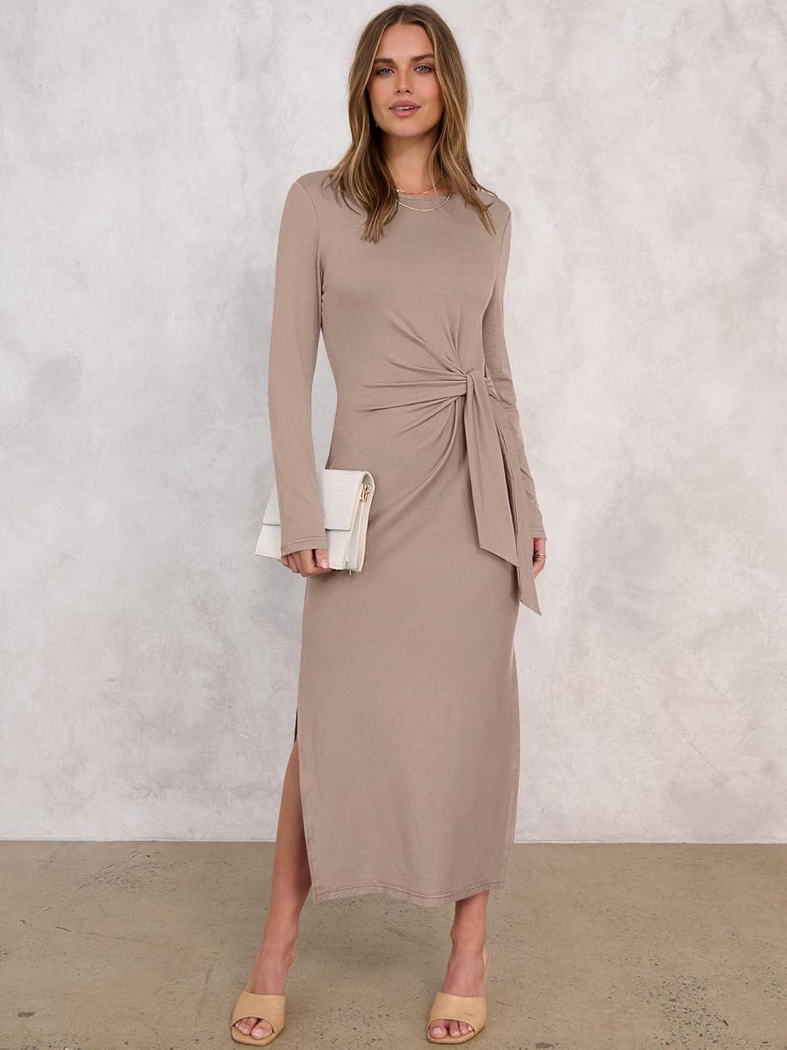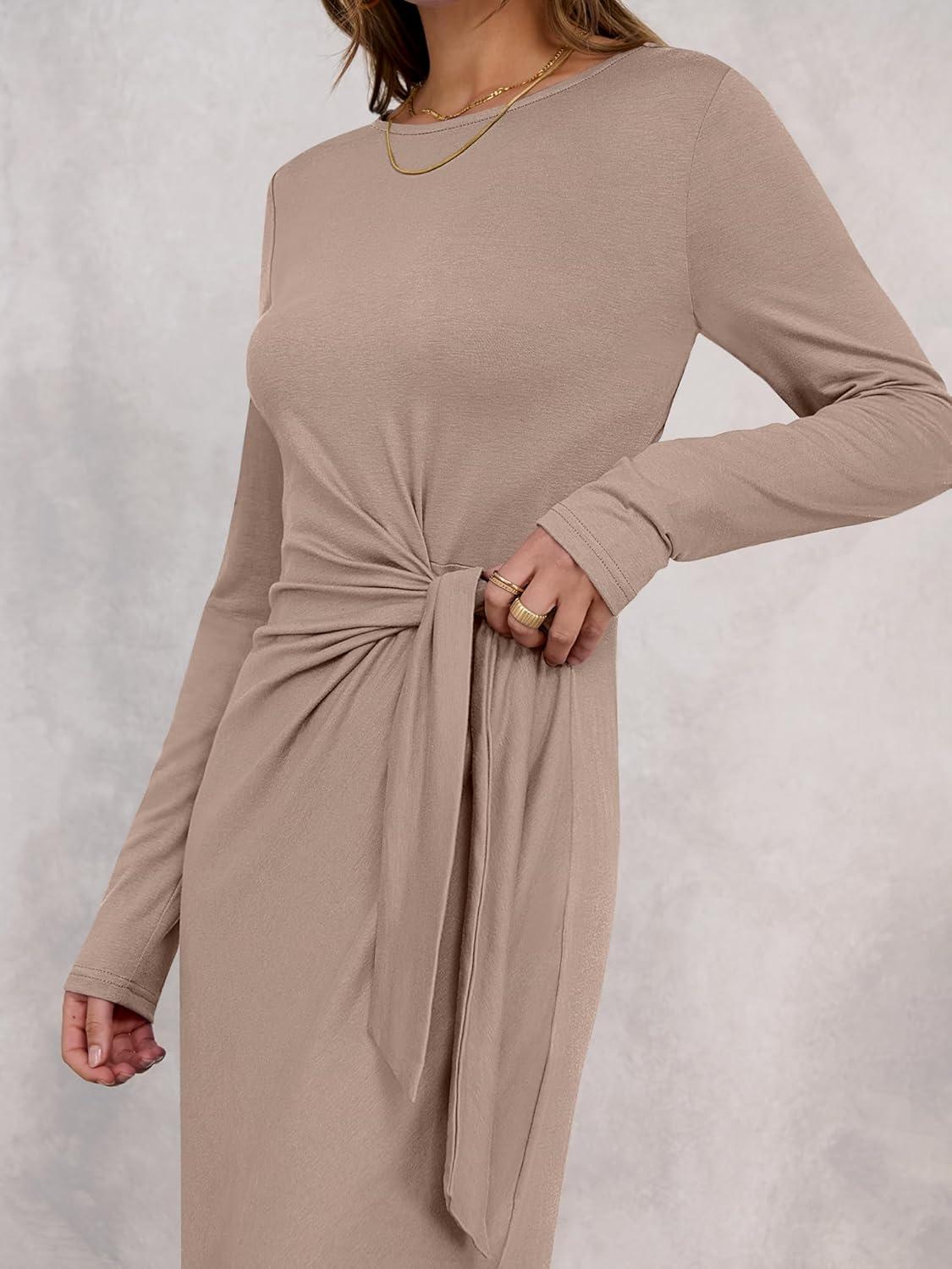 ANRABESS Womens 2025 Fall Long Sleeve Maxi Dress Crewneck Tie Waist Slit Casual Long T Shirt Dresses Winter Trendy Outfits(Khaki)