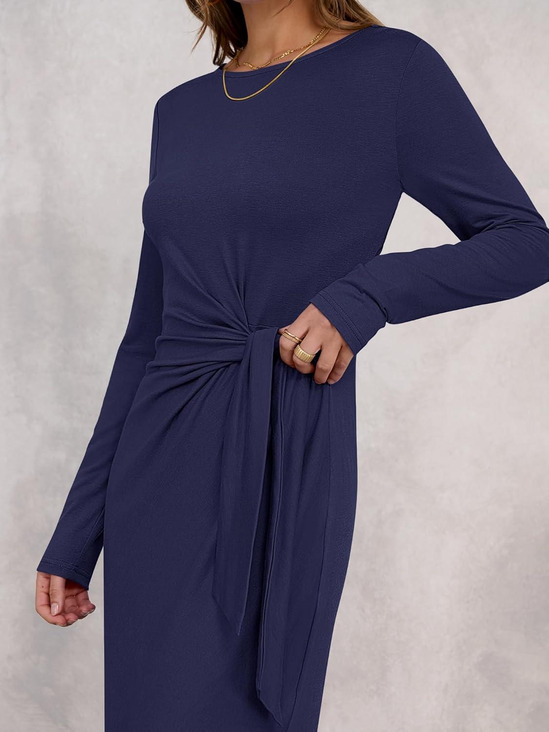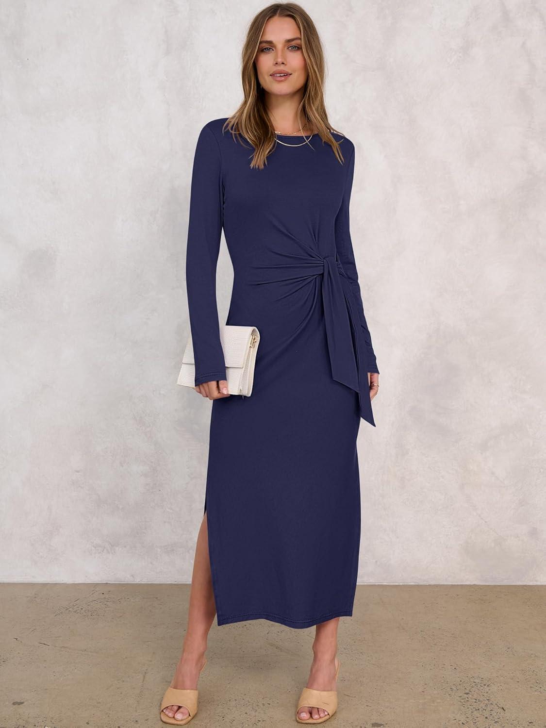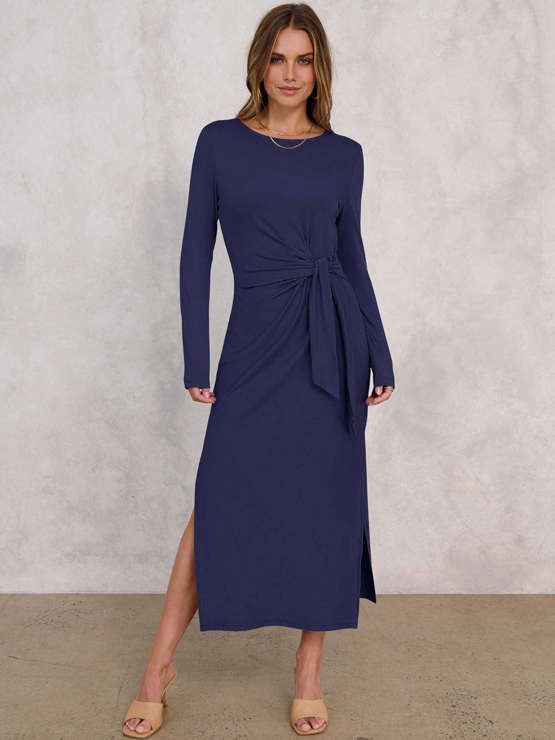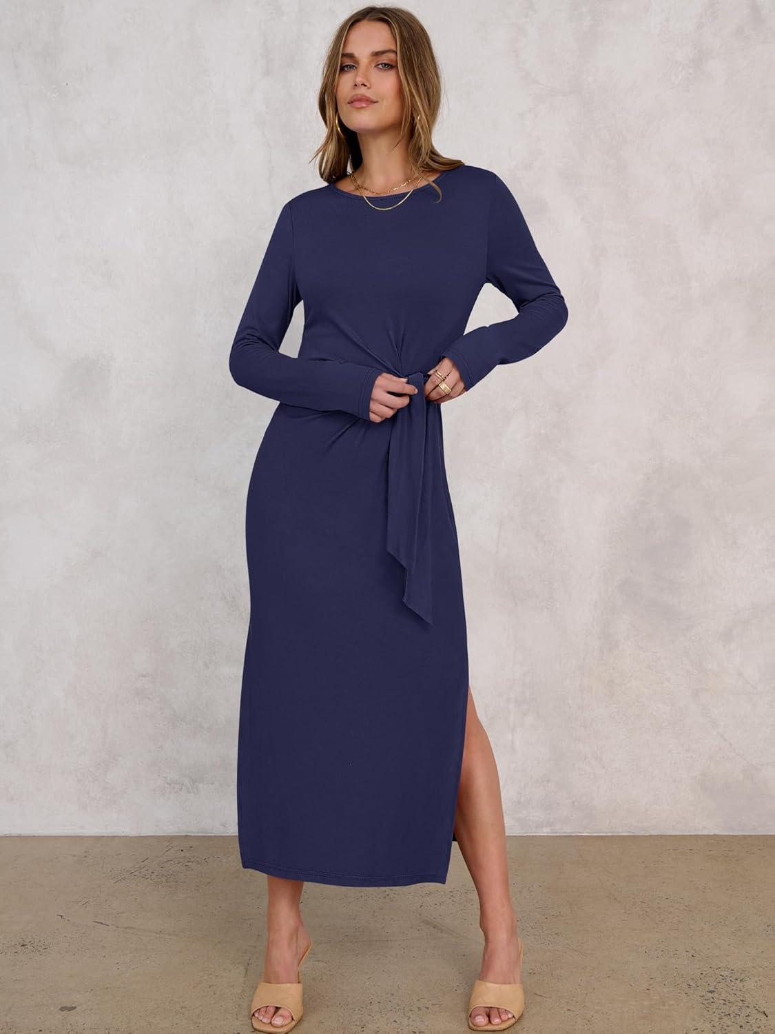 ANRABESS Womens 2025 Fall Long Sleeve Maxi Dress Crewneck Tie Waist Slit Casual Long T Shirt Dresses Winter Trendy Outfits(Navy Blue)