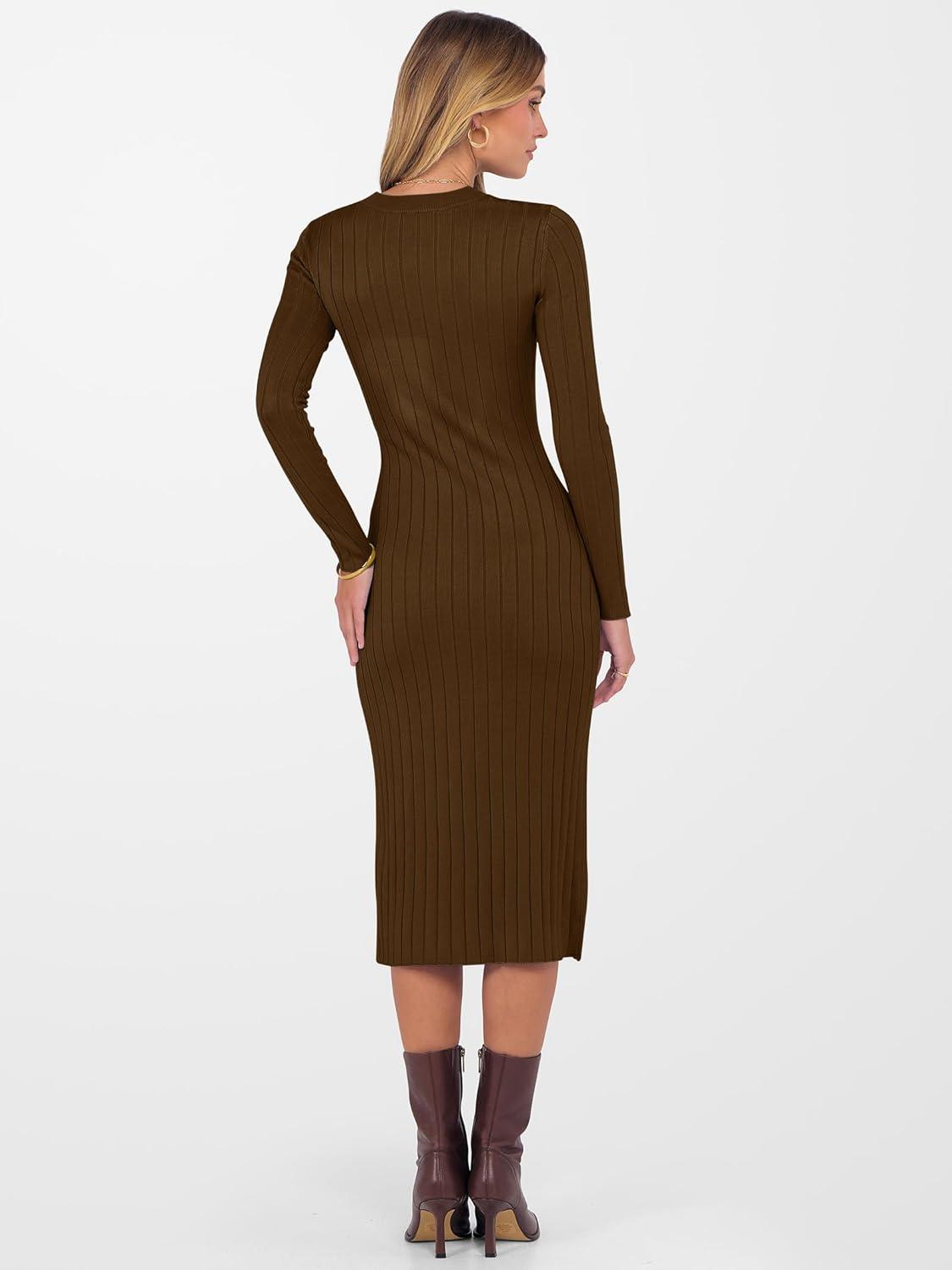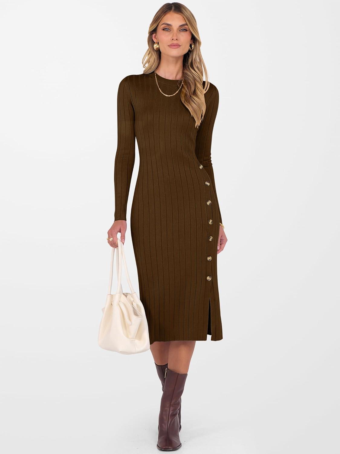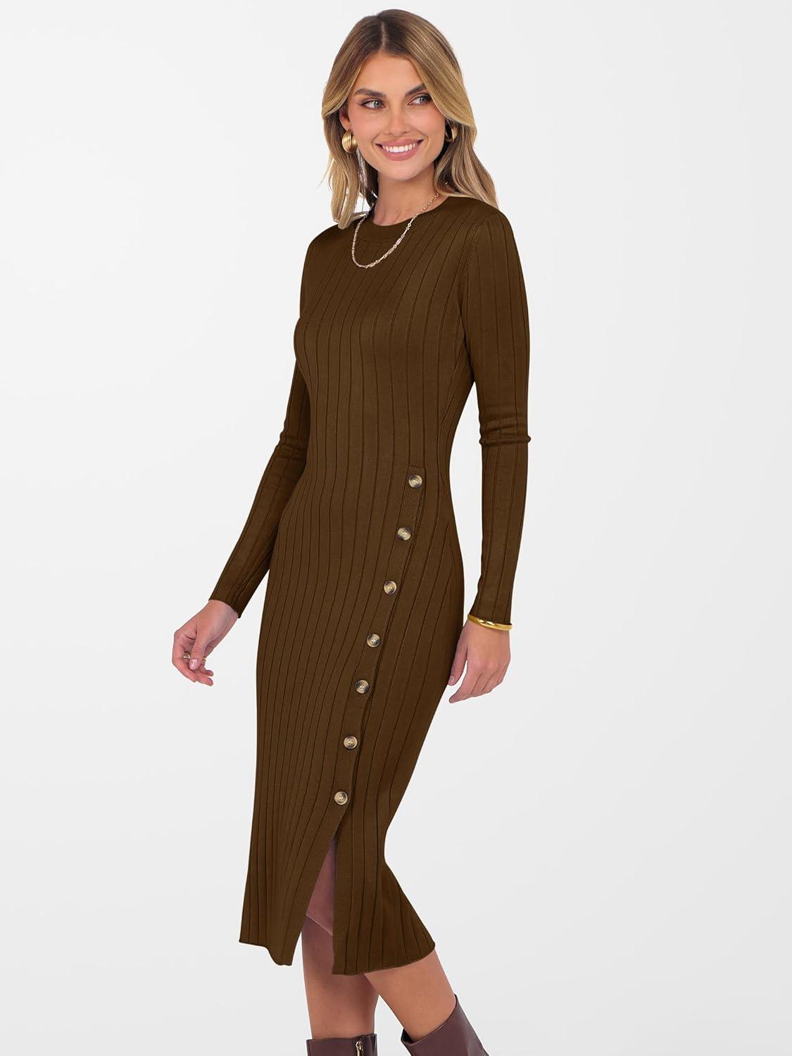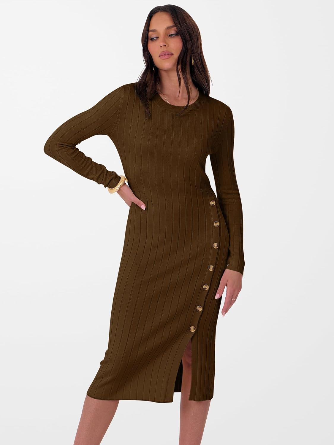 ANRABESS Womens 2025 Fall Long Sleeve Midi Dress Ribbed Knit Bodycon Fitted Button Down Wedding Guest Slit Sweater Dresses(Brown)