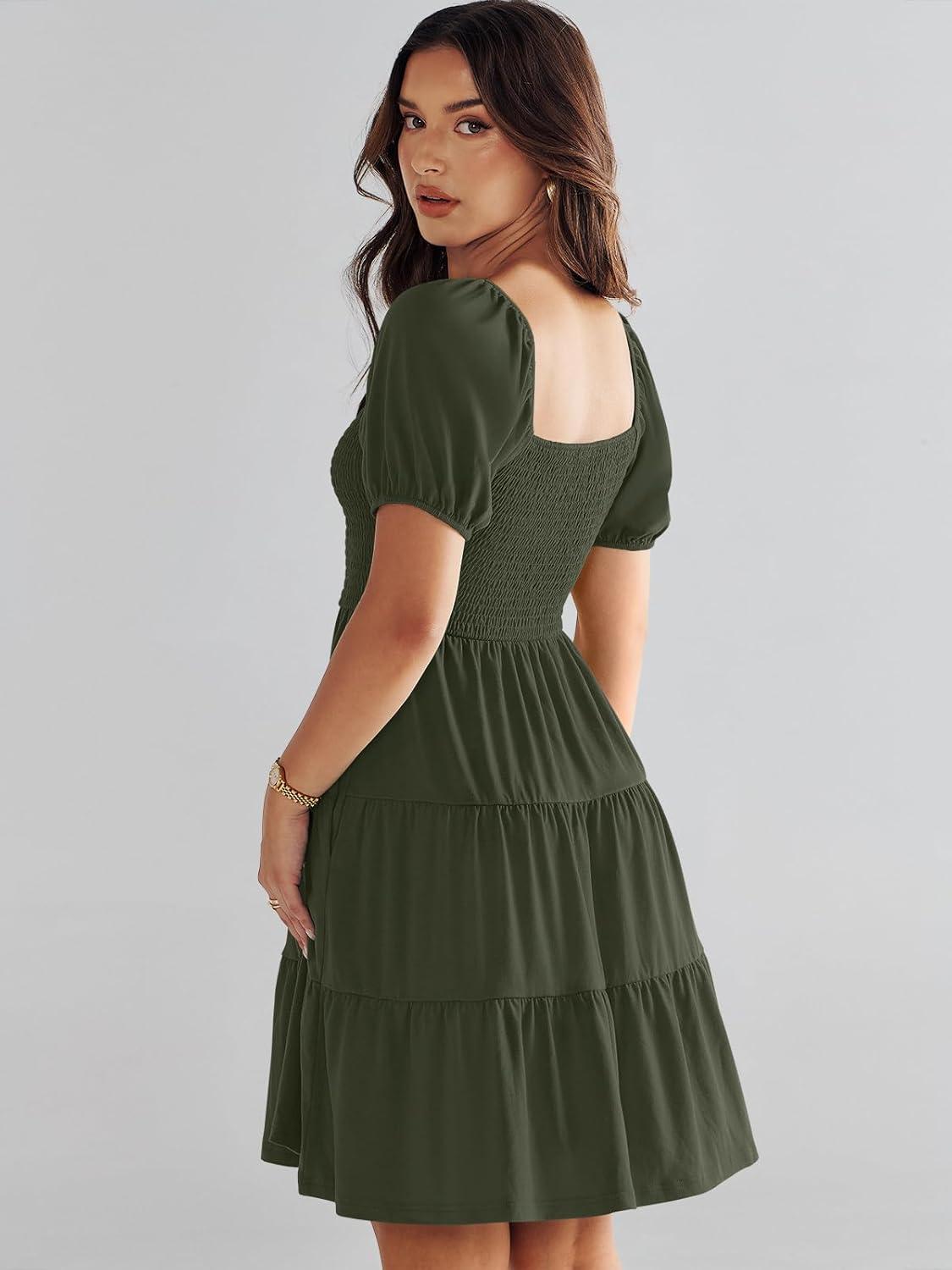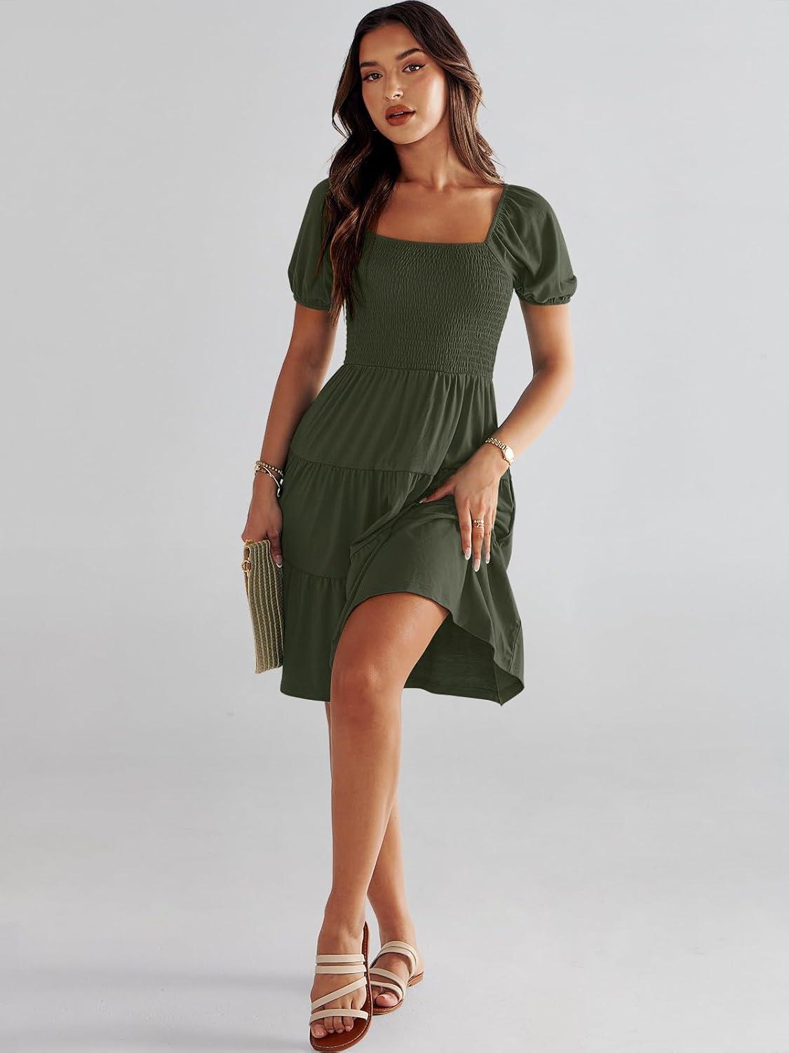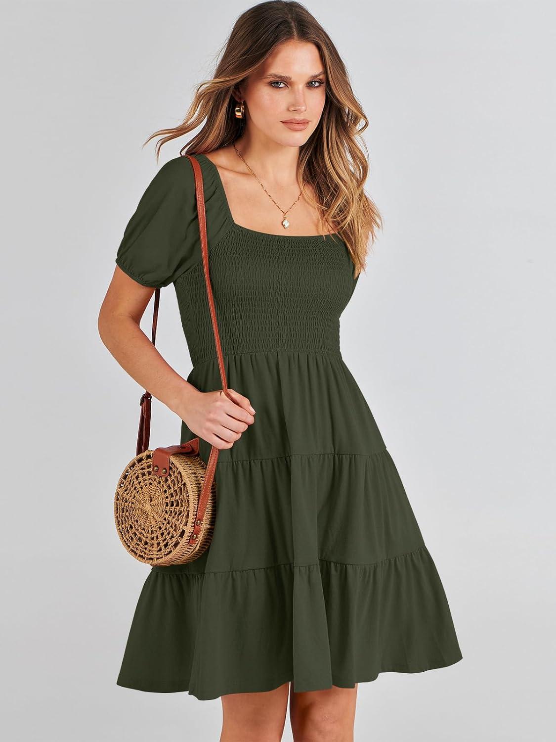 ANRABESS Womens 2025 Summer Casual Dress Square Neck Puff Sleeve Boho Beach Vacation Short Dress(Army Green)
