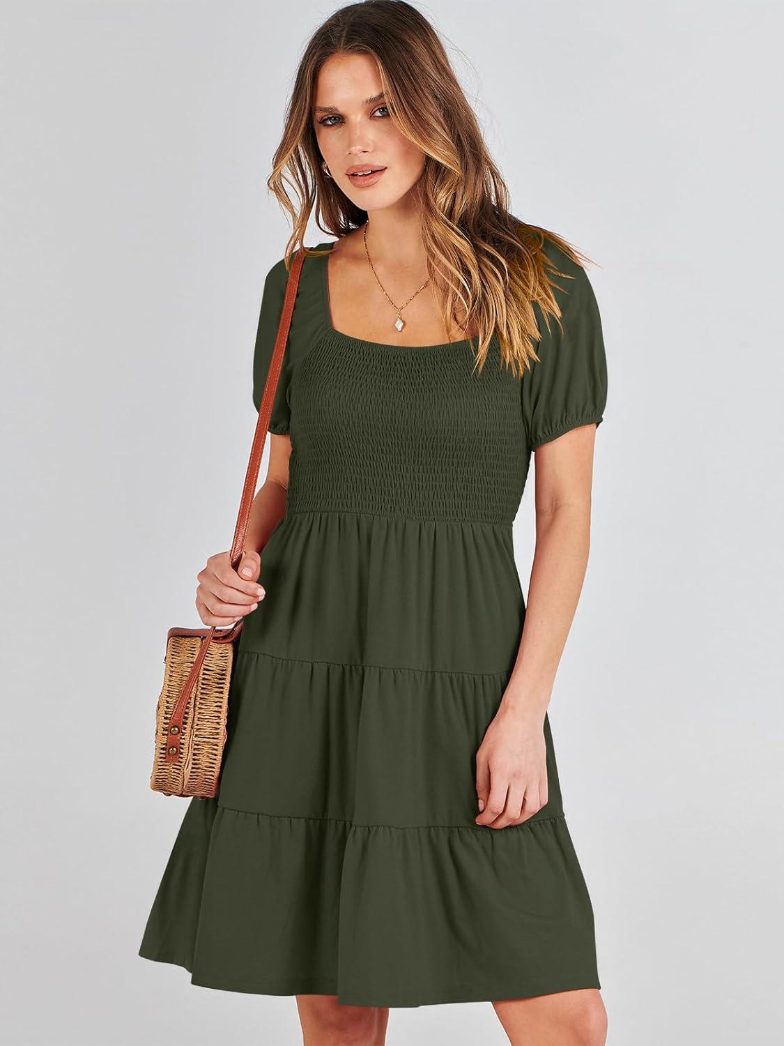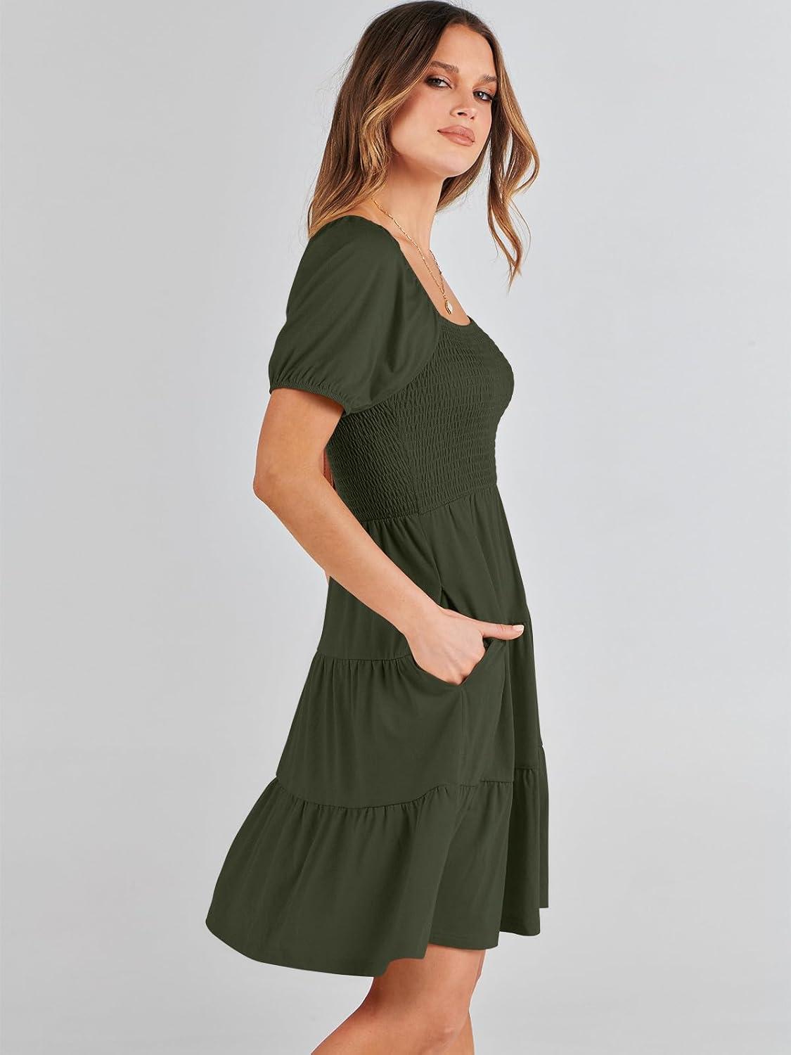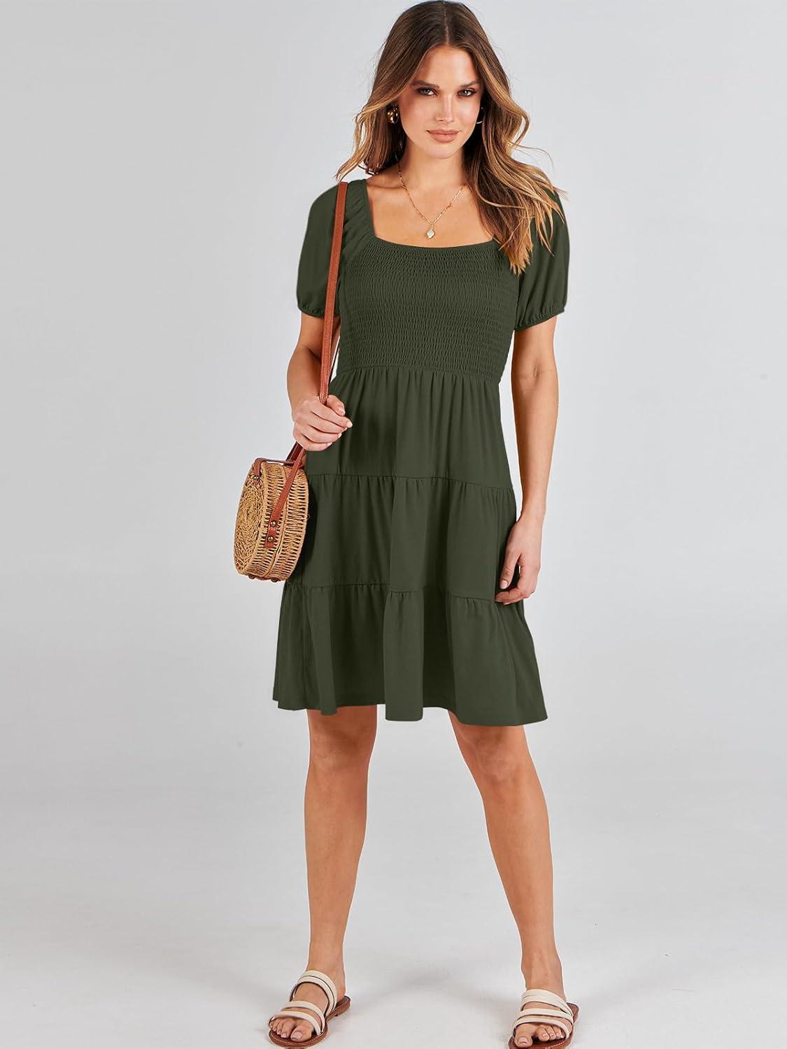 ANRABESS Womens 2025 Summer Casual Dress Square Neck Puff Sleeve Boho Beach Vacation Short Dress(Army Green)